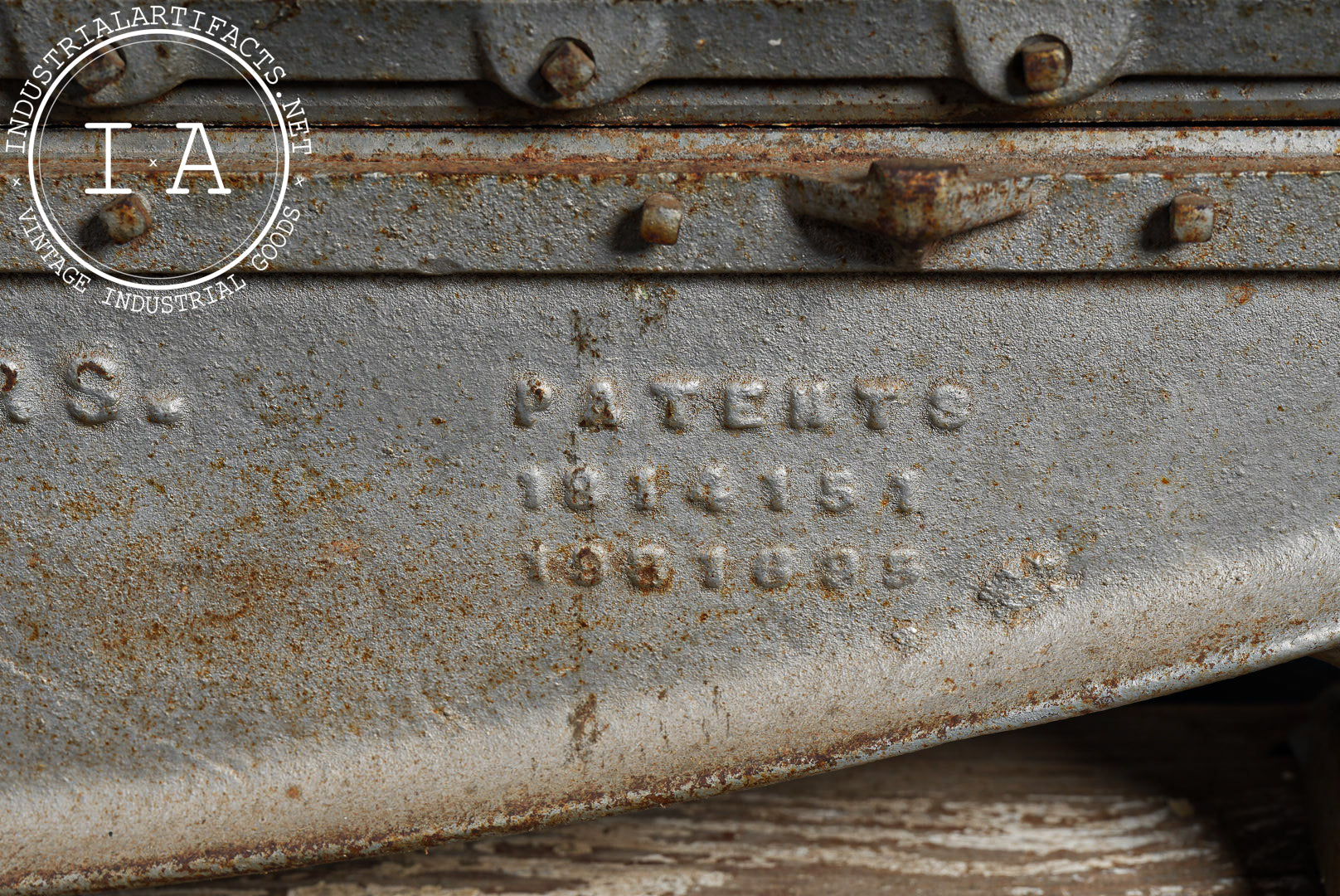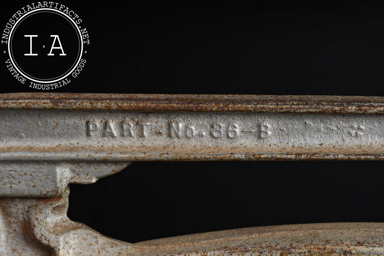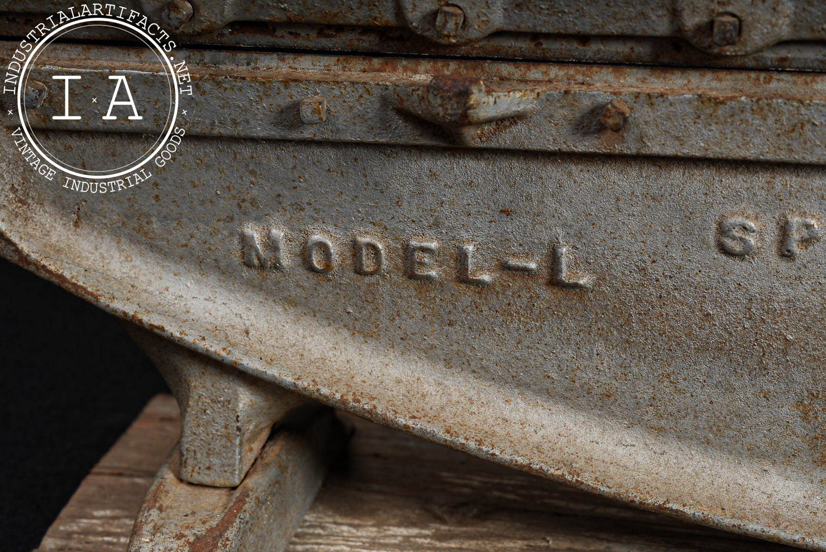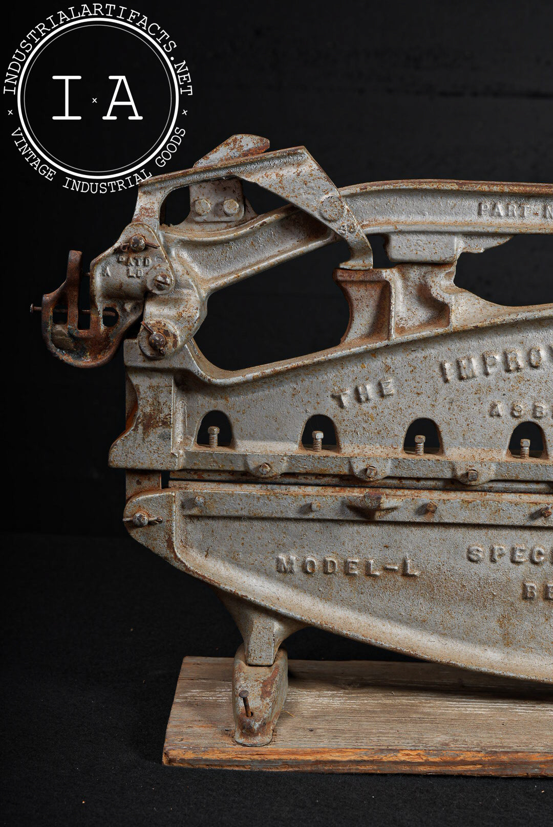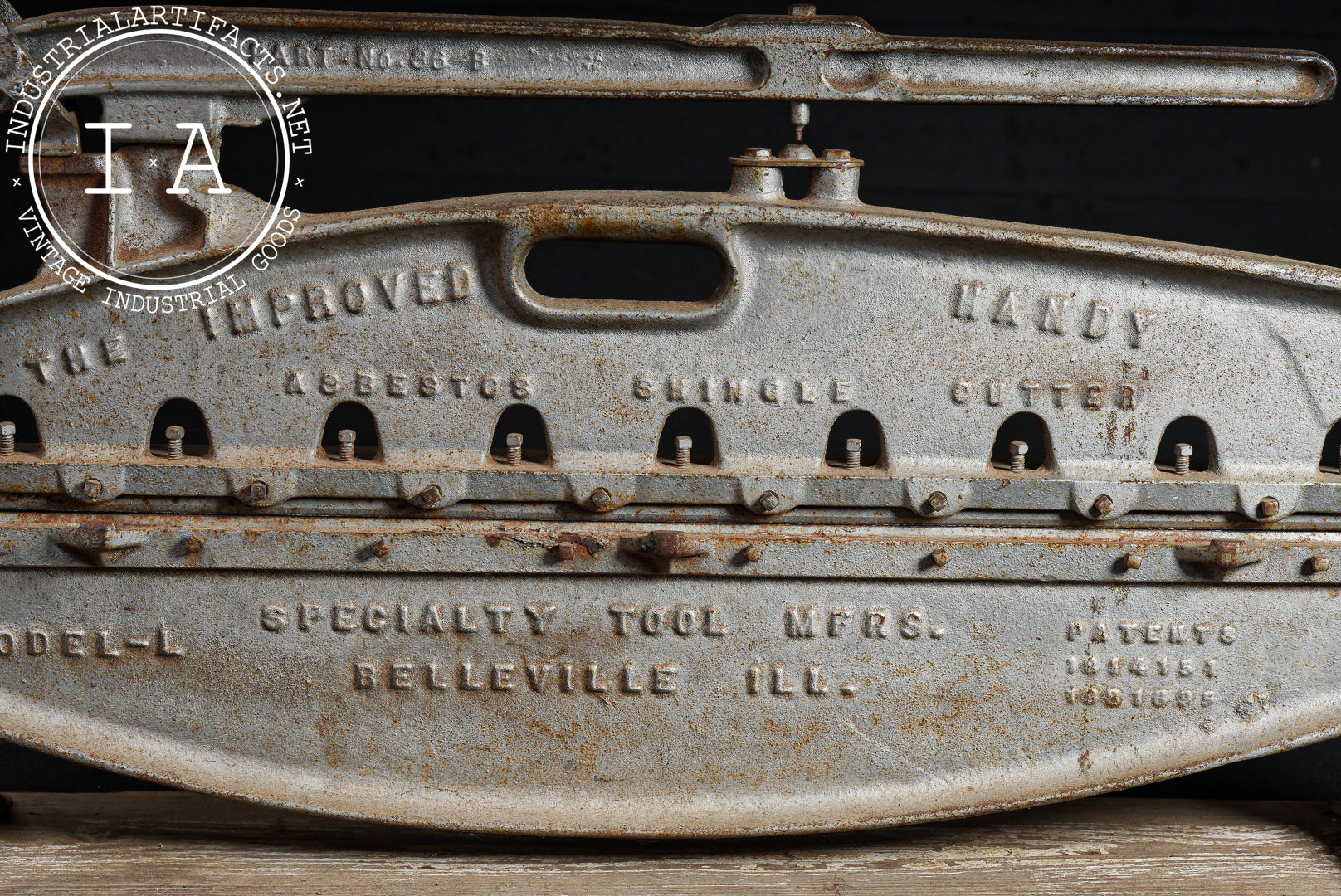 Cast-iron "Improved Handy" Model L asbestos shingle cutter manufactured by Specialty Tool MFG Co. of Belleville, Illinois. Patented in 1931 by inventor Severin N. Gundlach, this robust bench-mounted device was designed to shear asbestos-cement shingles with precision and speed.