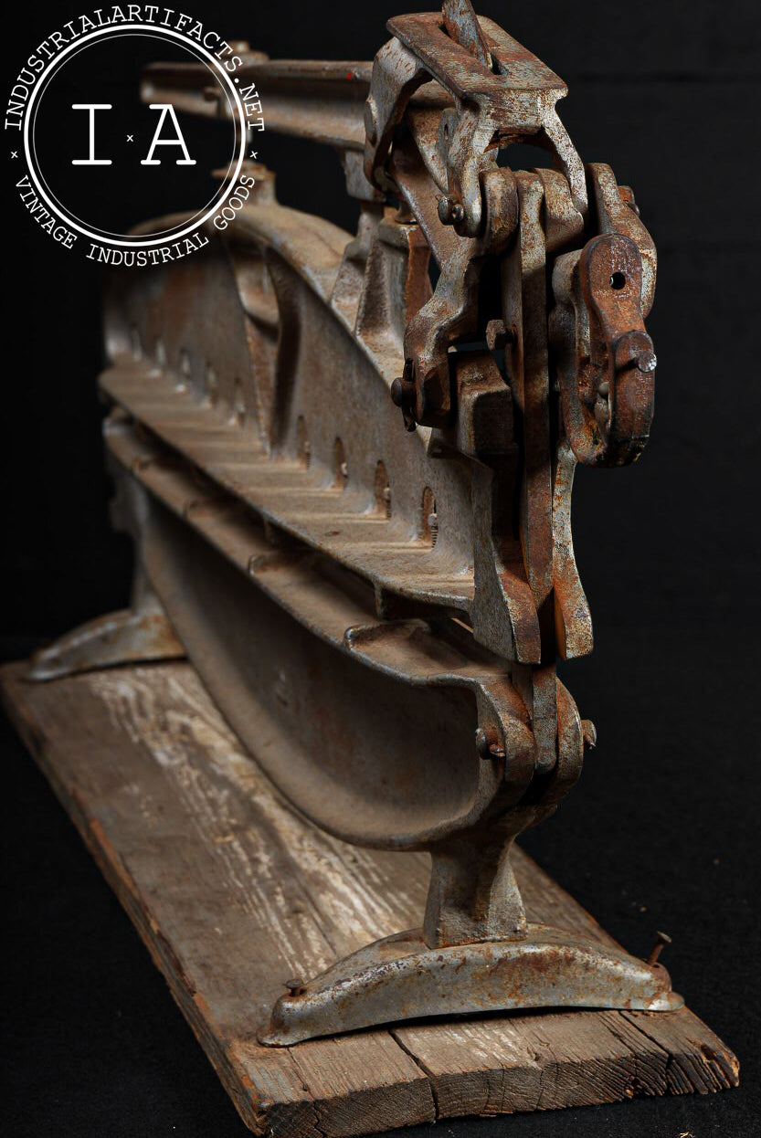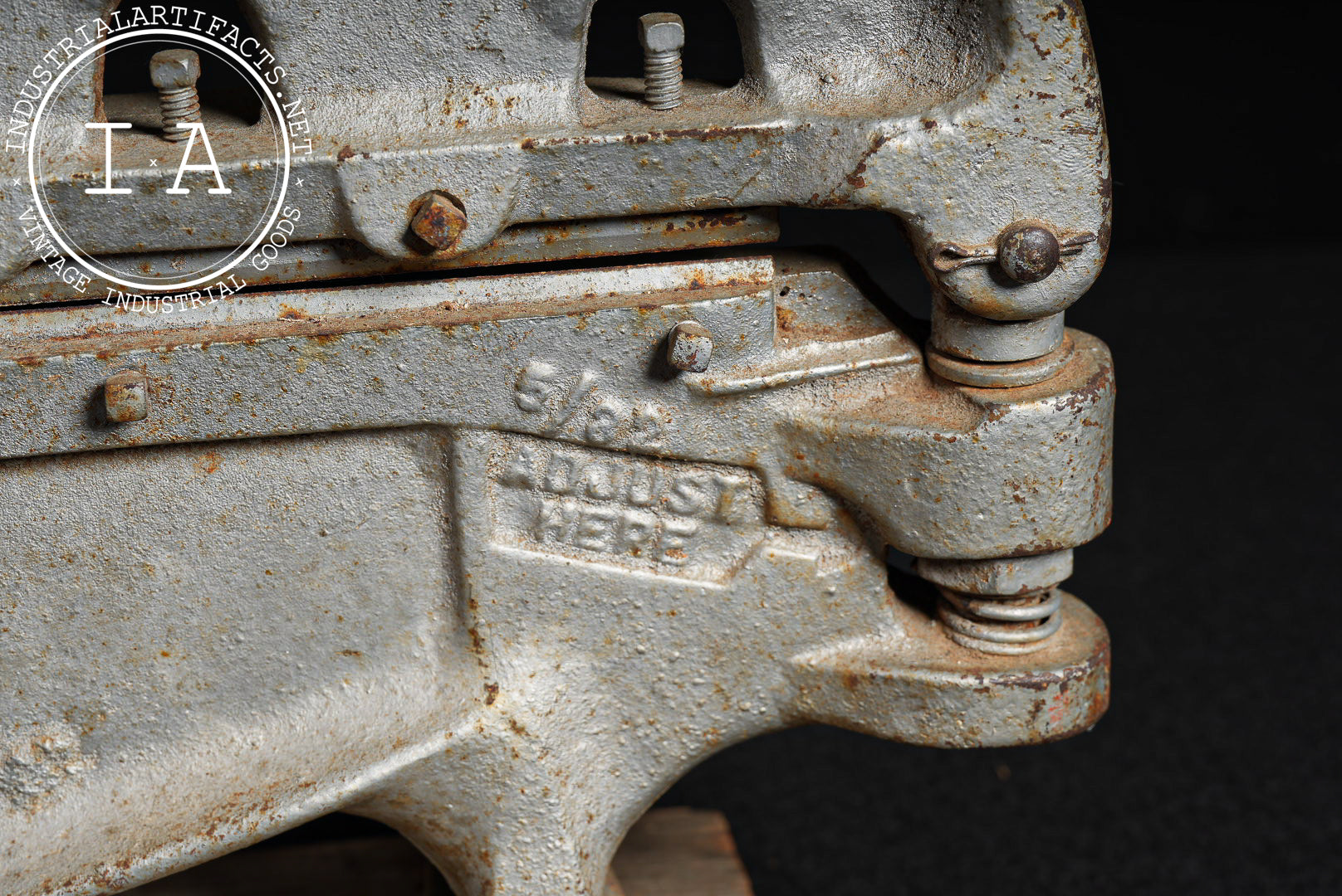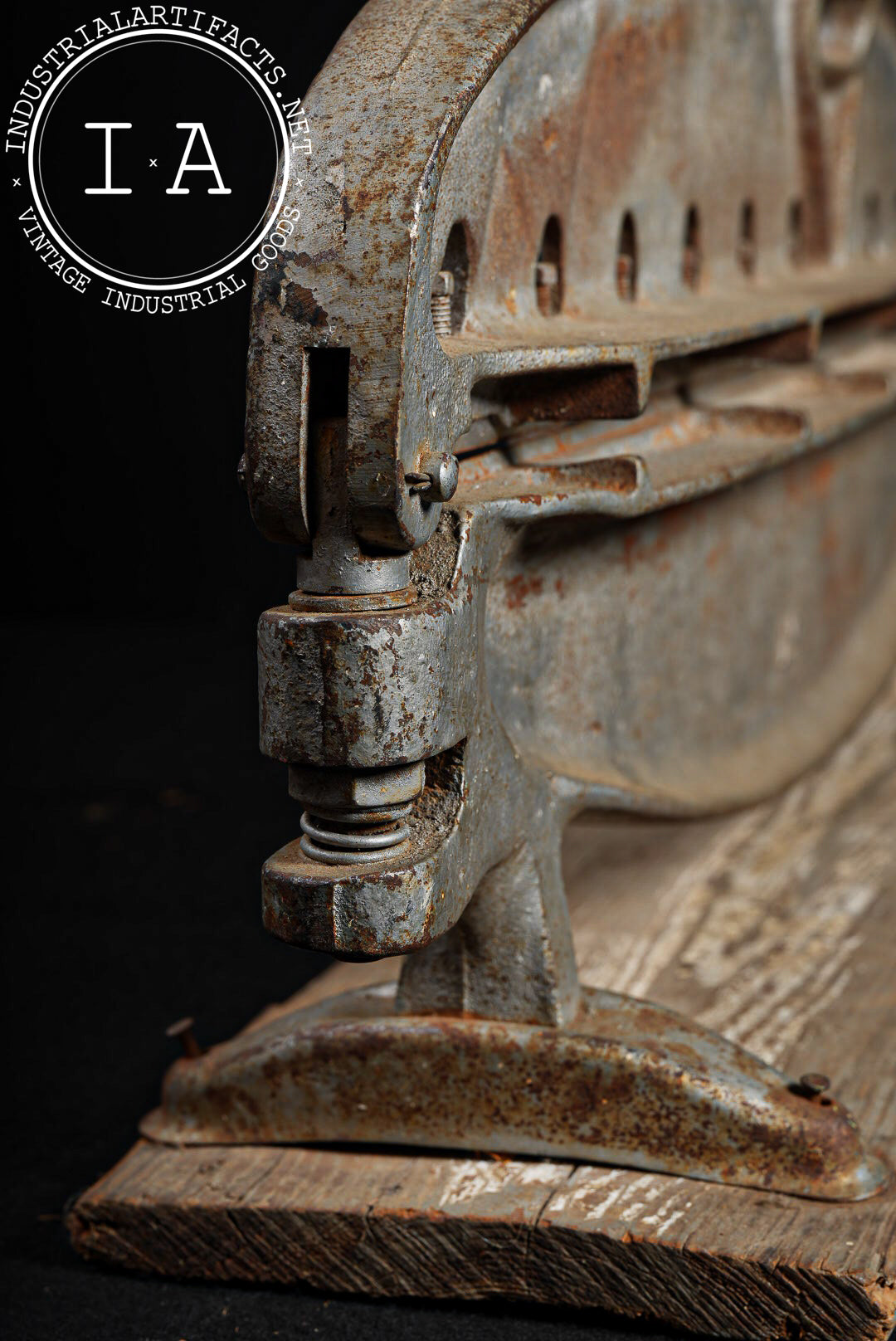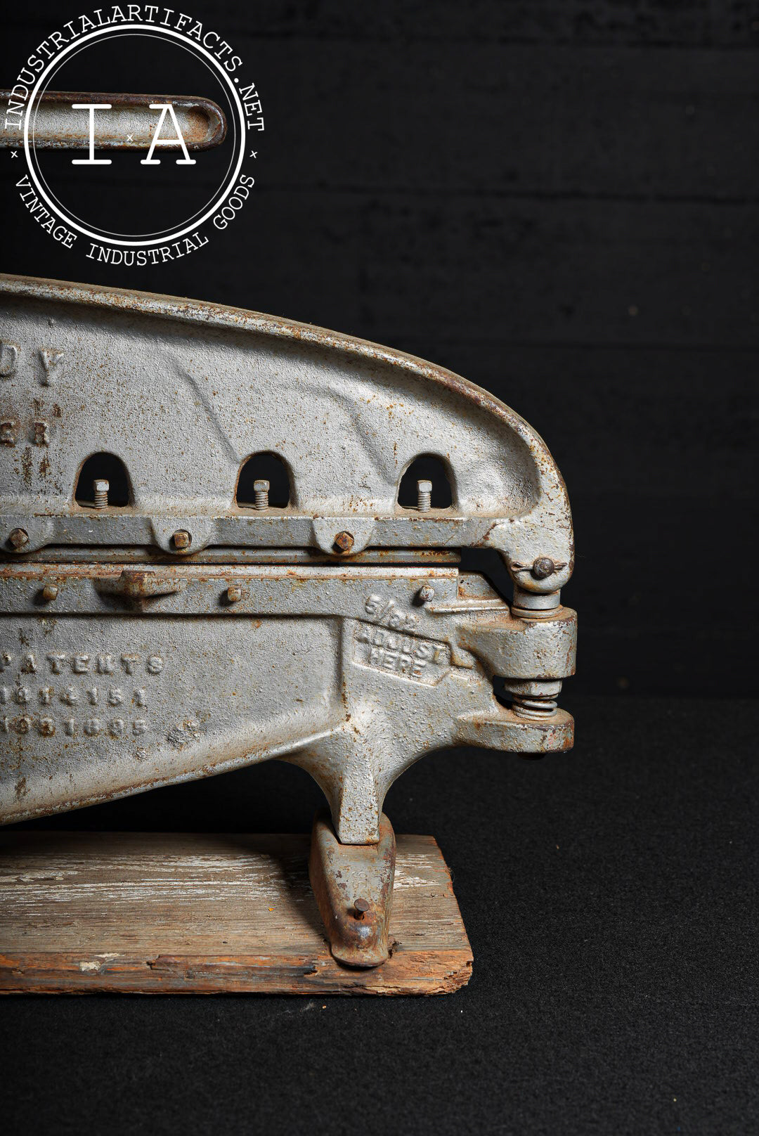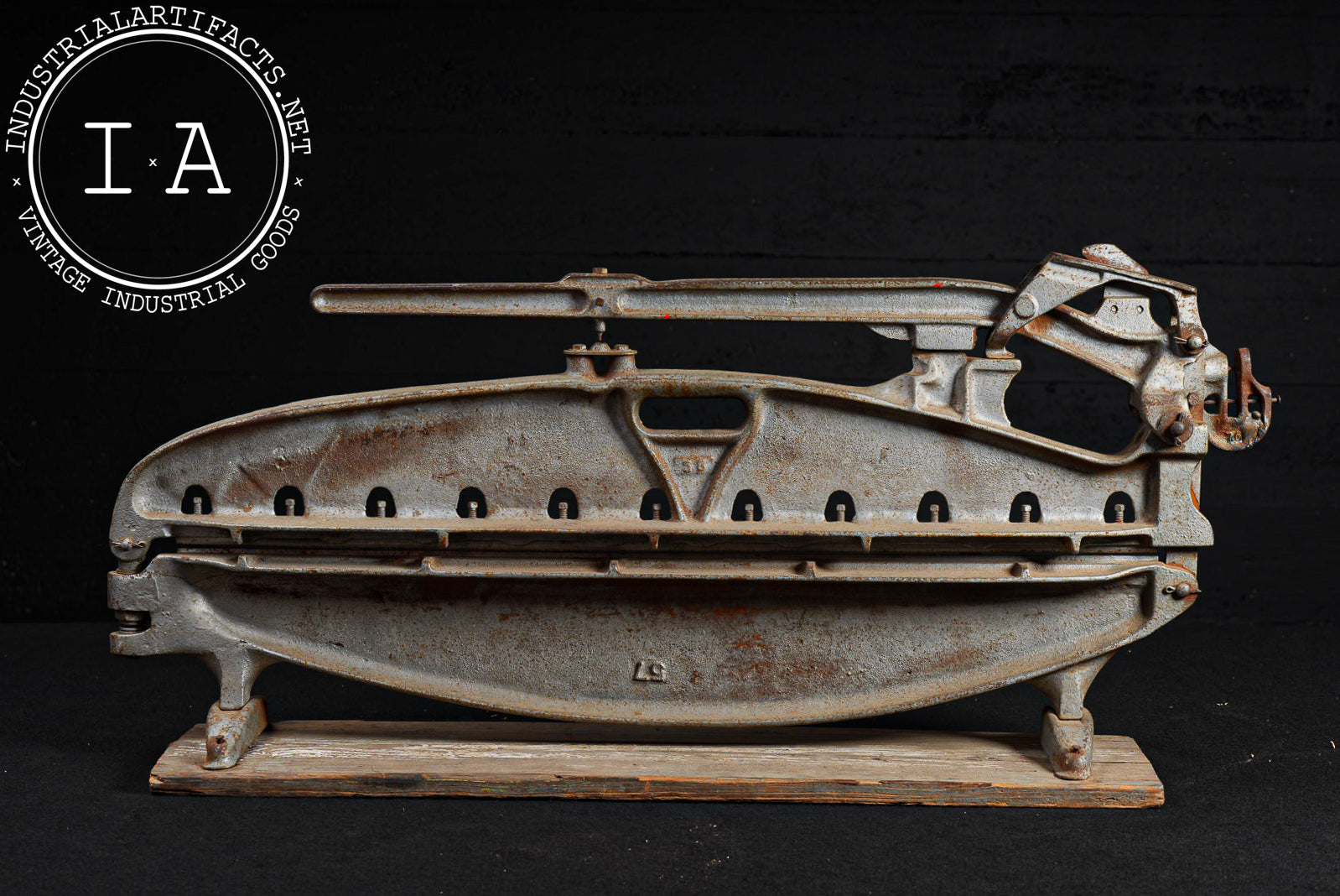 The machine features a long lever handle for mechanical advantage, a fixed cutting base with graduated openings, and cast lettering across both sides of the frame. An example of early 20th-century industrial problem-solving, it embodies the heavy-duty craftsmanship of Depression-era toolmaking.