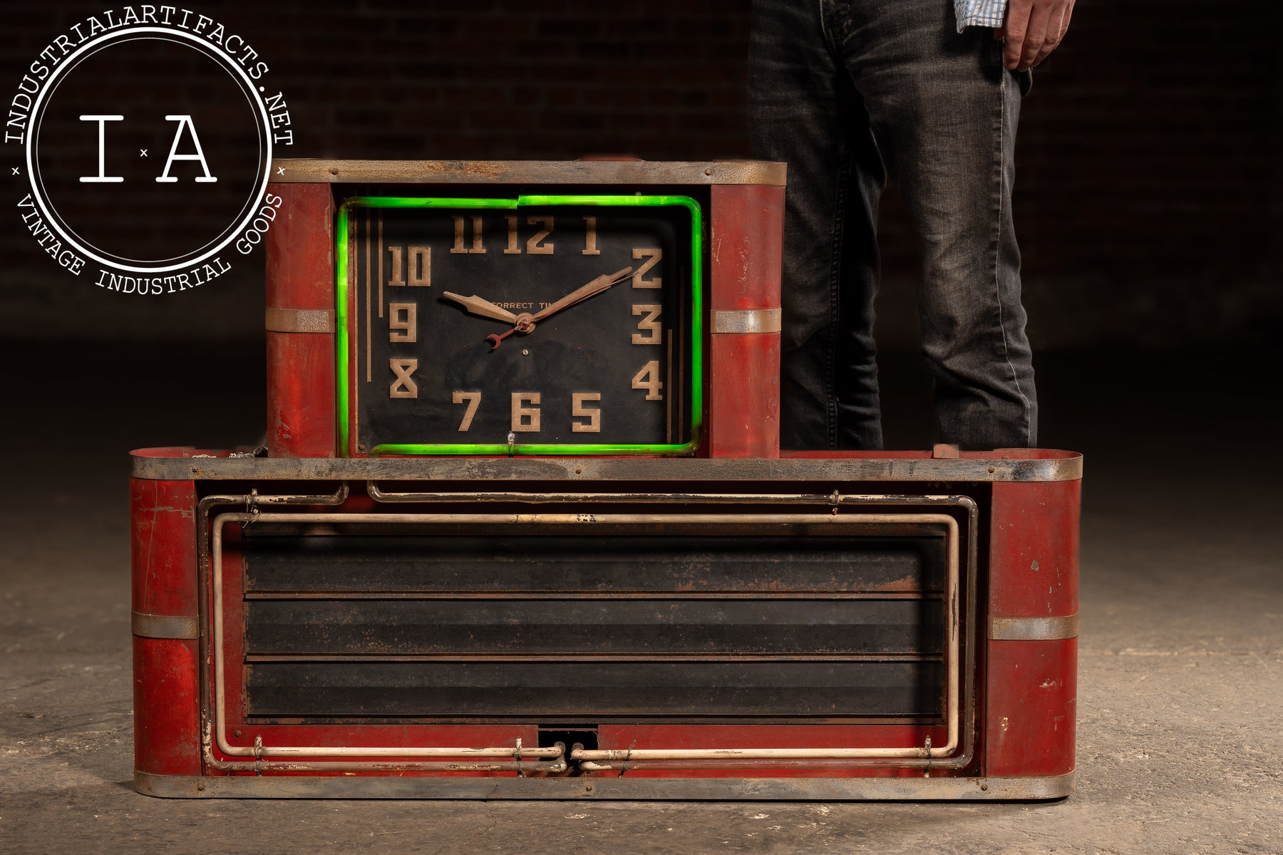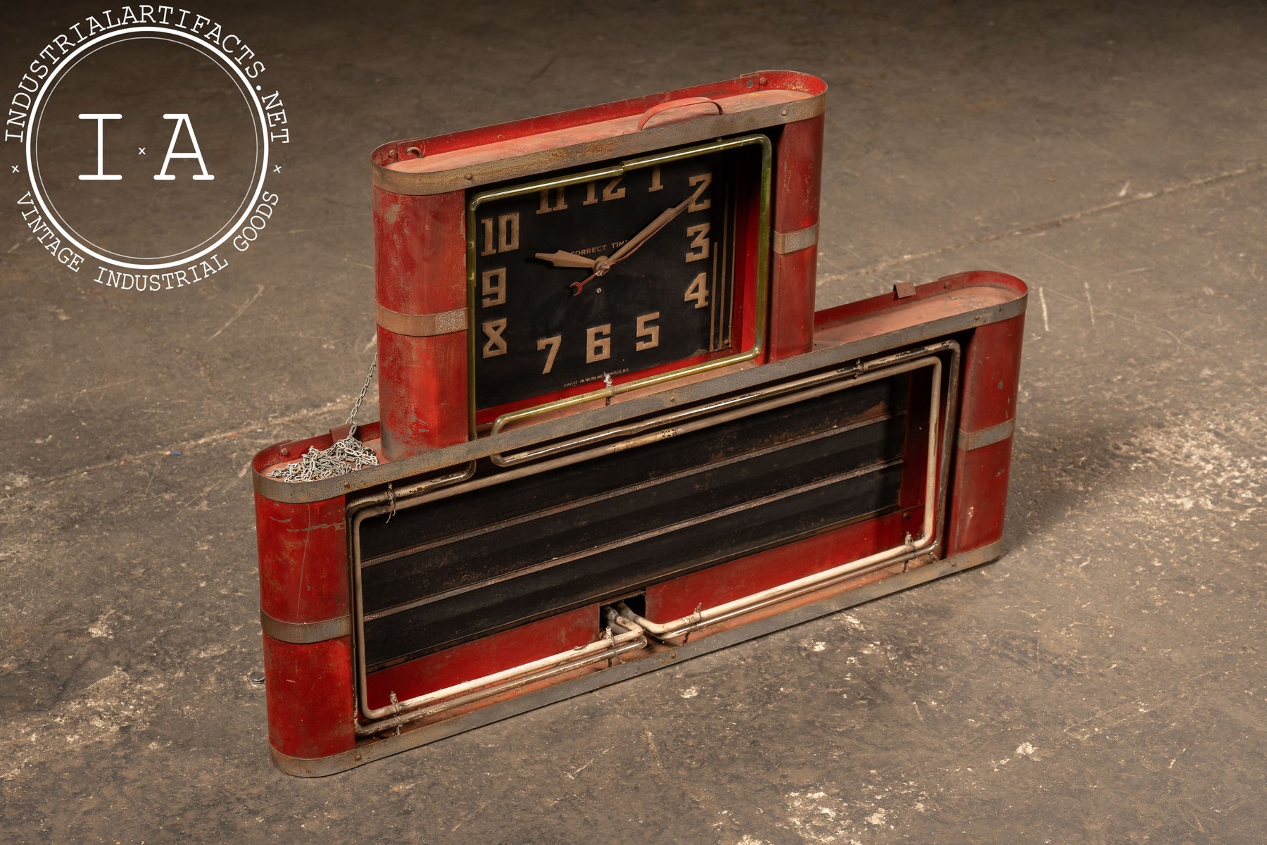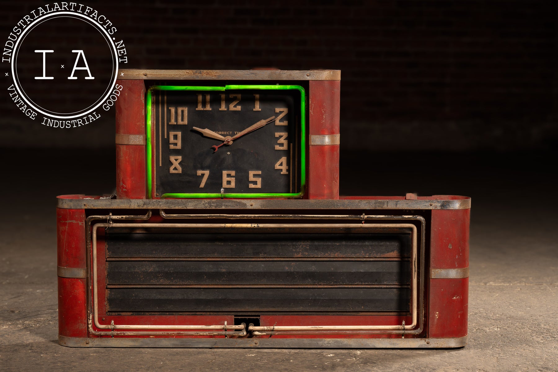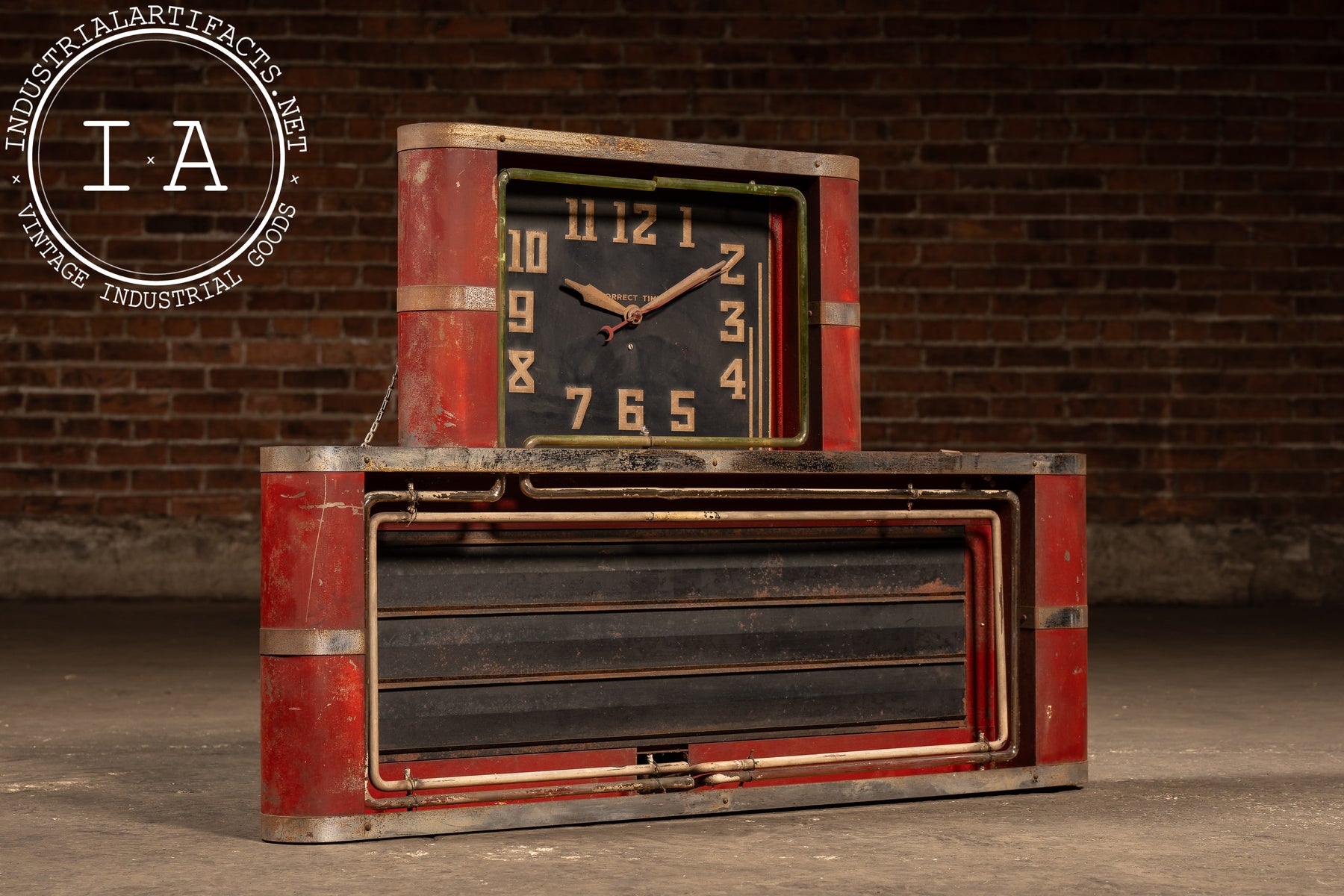 Industrial red-painted steel neon clock manufactured by the Neon Clock Sales Company of Chicago, Illinois. The upper section houses a black-faced Correct Time clock encircled by a striking uranium glass neon tube-an exceedingly rare early feature that emits a vivid green hue under UV light. The lower marquee section was designed to hold interchangeable advertising panels, framed by the original metal tubing and trim. The rear retains both the Neon Clock Sales Co. service label and the Hansen Mfg. Co. Synchron motor plate, rated for 110V.