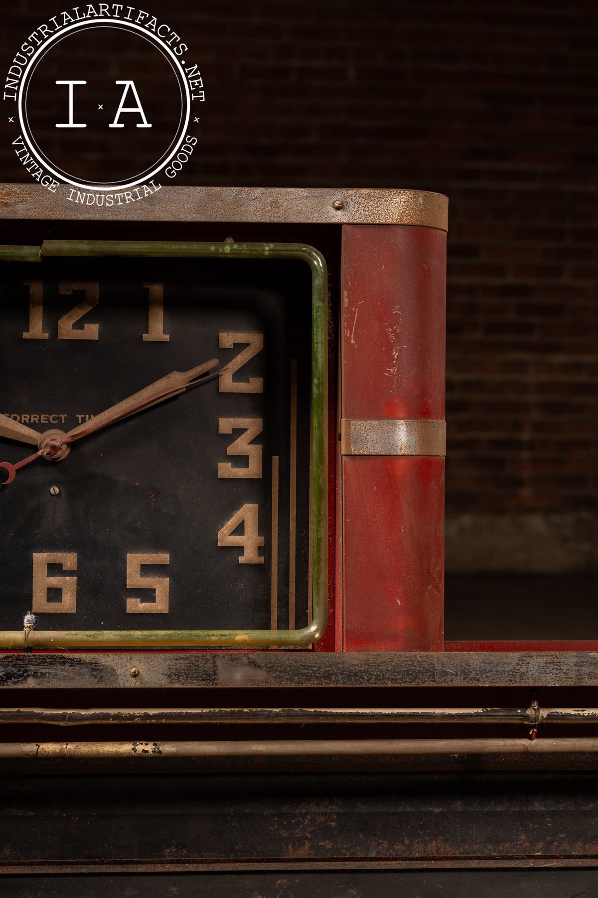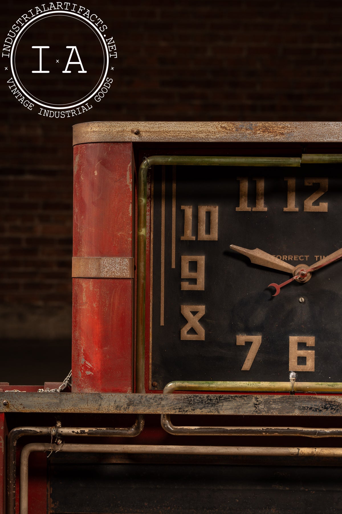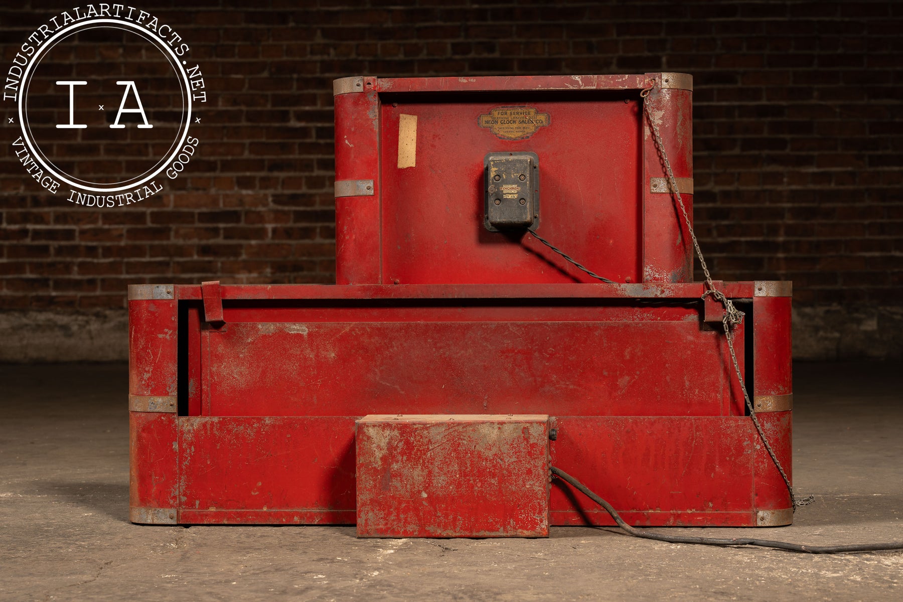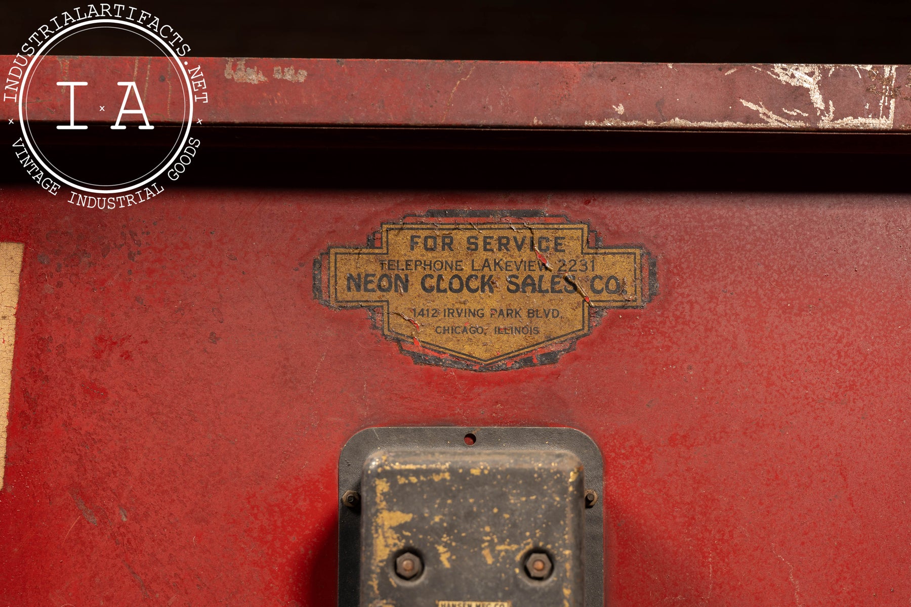 Industrial red-painted steel neon clock manufactured by the Neon Clock Sales Company of Chicago, Illinois. The upper section houses a black-faced Correct Time clock encircled by a striking uranium glass neon tube-an exceedingly rare early feature that emits a vivid green hue under UV light. The lower marquee section was designed to hold interchangeable advertising panels, framed by the original metal tubing and trim. The rear retains both the Neon Clock Sales Co. service label and the Hansen Mfg. Co. Synchron motor plate, rated for 110V.