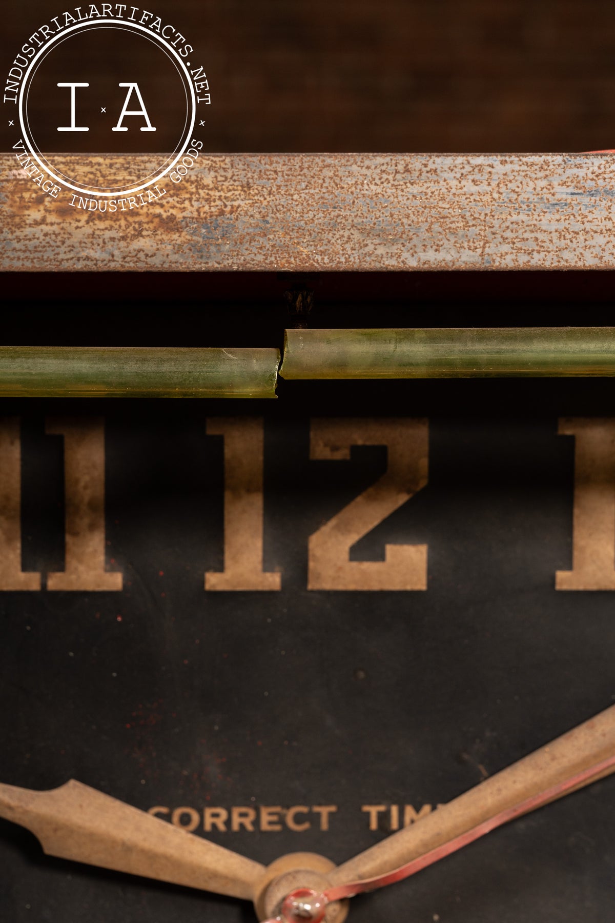 Patina and oxidation present across the surface. The uranium glass neon tube is cracked and nonfunctional. Clock motor remains intact but untested.