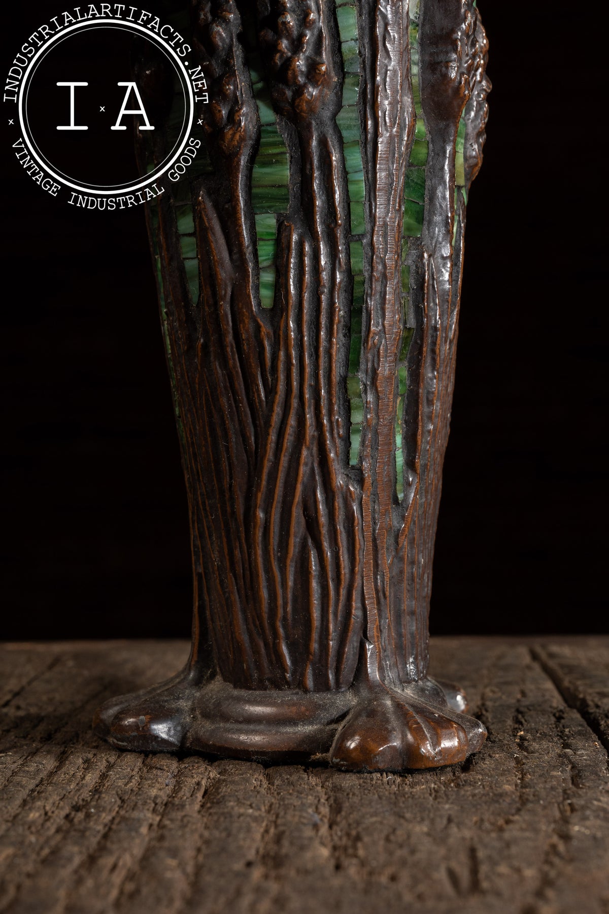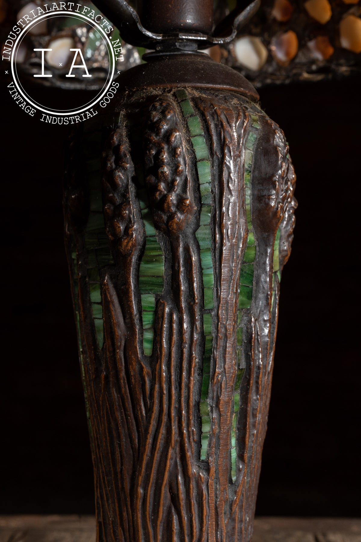 The sculpted base pairs a cast-resin trunk form with inset green glass elements, giving the piece a cohesive woodland tone from top to bottom. Vertical root-like ribbing follows the column down to a broad, organic foot. The lamp operates on a single standard socket and produces a beautifully warm, atmospheric light. This lamp base is not designed by Richard Hoosin, but pairs nicely with the shade.