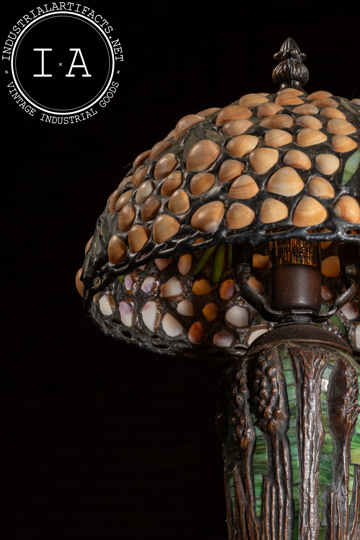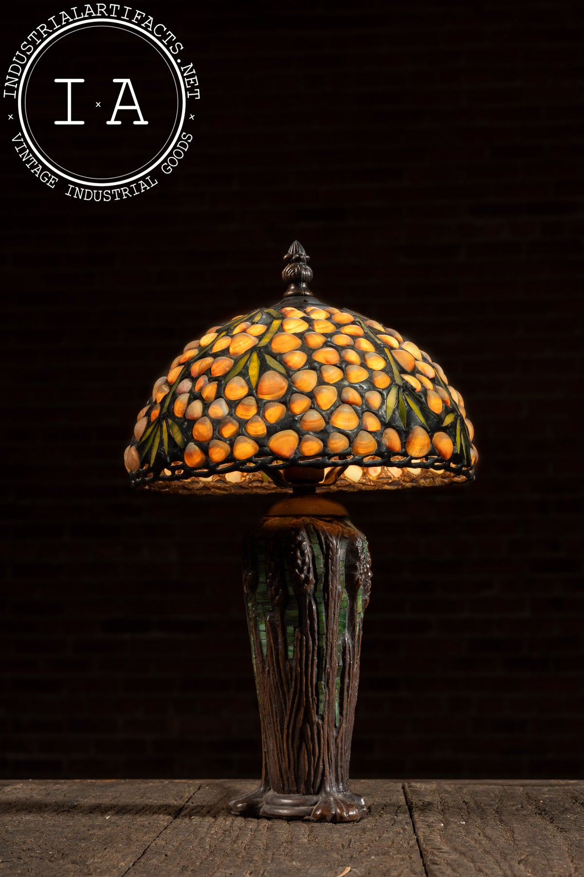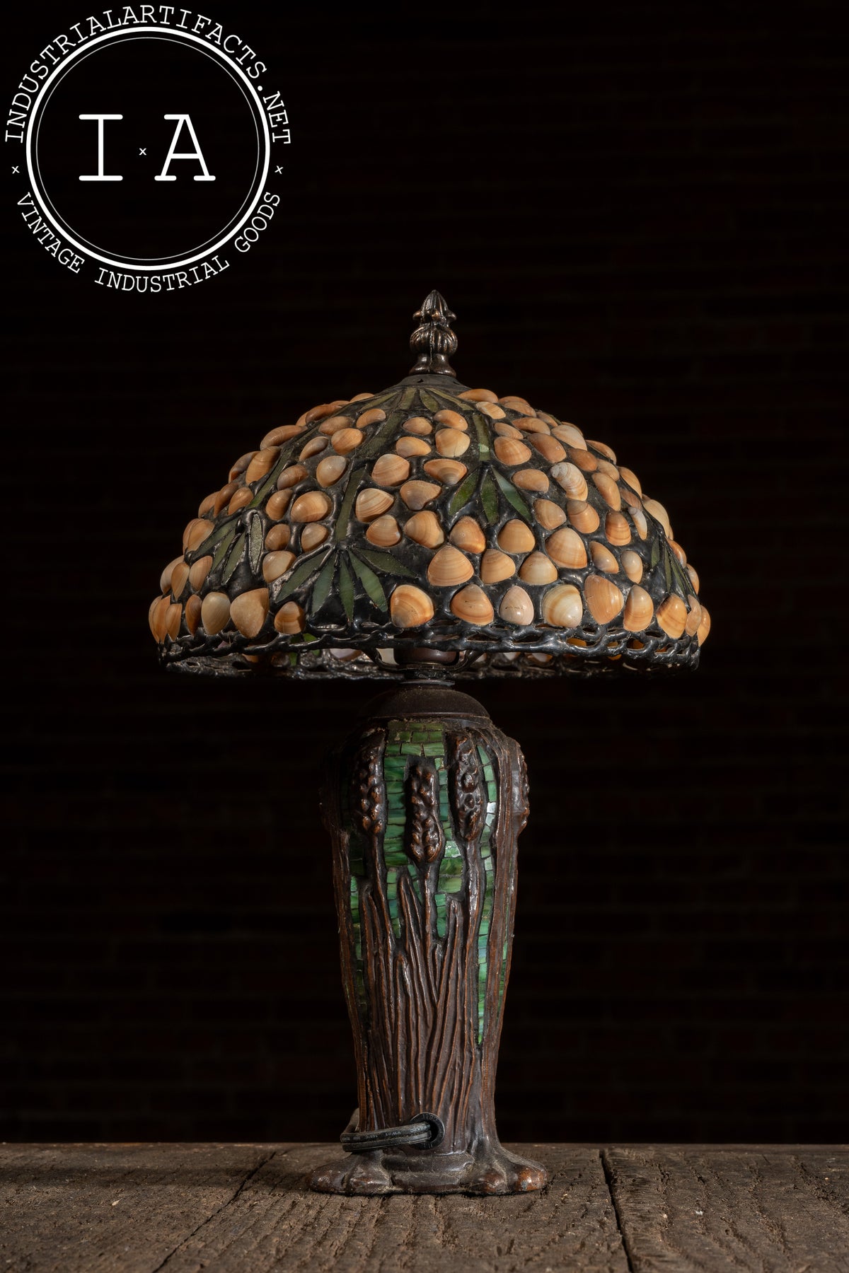 This handcrafted table lamp features a richly textured shade designed by Richard Hoosin, composed of warm amber seashells arranged in a clustered organic motif with deep green stained glass veins running throughout. The shade channels the Arts & Crafts revival aesthetic, with a dense, hand-laid leaded pattern that throws a warm, dappled glow when lit. The naturalistic palette delivers the same "forest-floor amber" character that Hoosin's studio work is known for.