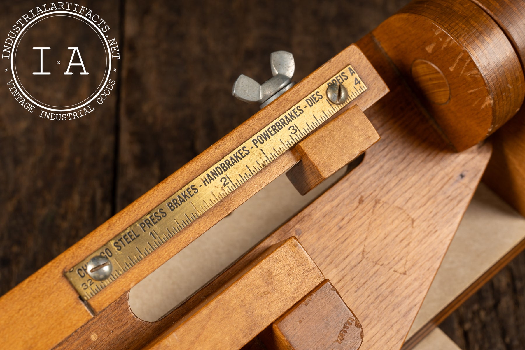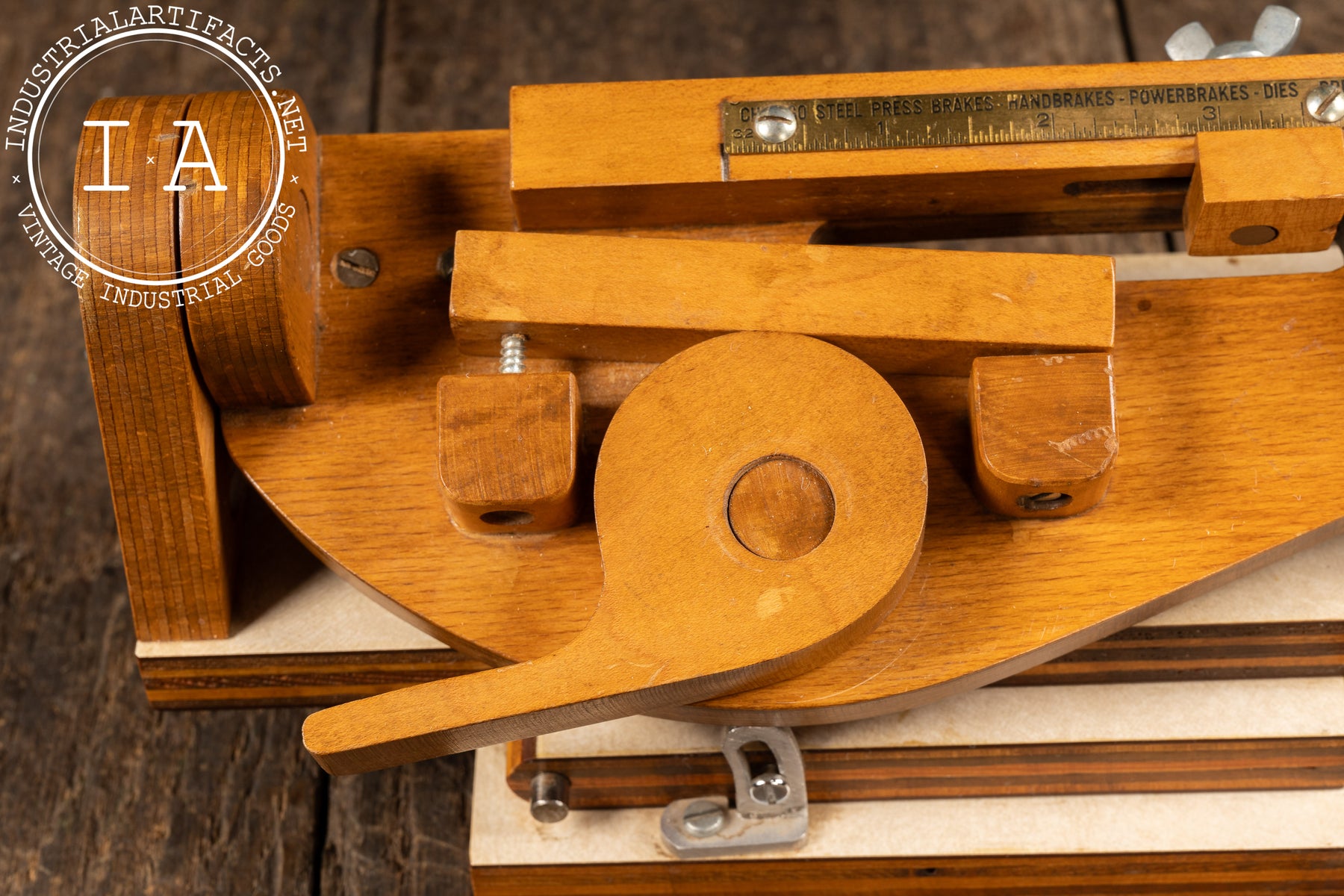 Compact, hand-built wooden demonstrator illustrating the function of a mechanical sheet metal brake press. Constructed primarily of varnished hardwood with fitted joints, pivoting levers, and a functional clamping mechanism, the model was likely designed for classroom or trade instruction. A small brass plate affixed to the top reads "Steel Press Brakes - Anglebends - Punchpresses - Press Brakes" alongside a scale indicator, suggesting association with a machine tool manufacturer or training supplier.