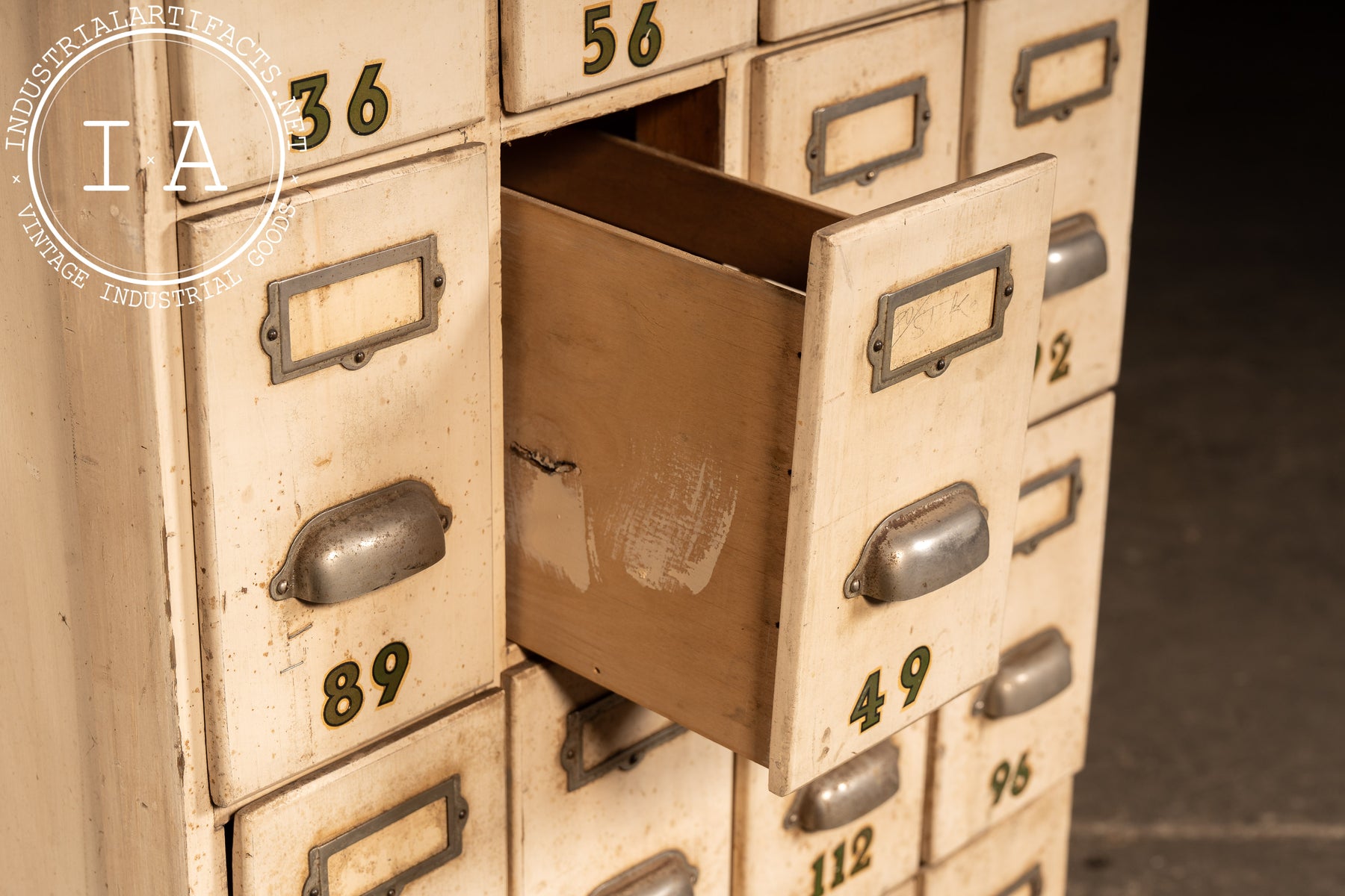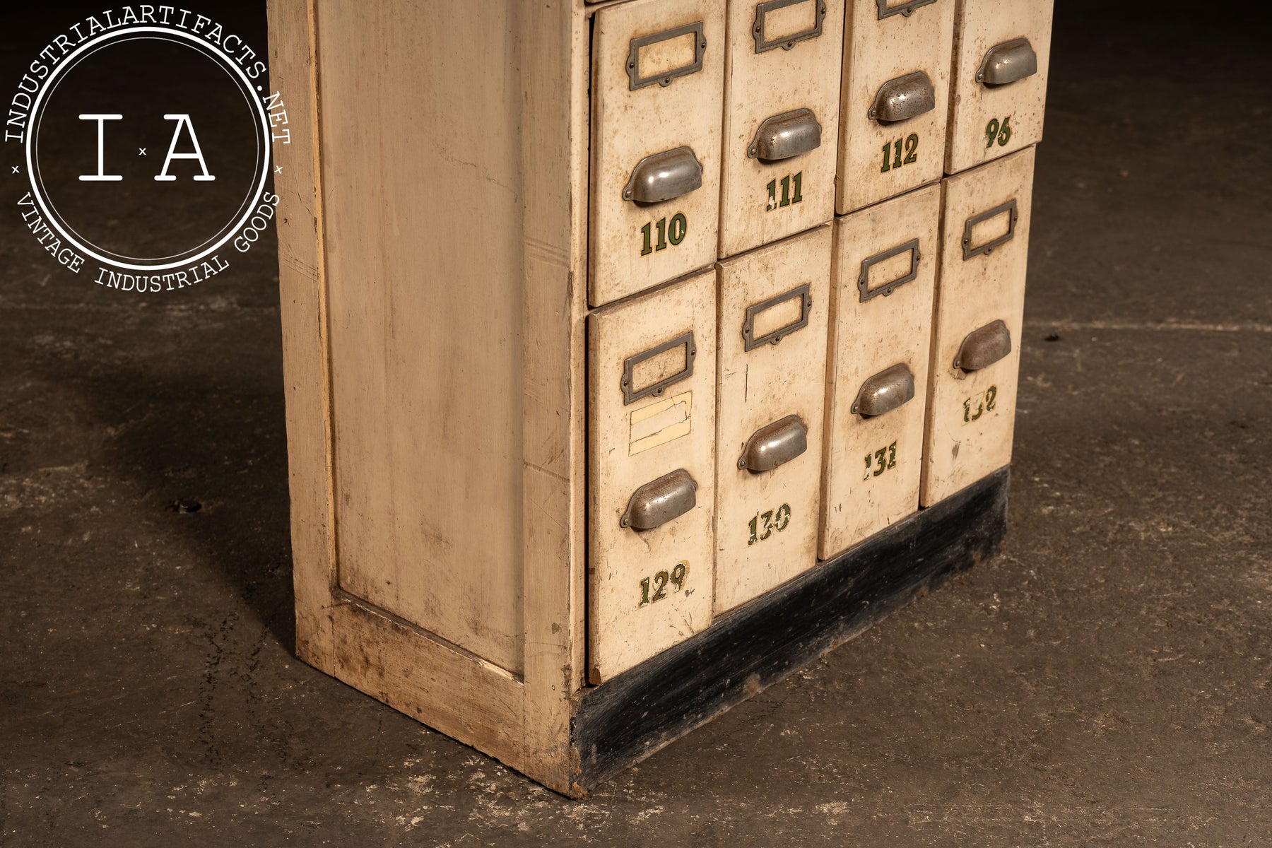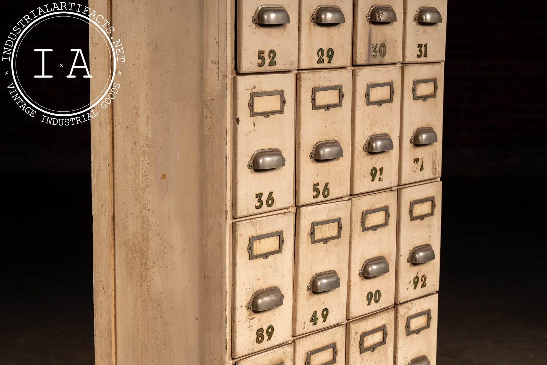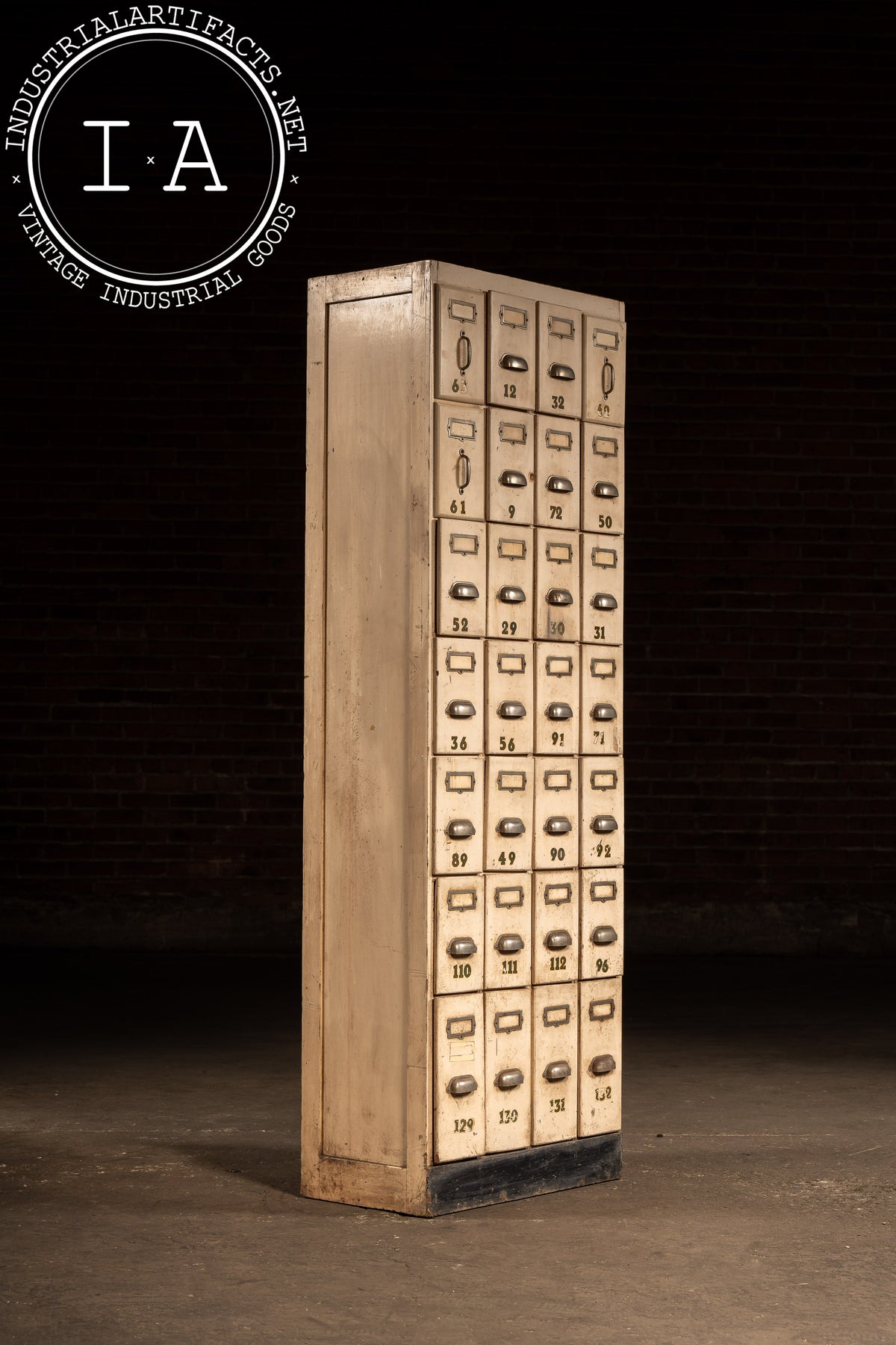 Tall, narrow ledger cabinet constructed in painted hardwood with a bank of twenty-eight small drawers arranged in a tight grid. Each drawer features an original metal pull, inset label frame, and stenciled numeric identifier, suggesting use in a commercial, institutional, or clerical setting-banks, factories, libraries, or municipal offices. The proportions are distinctly vertical, maximizing storage density while maintaining a minimal footprint. Drawer interiors are unpainted wood, showing honest wear from long-term paper storage, while the exterior retains its original light-toned paint with accumulated grime, scuffs, and handling marks that speak to daily use. A black-painted plinth base grounds the cabinet visually and structurally.