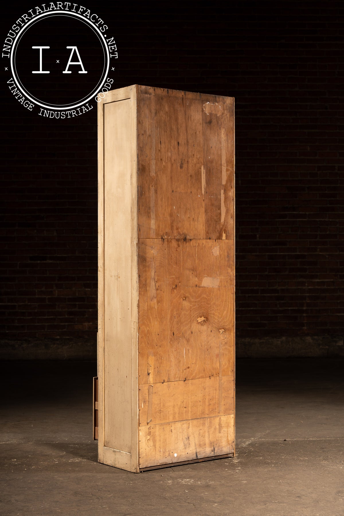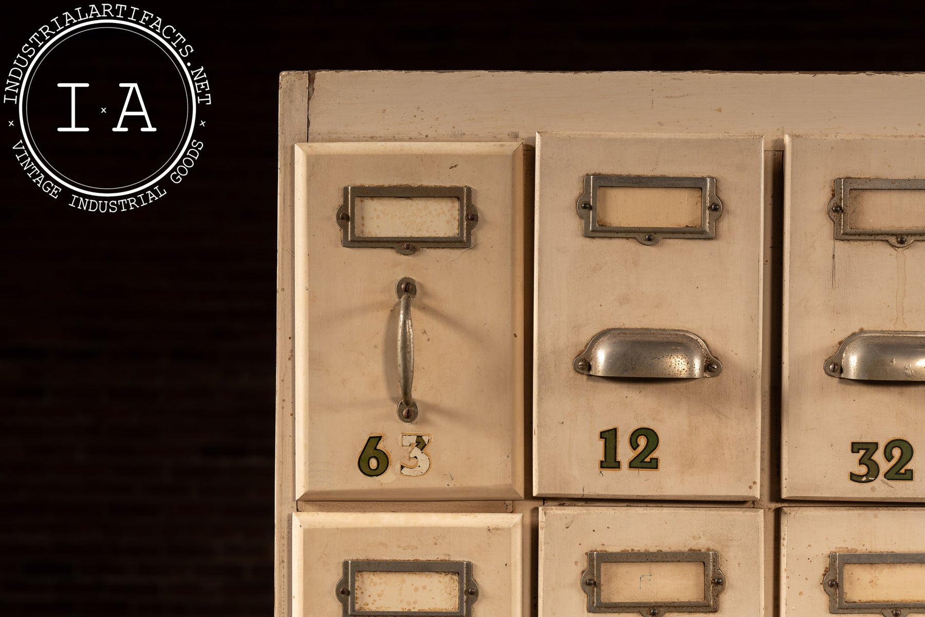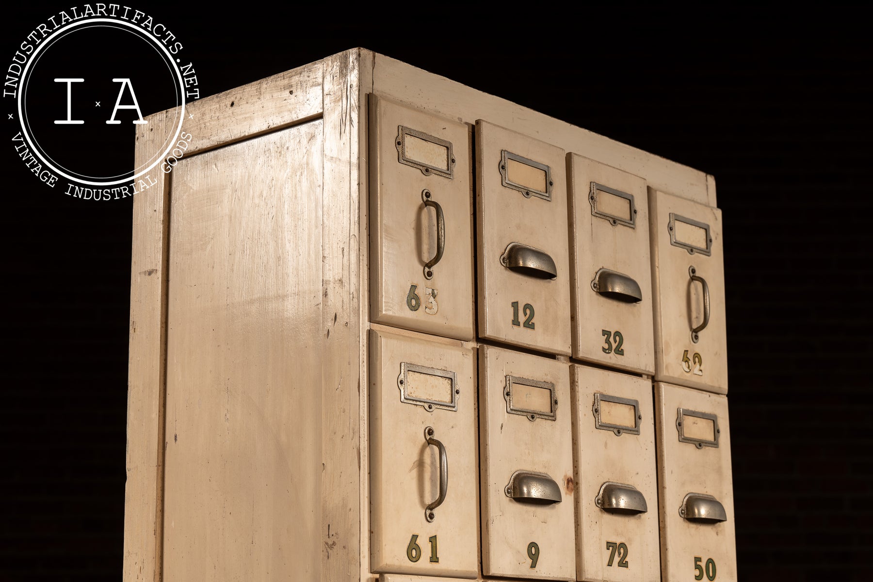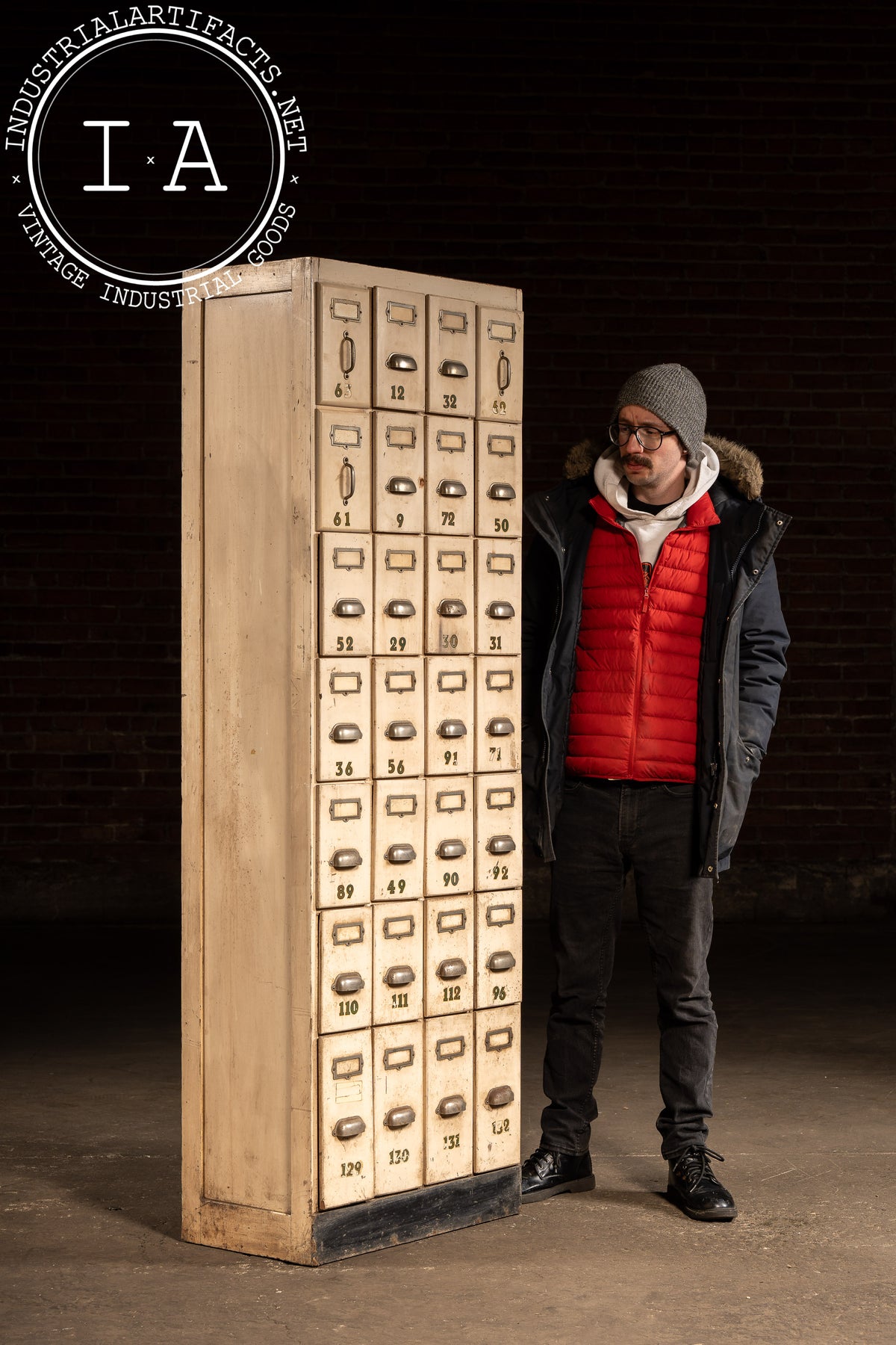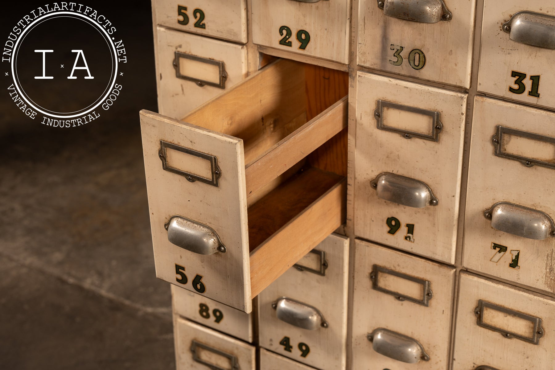Tall, narrow ledger cabinet constructed in painted hardwood with a bank of twenty-eight small drawers arranged in a tight grid. Each drawer features an original metal pull, inset label frame, and stenciled numeric identifier, suggesting use in a commercial, institutional, or clerical setting-banks, factories, libraries, or municipal offices. The proportions are distinctly vertical, maximizing storage density while maintaining a minimal footprint. Drawer interiors are unpainted wood, showing honest wear from long-term paper storage, while the exterior retains its original light-toned paint with accumulated grime, scuffs, and handling marks that speak to daily use. A black-painted plinth base grounds the cabinet visually and structurally.