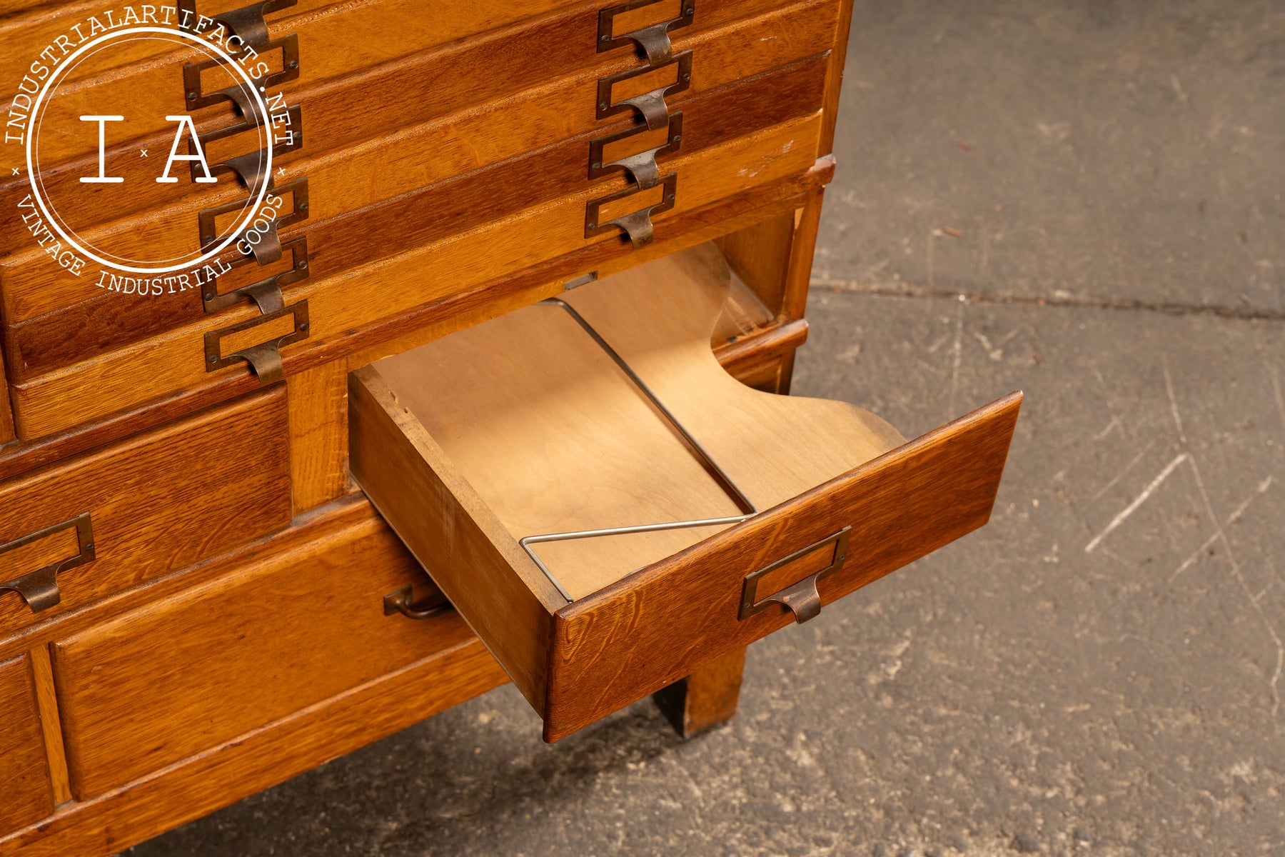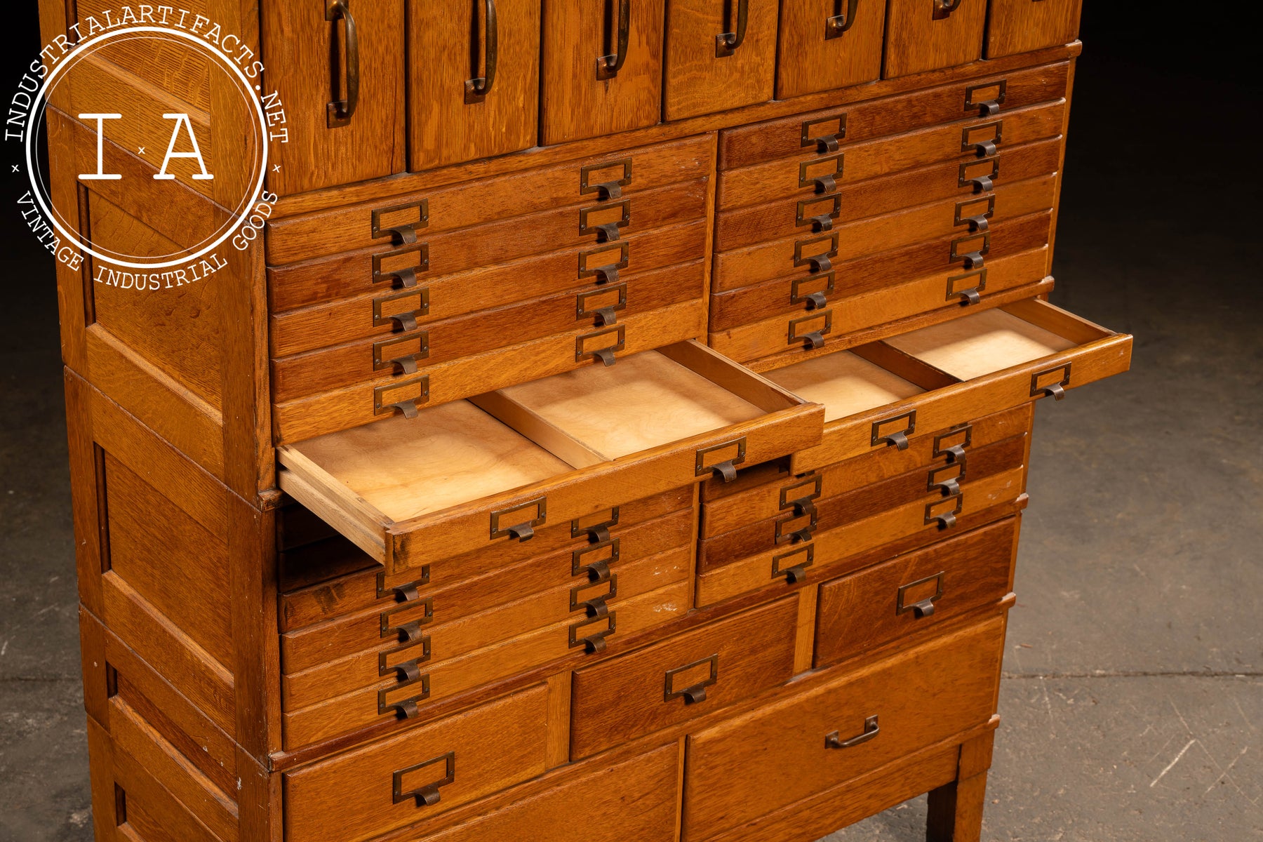 Nine-section oak catalog cabinet built in the classic modular format pioneered by Shaw-Walker-one of the Midwest's most influential early office-equipment manufacturers. This towering assembly combines multiple functional drawer types into a single, purpose-built archival unit: tall catalog compartments with metal pull-out frames, wide flat document drawers with center dividers, and deep storage drawers at the base. Matching oak panels and brass index holders unify the entire stack, giving it the crisp, rhythmic frontage characteristic of Golden Age office cabinetry.