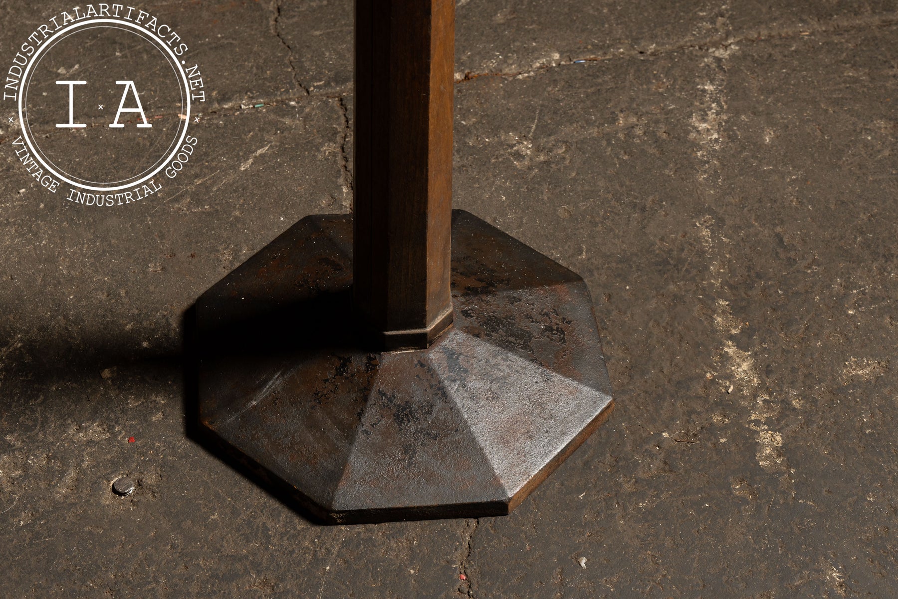 A tall oak stand fitted with a heavy iron base and a crown of cast aluminum hooks, this barbershop coat rack embodies the sturdy, no-nonsense fittings once common in early 20th-century shops. The geometric post rises cleanly from its weighted base, terminating in a cluster of robust metal arms-each with double prongs for hats, coats, and personal effects. Its design prioritizes stability and function, while the combination of wood and metal lends a professional presence suited for waiting rooms and work areas alike.