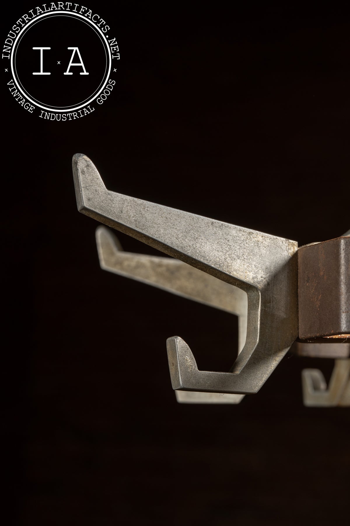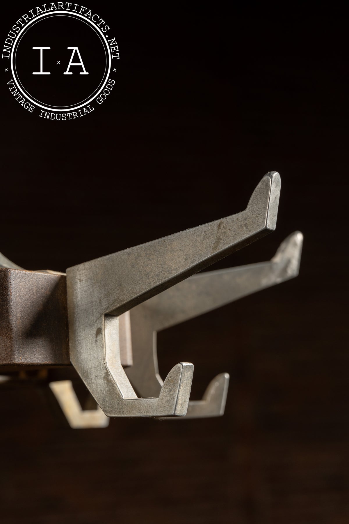 Overall condition shows expected wear from age and use, including patination to the base and hooks, surface scratches, and time-earned character in the oak finish. Solid, heavy, and purpose-built, it remains both useful and visually striking.