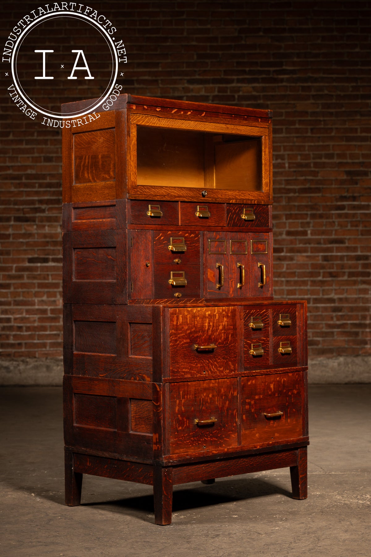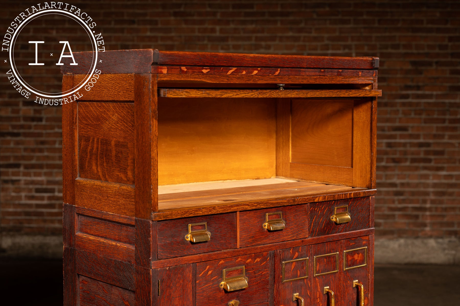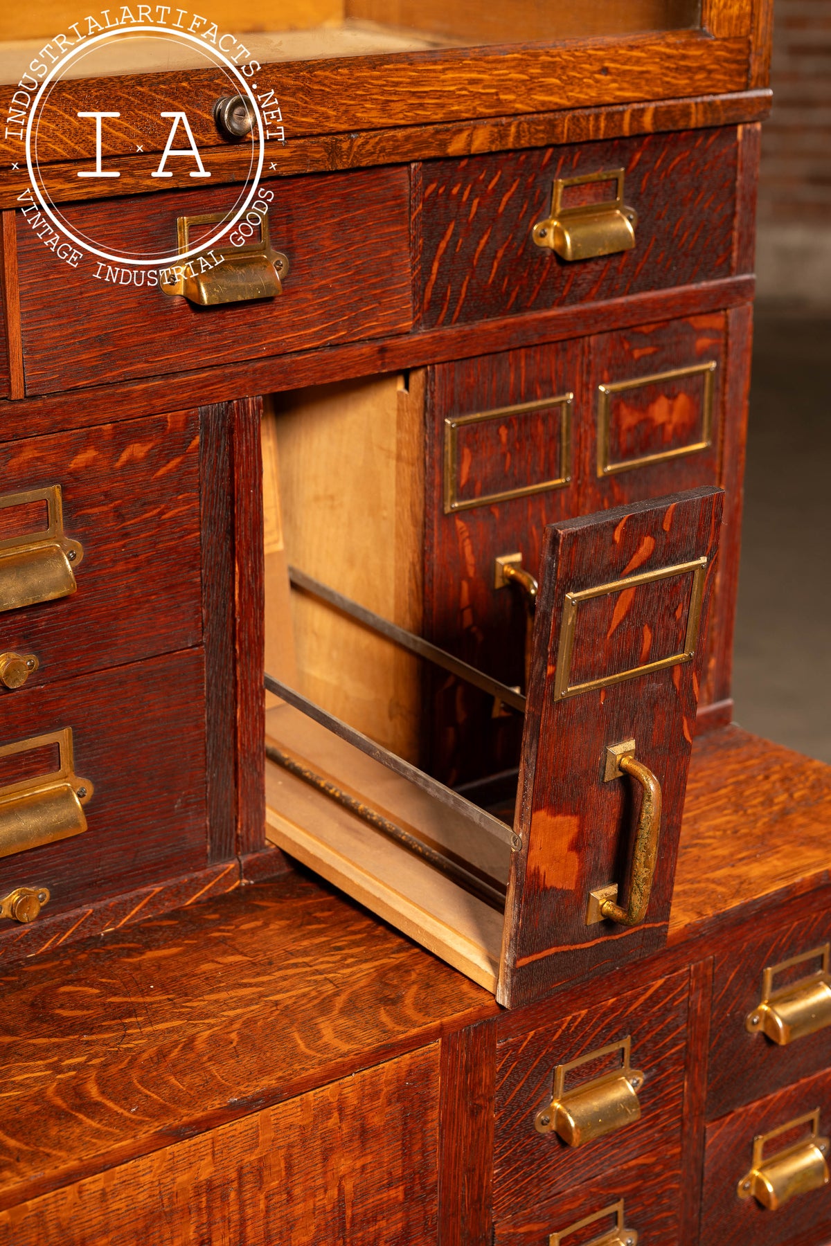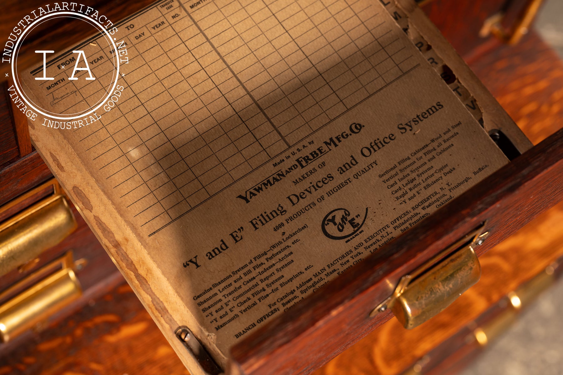 Yawman & Erbe, founded in 1897, quickly became a leader in modular office equipment and precision filing systems. Their combinations-built like architectural casework-were installed in libraries, courts, insurance houses, and corporate offices across the country, many tailored to specific clerical workflows. This example carries the hallmarks of their best work: rift- and quarter-sawn oak, dovetailed interior drawers, and the company's recognizable pressed-steel filing hardware.