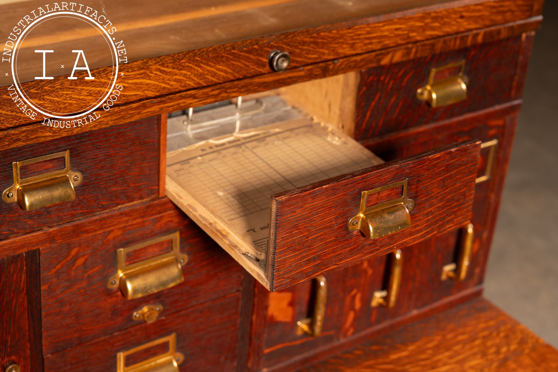 Materials: Quarter-sawn and rift-sawn oak, brass pulls and card frames, pressed-steel slides on filing drawers.