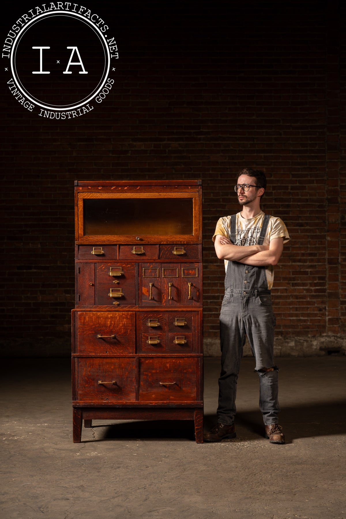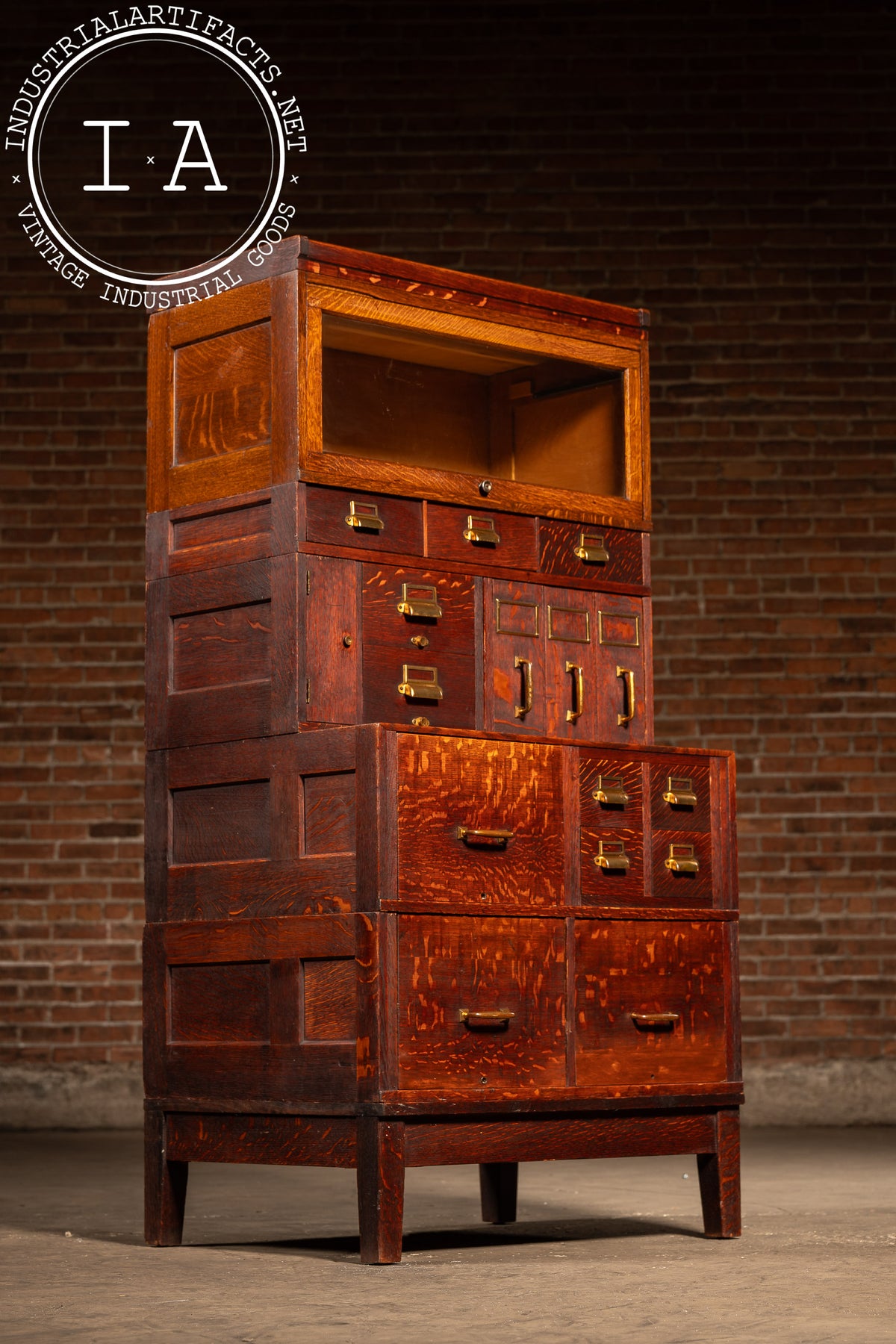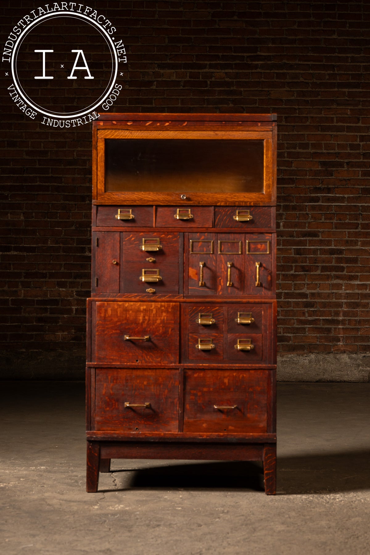 A monumental modular oak barrister cabinet by Yawman & Erbe, one of America's premier early-20th-century makers of filing systems and office furnishings. Built in stacked sections, this example combines nearly every form of filing and storage the company offered: a glass-front barrister top, small accessory drawers, letter and bill file compartments, Shannon-style index drawers, mail pulls, and full-size file drawers on pressed-steel slides. Brass pulls and card frames anchor each component, lending a unified, early-office aesthetic to an otherwise hyper-functional arrangement.