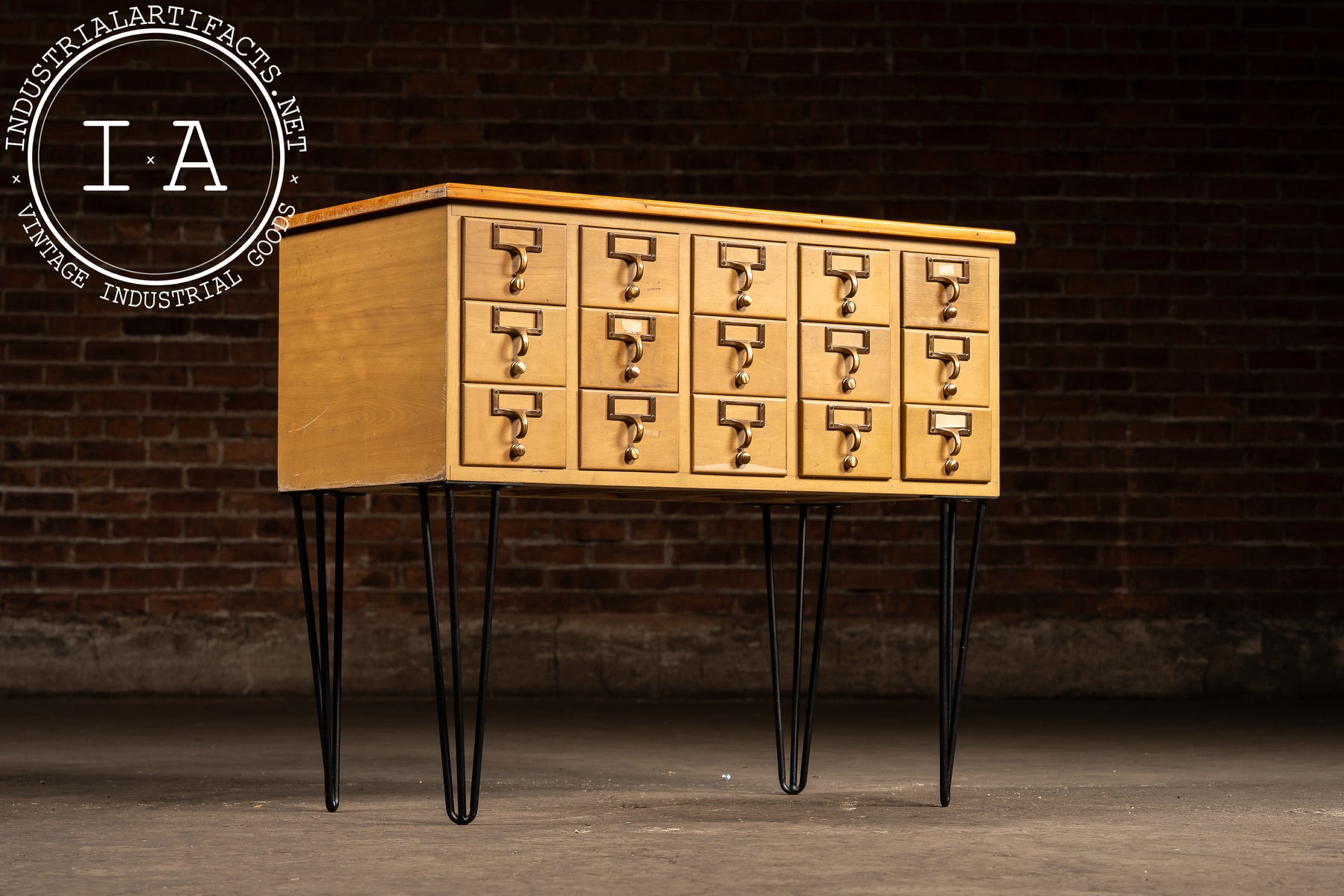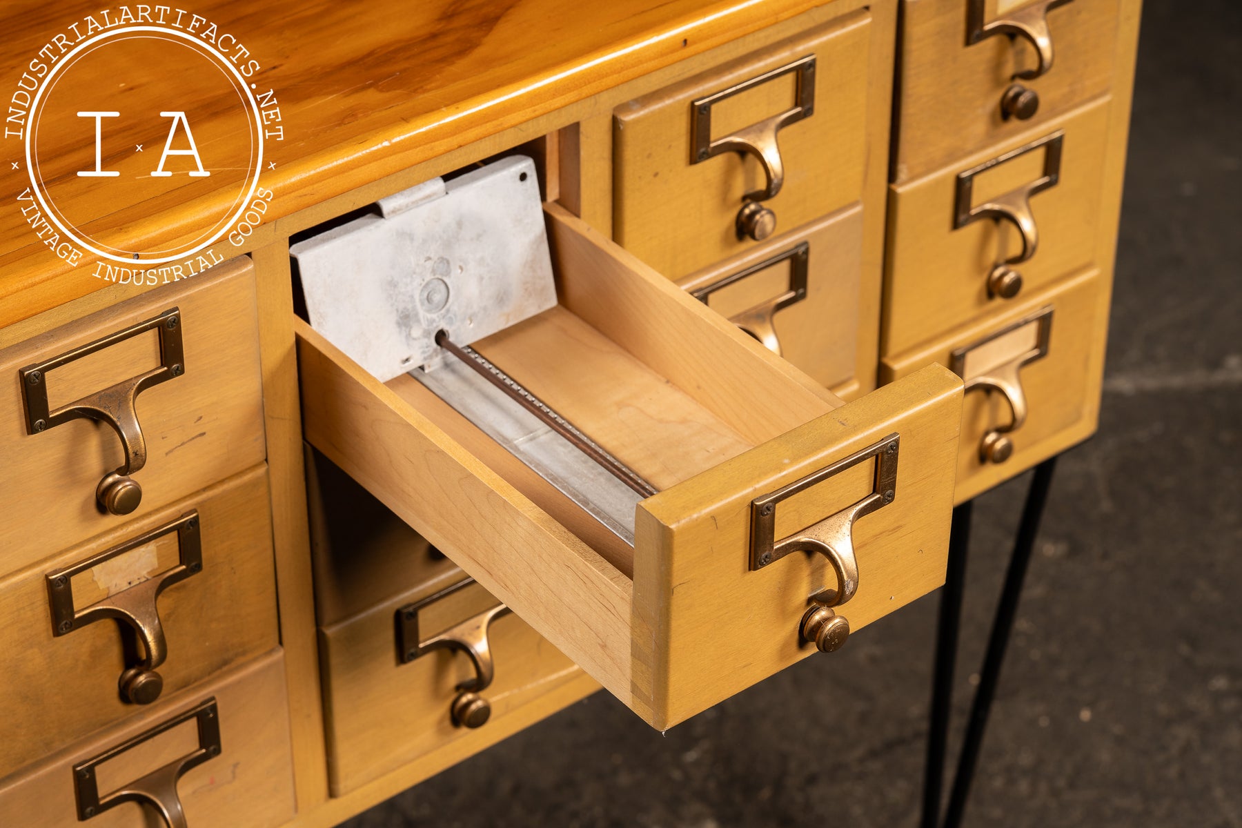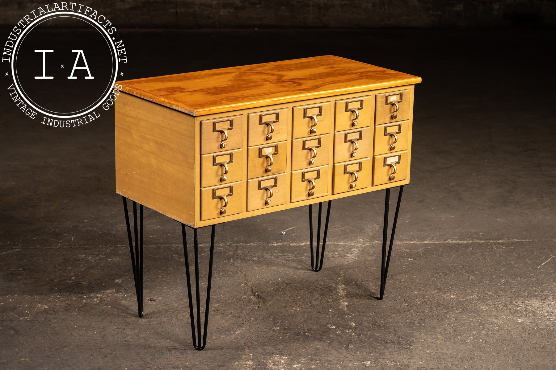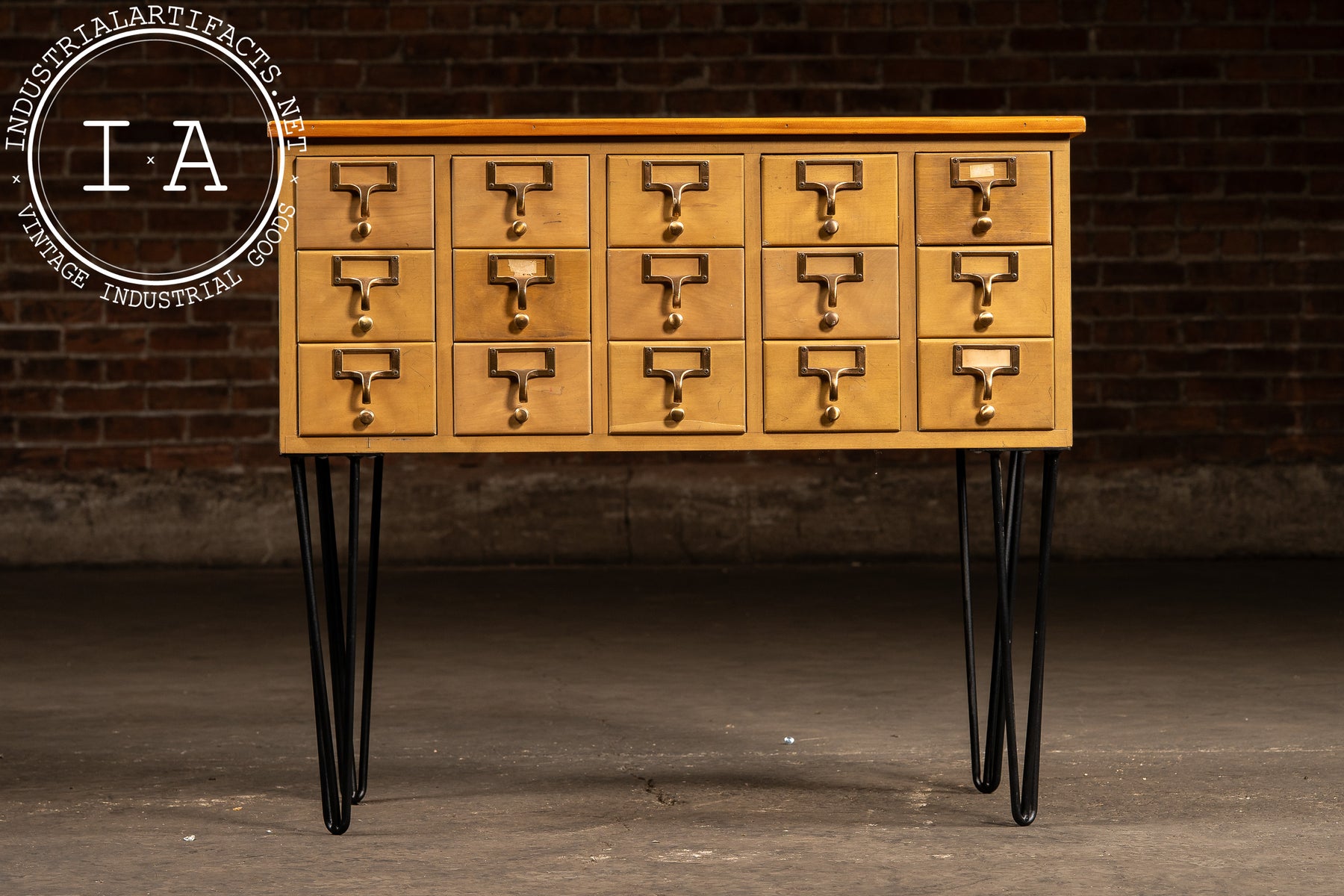 A 15-drawer maple card catalog cabinet elevated on a later set of black steel hairpin legs. Produced during the mid-century shift toward lighter, more streamlined library furniture, this cabinet reflects the practical, modular design favored by major American library-supply manufacturers. Each drawer retains its brass-plated pull with integrated label frame and internal card rails-mechanisms originally built to withstand decades of constant reference use.