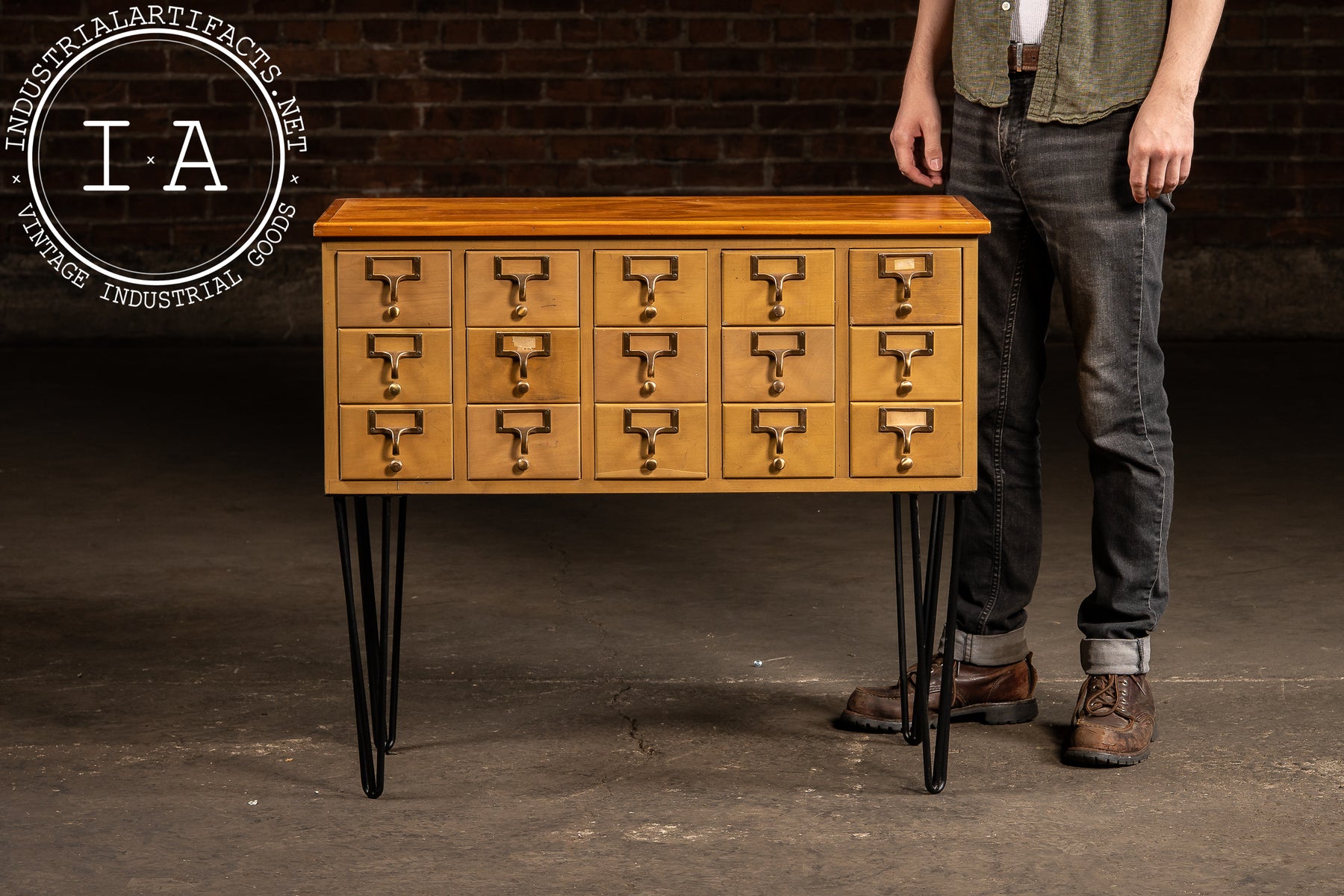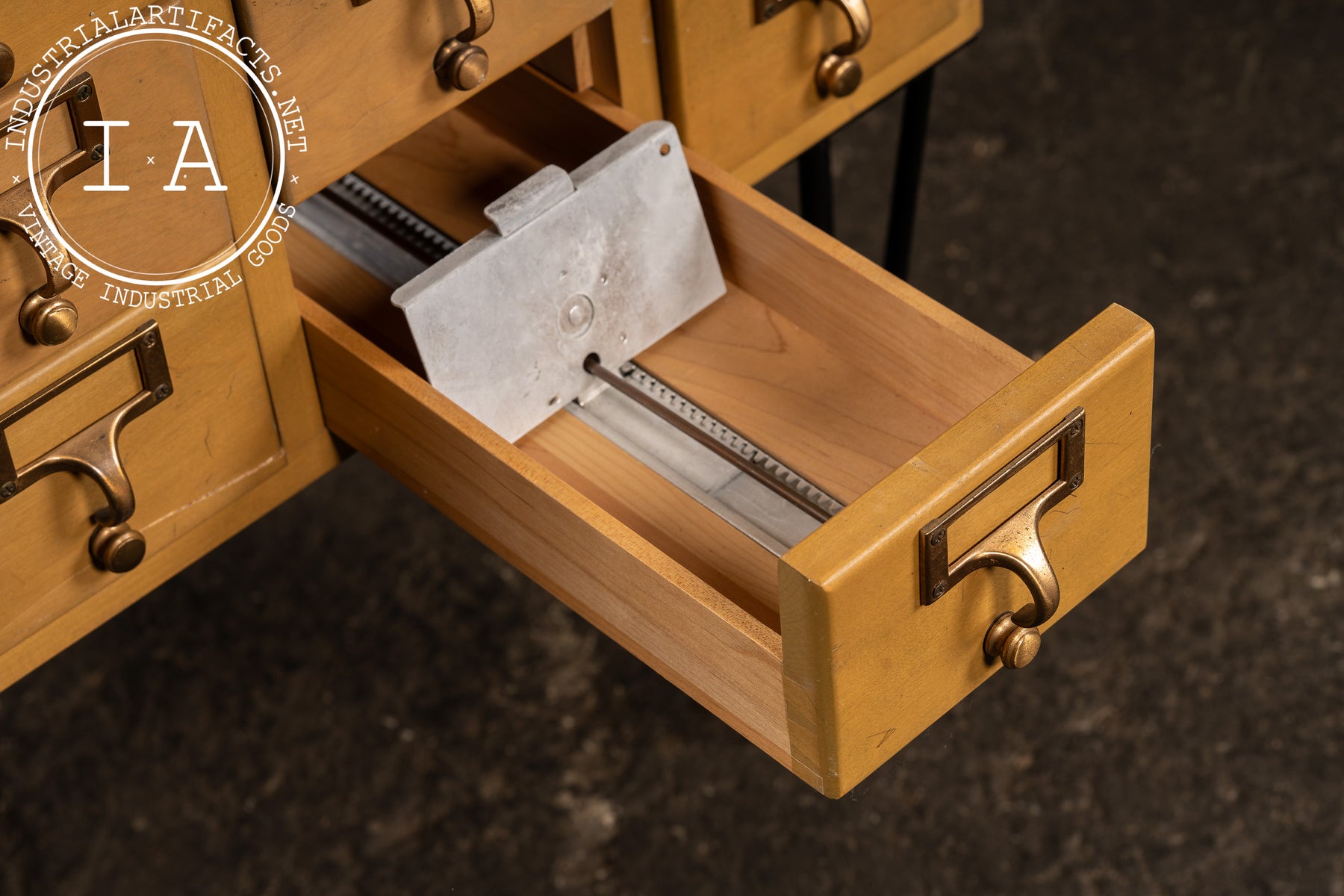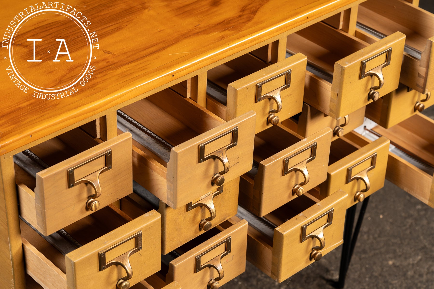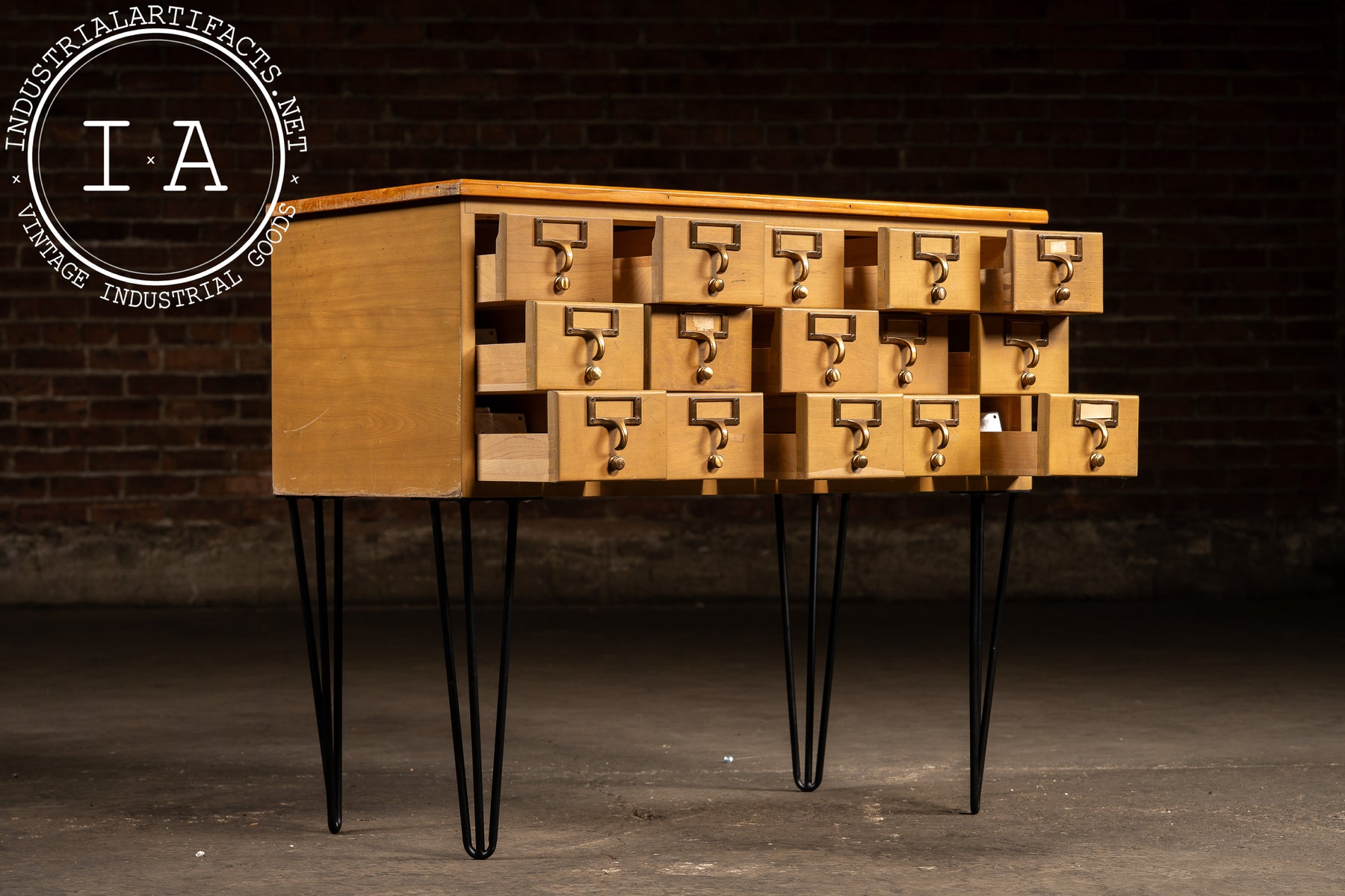 A 15-drawer maple card catalog cabinet elevated on a later set of black steel hairpin legs. Produced during the mid-century shift toward lighter, more streamlined library furniture, this cabinet reflects the practical, modular design favored by major American library-supply manufacturers. Each drawer retains its brass-plated pull with integrated label frame and internal card rails-mechanisms originally built to withstand decades of constant reference use.