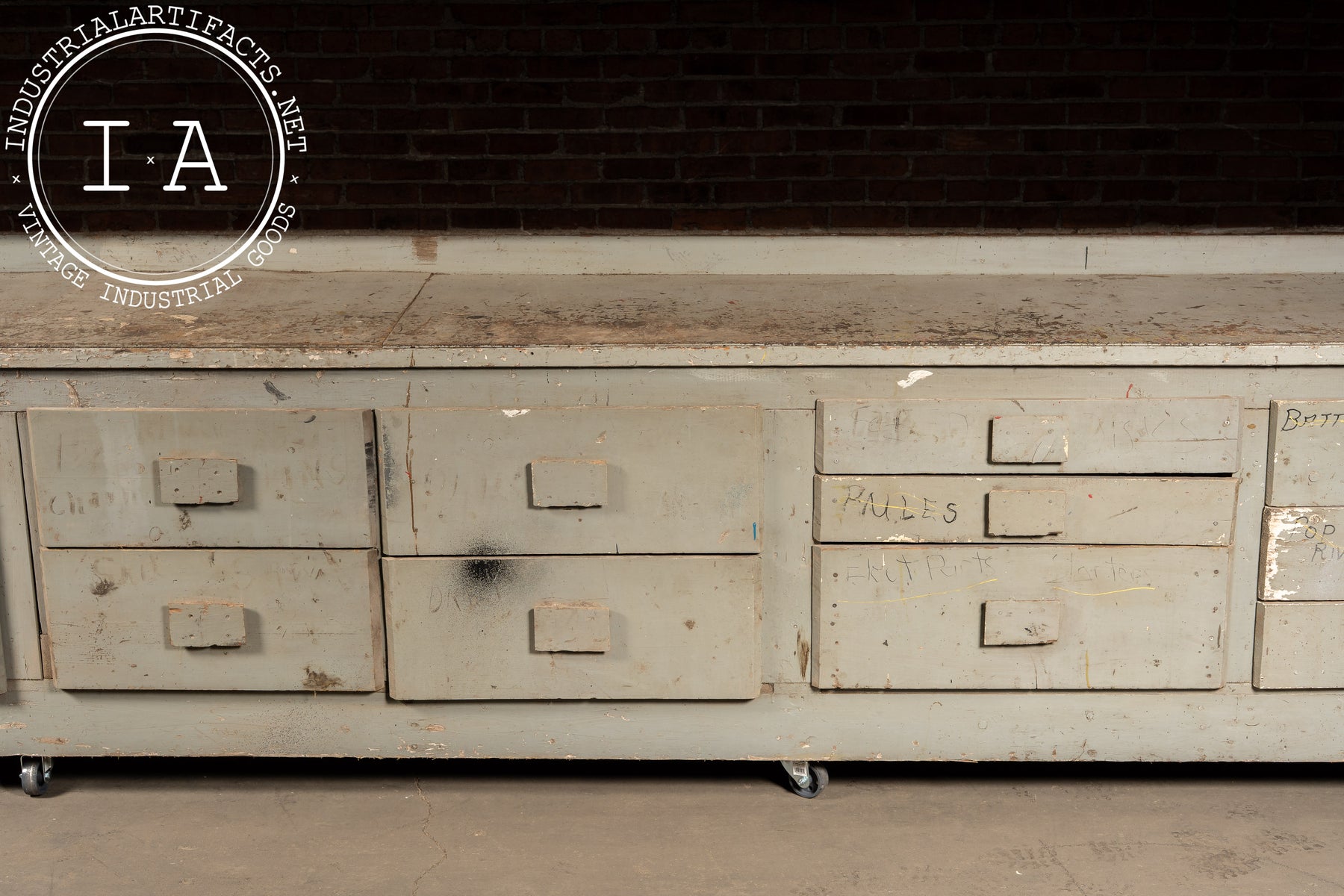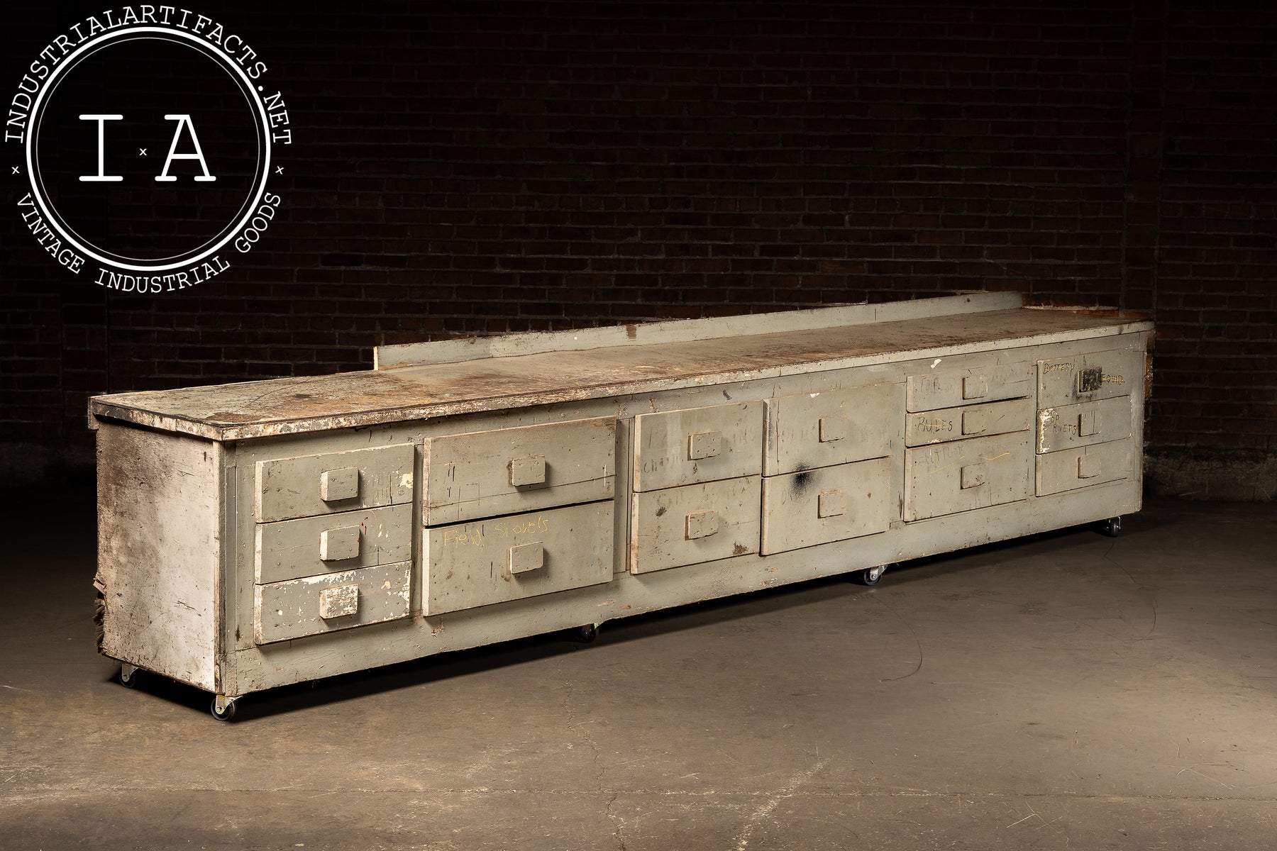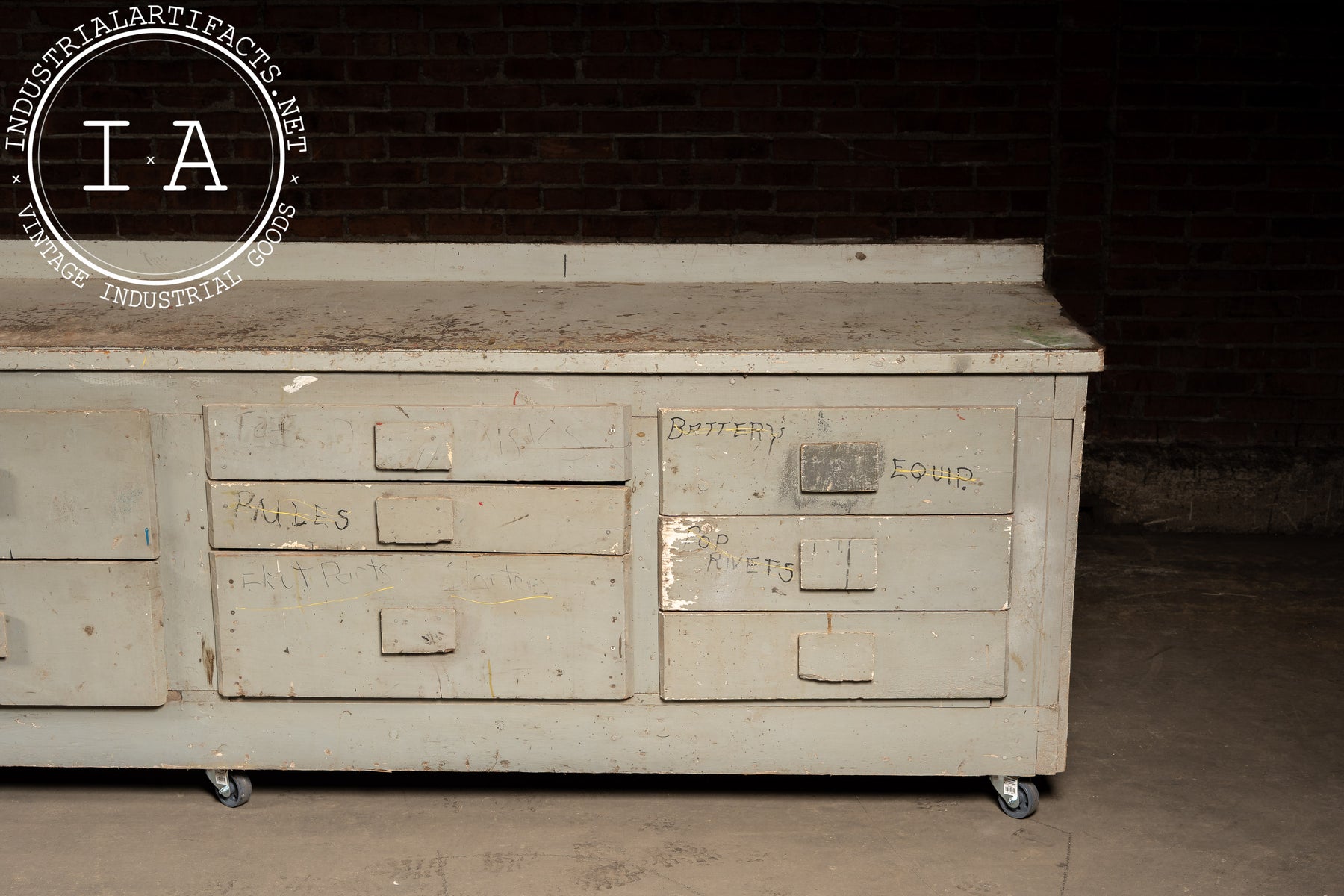 Extraordinary, nearly sixteen-foot-long industrial shop cabinet constructed in heavy pine and plywood with a thick, paint-splattered work surface and low backsplash. Built purely for function, the case features a grid of deep, wide drawers with applied rectangular pulls, many still bearing hand-scribed shop labels including "Field Spools," "Pulleys," "Cut Parts," "Battery Equip.," and "Rod Rivets." The surface tells the story of decades of use-layered paint drips, oil staining, tool scarring, and edge wear that could only come from sustained mechanical or fabrication work.
