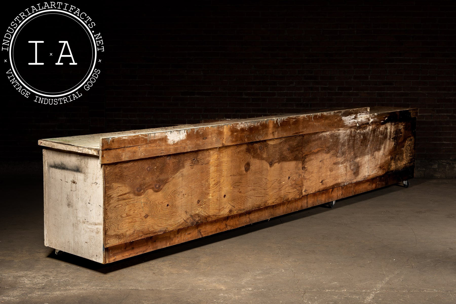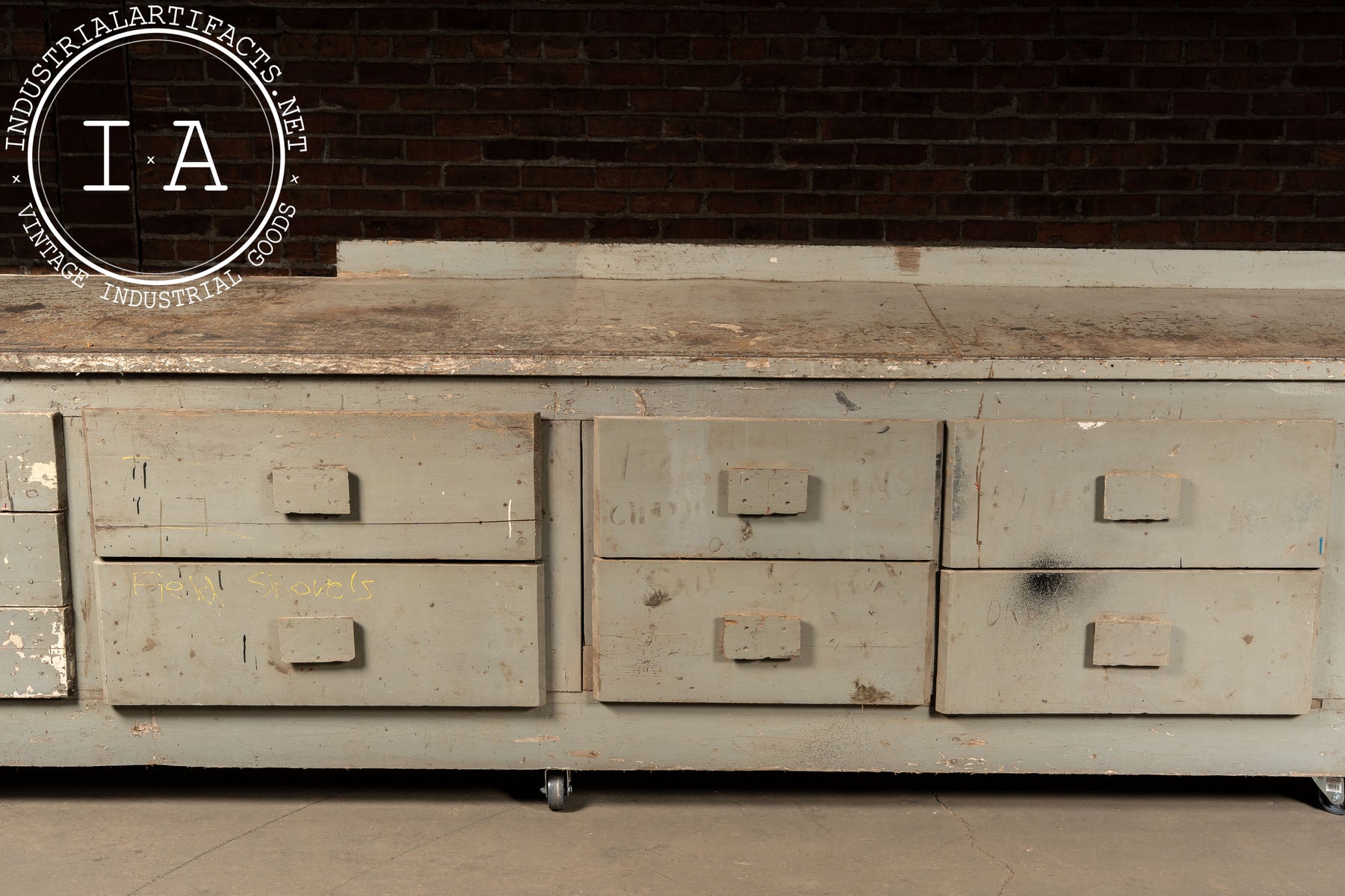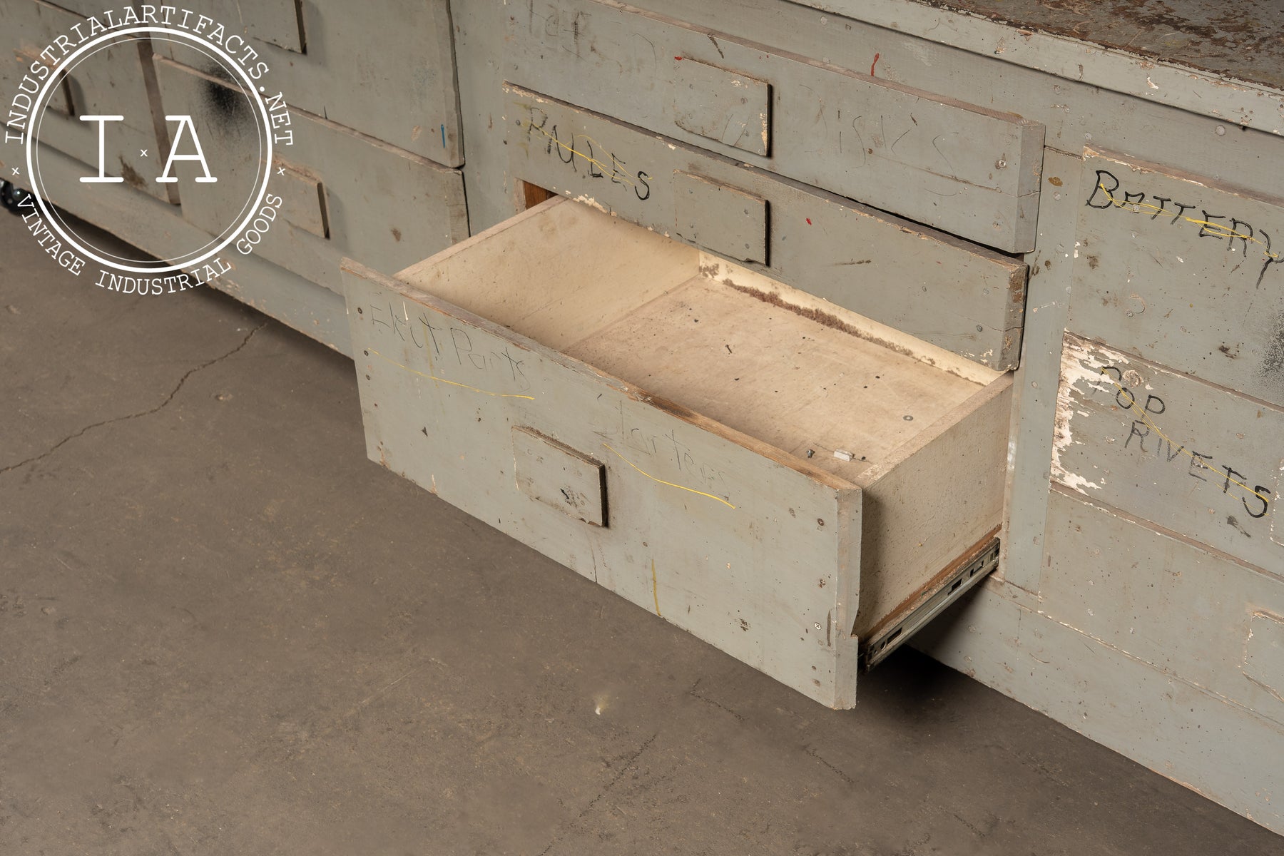 Extraordinary, nearly sixteen-foot-long industrial shop cabinet constructed in heavy pine and plywood with a thick, paint-splattered work surface and low backsplash. Built purely for function, the case features a grid of deep, wide drawers with applied rectangular pulls, many still bearing hand-scribed shop labels including "Field Spools," "Pulleys," "Cut Parts," "Battery Equip.," and "Rod Rivets." The surface tells the story of decades of use-layered paint drips, oil staining, tool scarring, and edge wear that could only come from sustained mechanical or fabrication work.