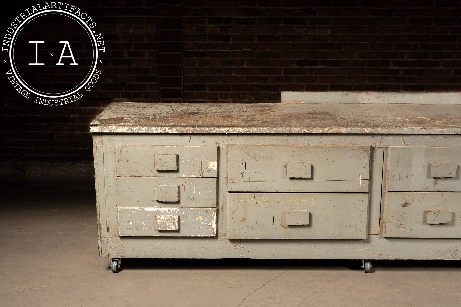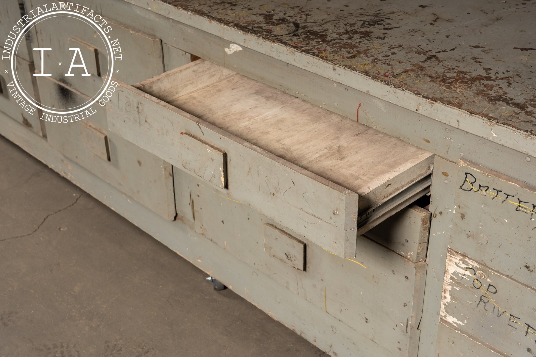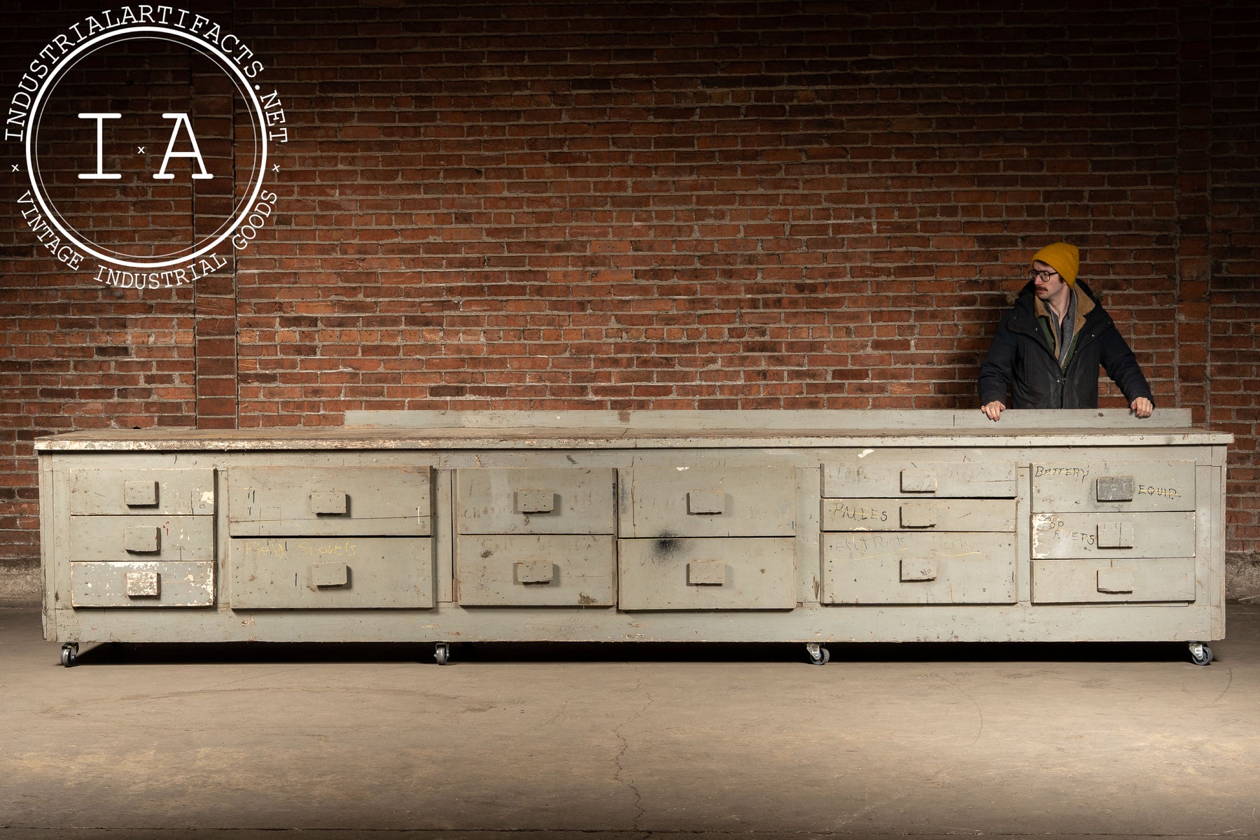 Monumental Industrial Shop Workbench Cabinet with Labeled Drawers