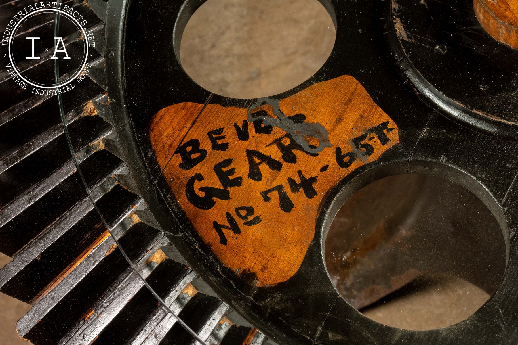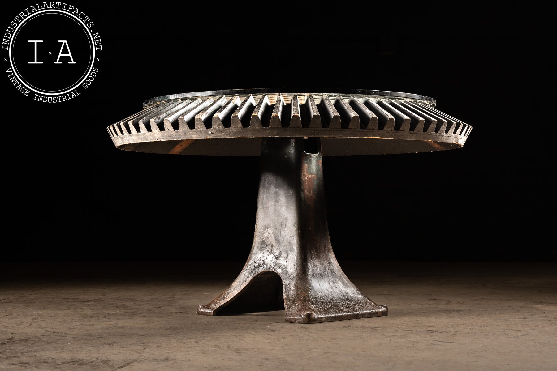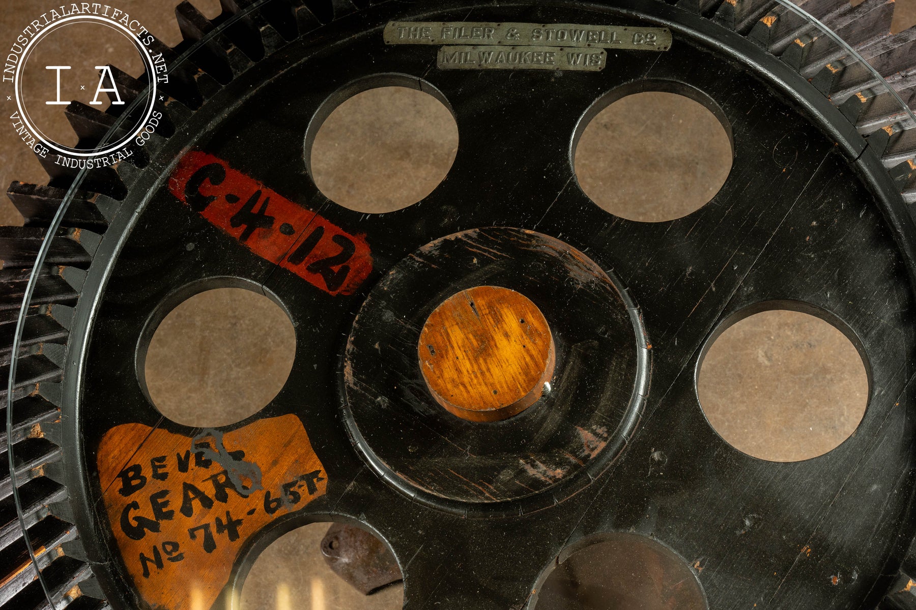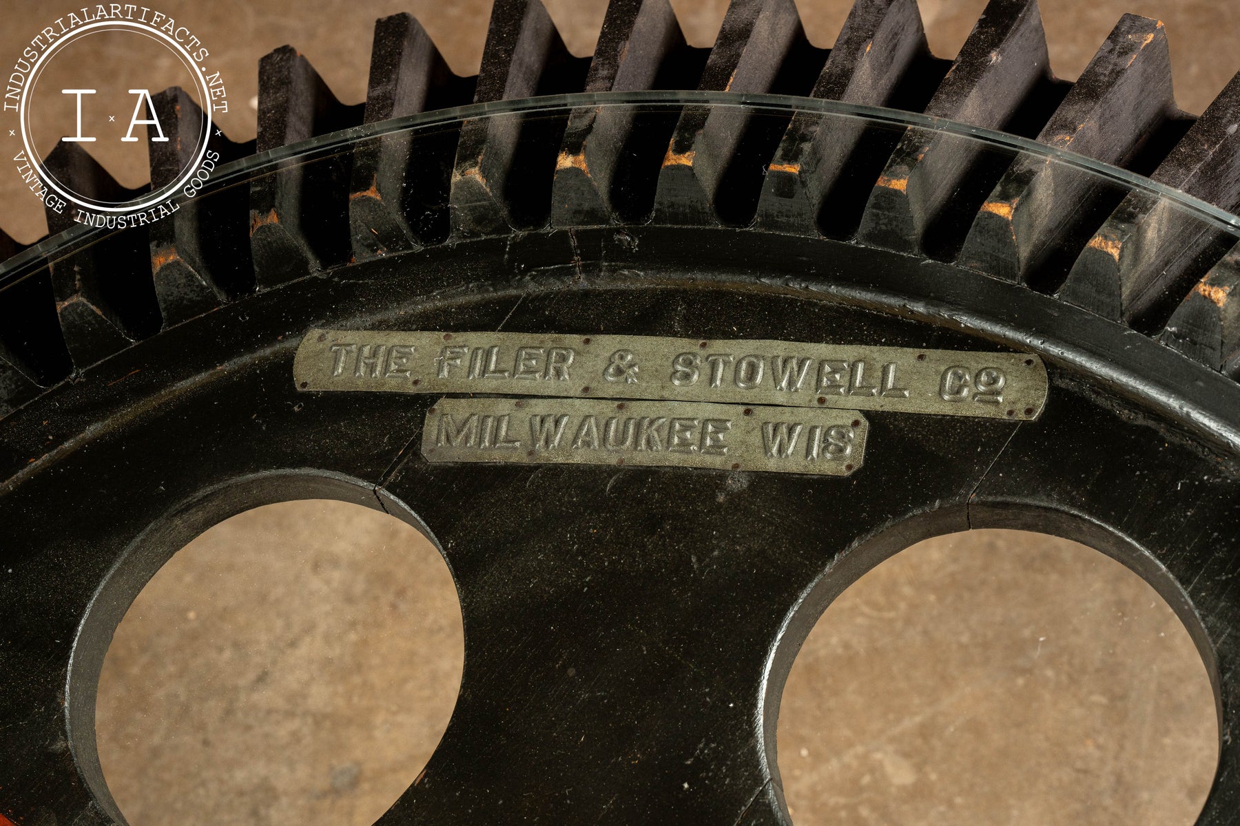 Industrial table constructed from a repurposed wooded bevel gear mold mounted on a cast iron pedestal base, topped with 1/2" fitted glass. Originally produced by The Filer & Stowell Co., founded in 1856, and best known for their sawmill machinery, gearing, and steam locomotives. This wooden gear mould was originally tagged "Bevel Gear No. 74-65T." Its broad, flared wooden teeth radiate around the circular top. Painted shop markings in orange and red remain visible across the face.