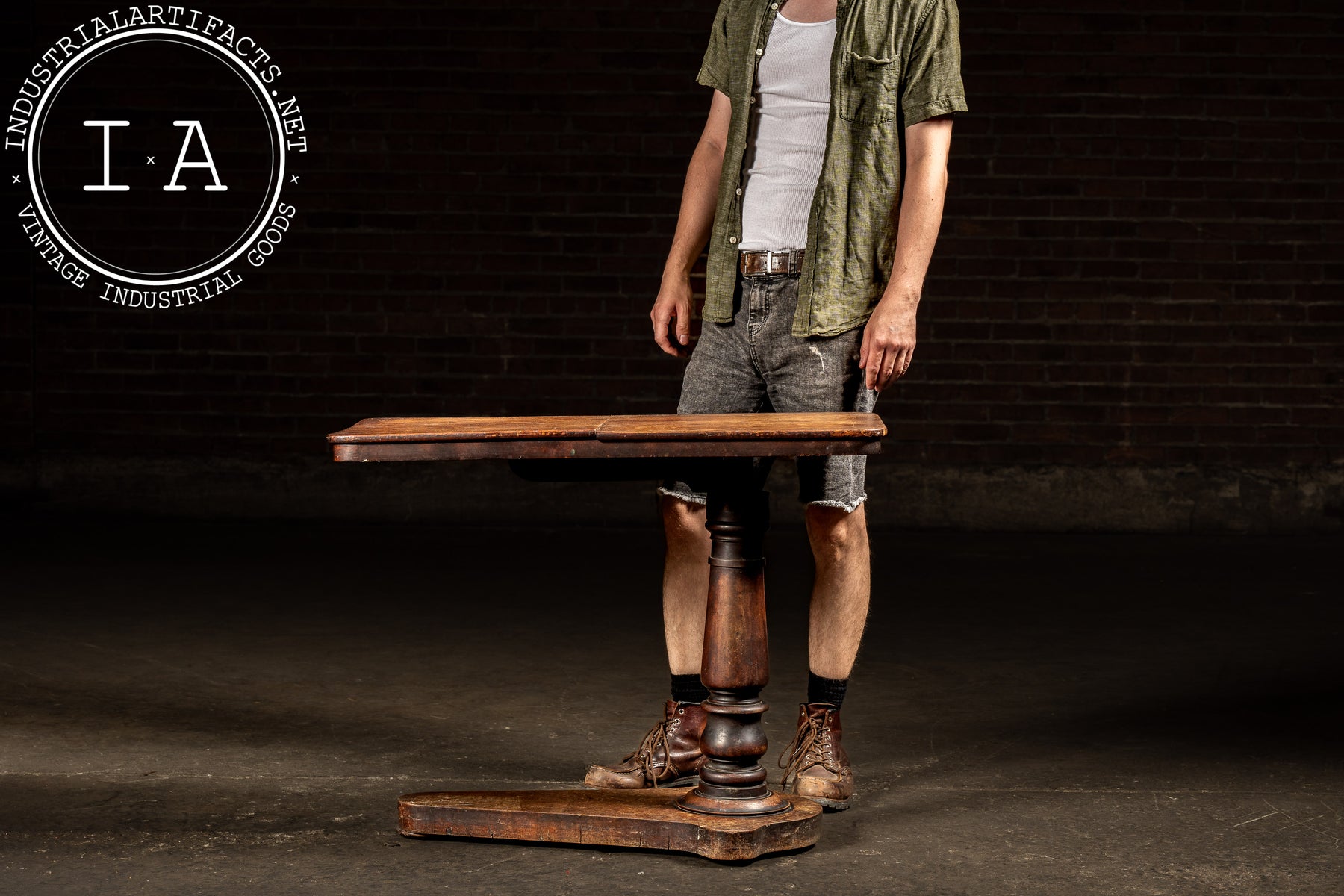 The stand's turned central column adjusts for height using a pegged system with chain-linked pin, supported by a shaped base built to extend beneath a bedframe. Its warm surface wear and sturdy construction speak to decades of practical use, offering both function and presence in a form that bridges medicine and study.
