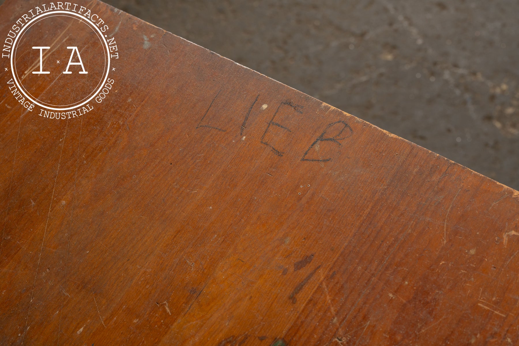 Surface shows heavy wear from decades of use, with scratches, paint flecks, and marks across the worktop. The wooden base carries expected scuffs and finish loss, though the structure remains sound and all adjustment hardware functions properly.