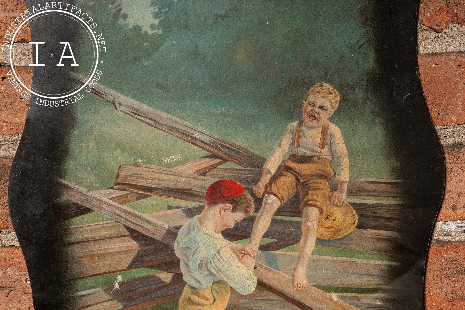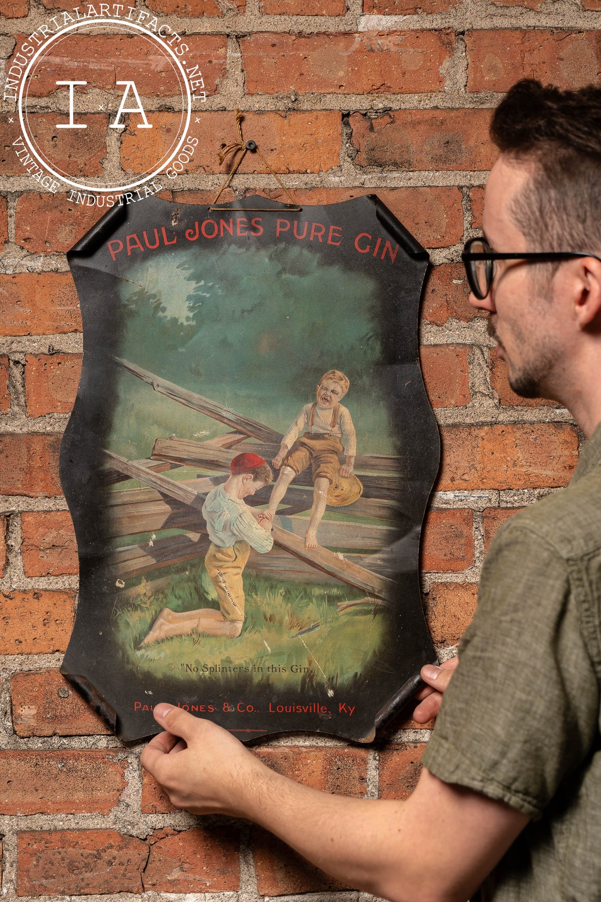 Curved-edge self-framed tin advertising sign for Paul Jones Pure Gin, featuring a nostalgic turn-of-the-century vignette of two barefoot boys helping one another over a wooden fence. The slogan "No Splinters in this Gin" anchors the playful scene, pairing small-town Americana with early 20th-century spirits promotion. The surface retains vivid color and tonal warmth, rendered in soft lithographic layers with a satin finish that has aged gracefully.