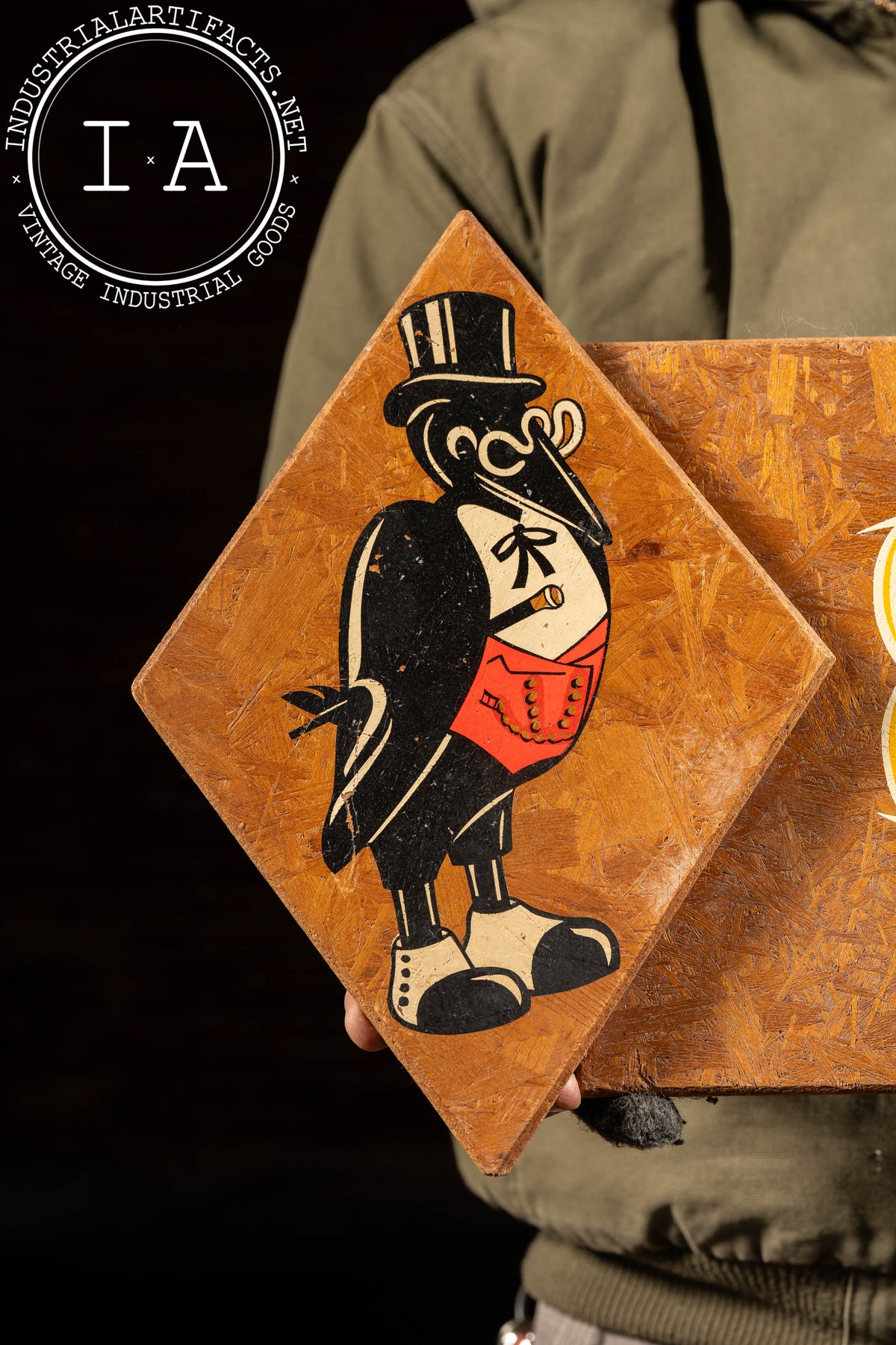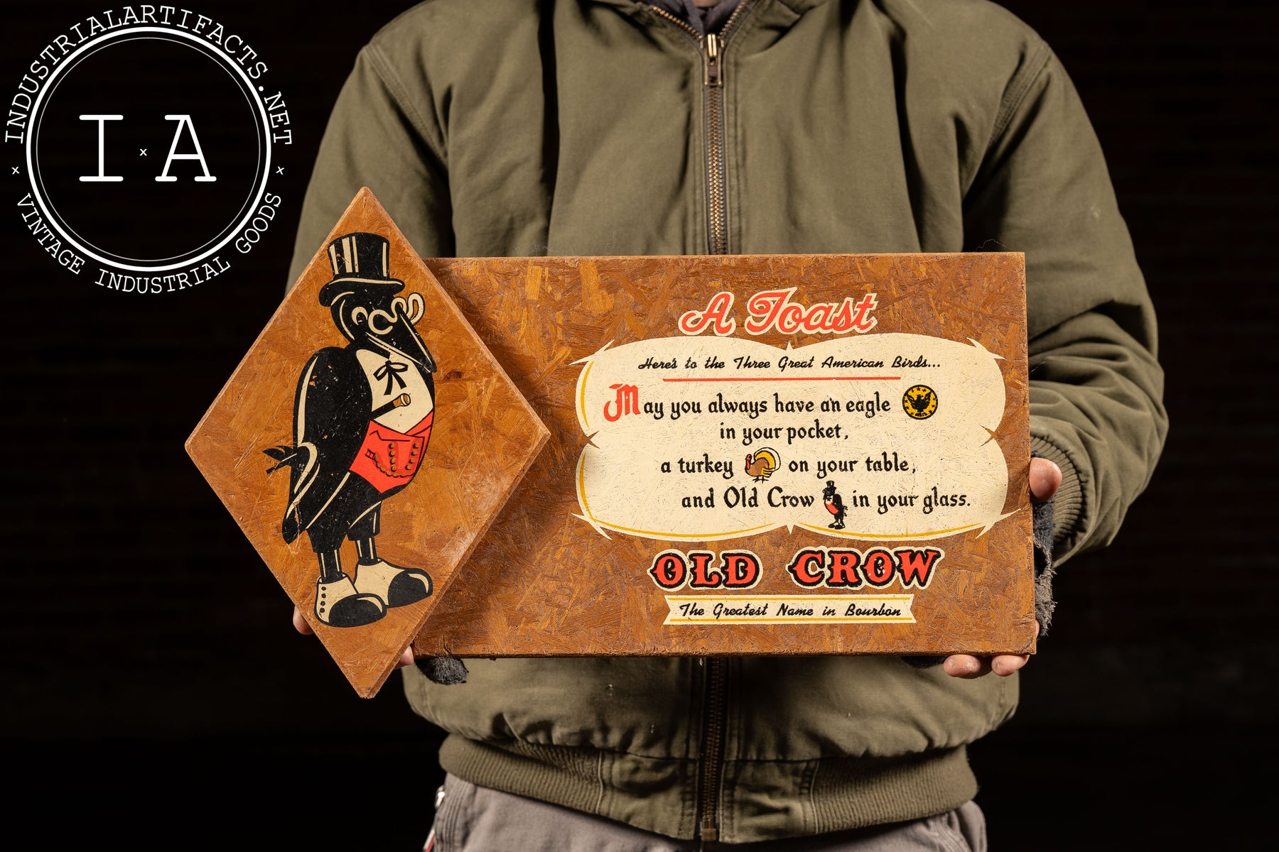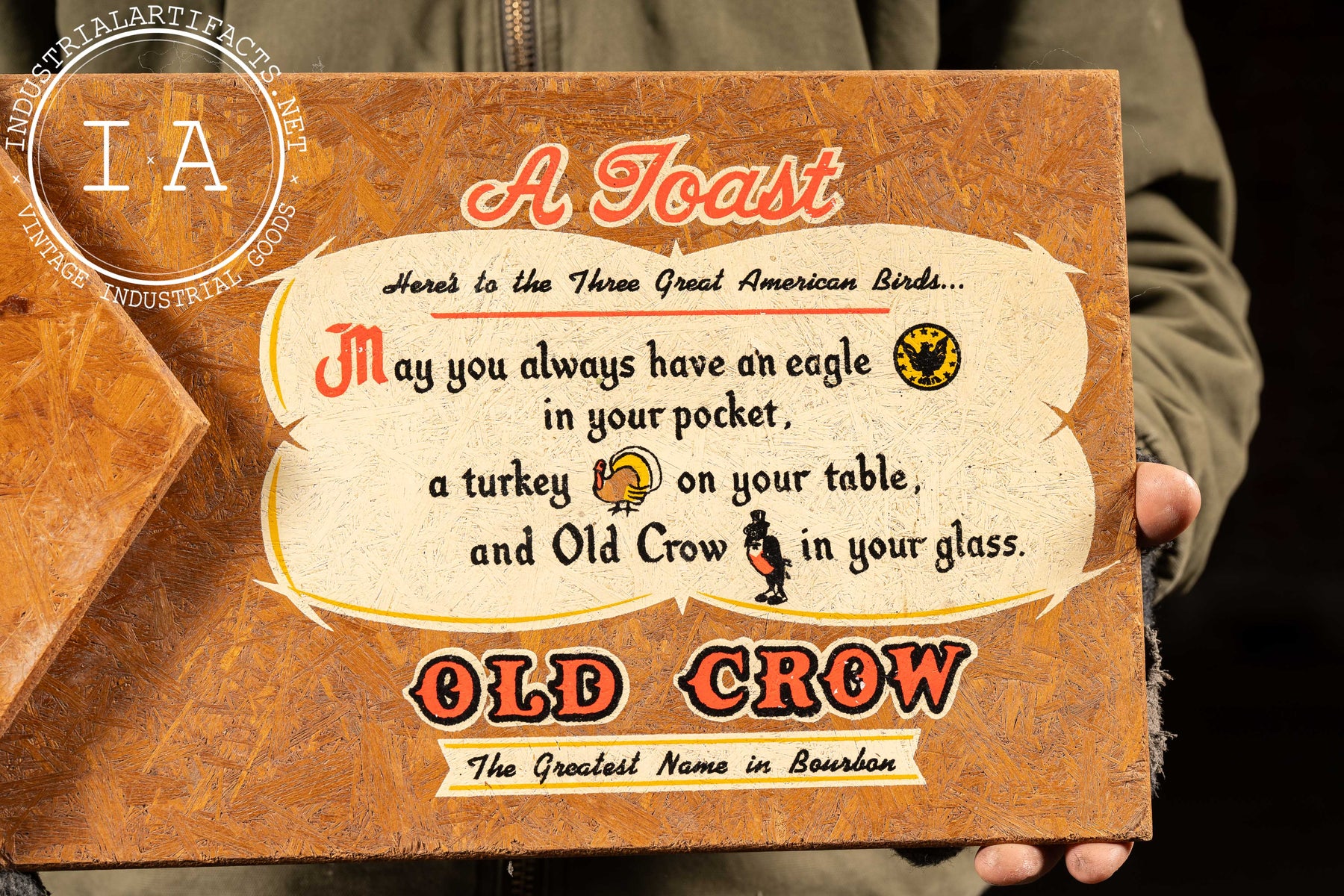 Painted advertising panel promoting Old Crow bourbon, featuring the brand's whimsical crow mascot rendered in formal dress alongside the slogan "A Toast-Here's to the Three Great American Birds." The composition pairs playful illustration with period typography, centering the brand's mid-century marketing tone-approachable, patriotic, and slightly irreverent. The textured board surface and warm brown ground give the piece visual depth, while the bold cream, red, and black lettering remains crisp and legible. A compact but graphic example of postwar American spirits advertising, designed for tavern or bar-back display.