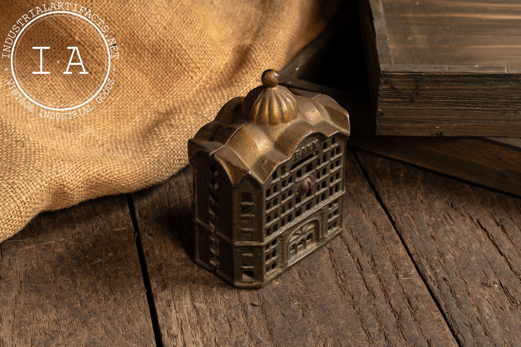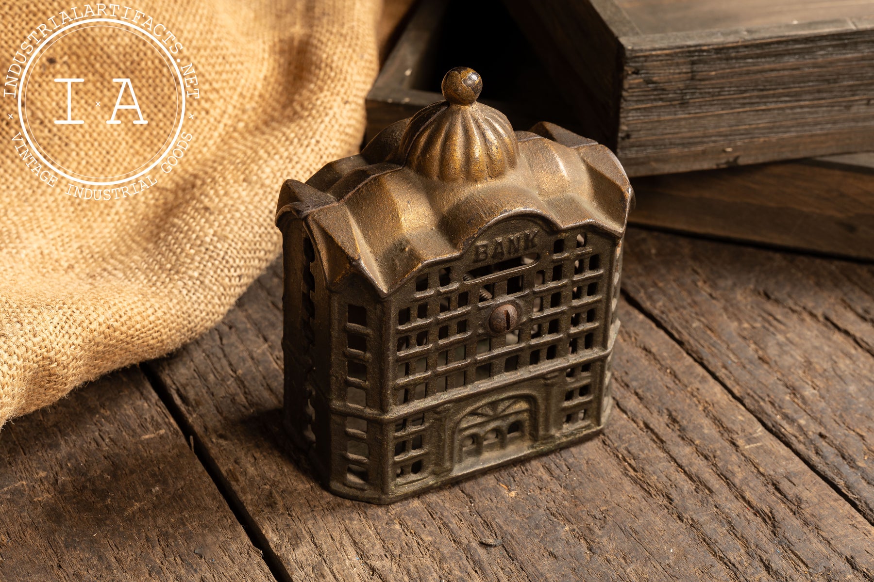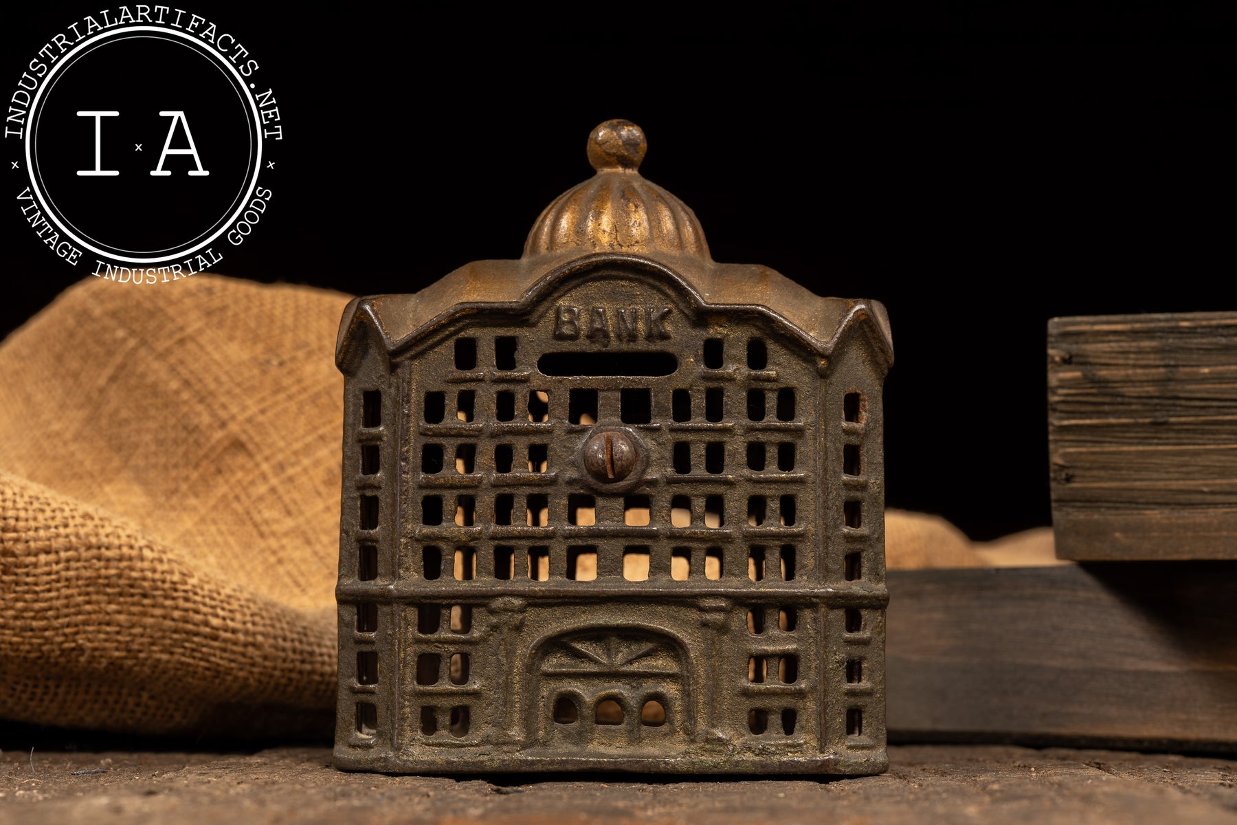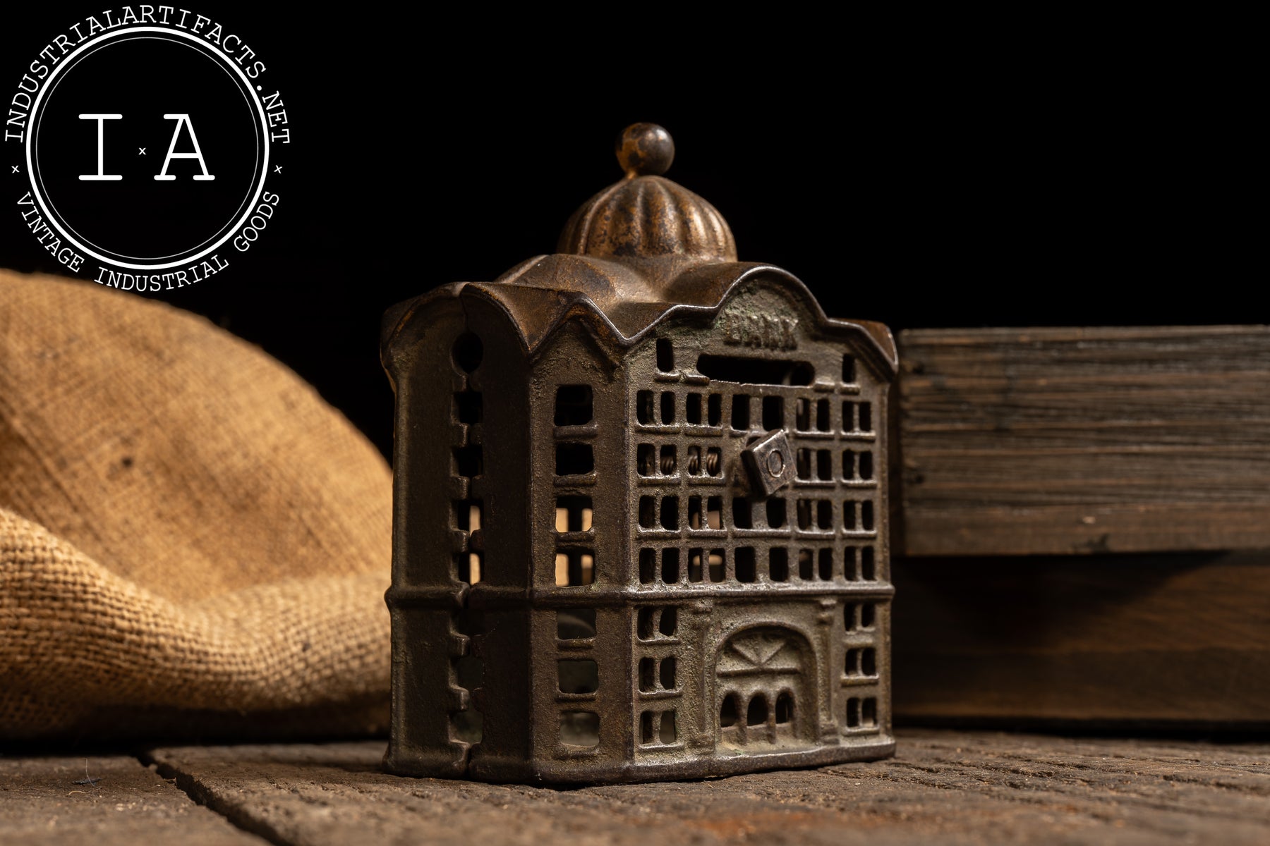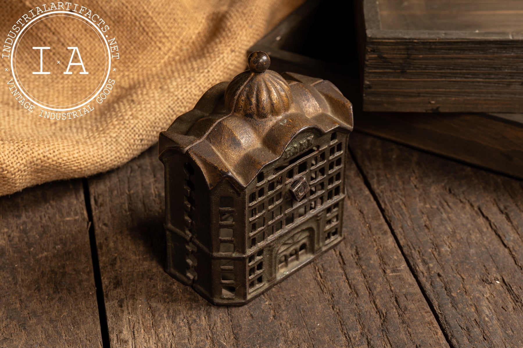Cast iron architectural still bank modeled as a multi-story commercial building, featuring rows of punched windows, an arched entryway, and a domed rooftop finial. The word "BANK" is cast above the coin slot, reinforcing the piece's intended use as both a savings bank and a symbolic teaching object. The form is weighty and solid, with crisp molded details that reflect A. C. Williams' reputation for durable, well-executed cast iron novelties. Designed without a trap door, coins were intended to remain sealed inside, emphasizing thrift and long-term saving-an approach common to early American still banks.