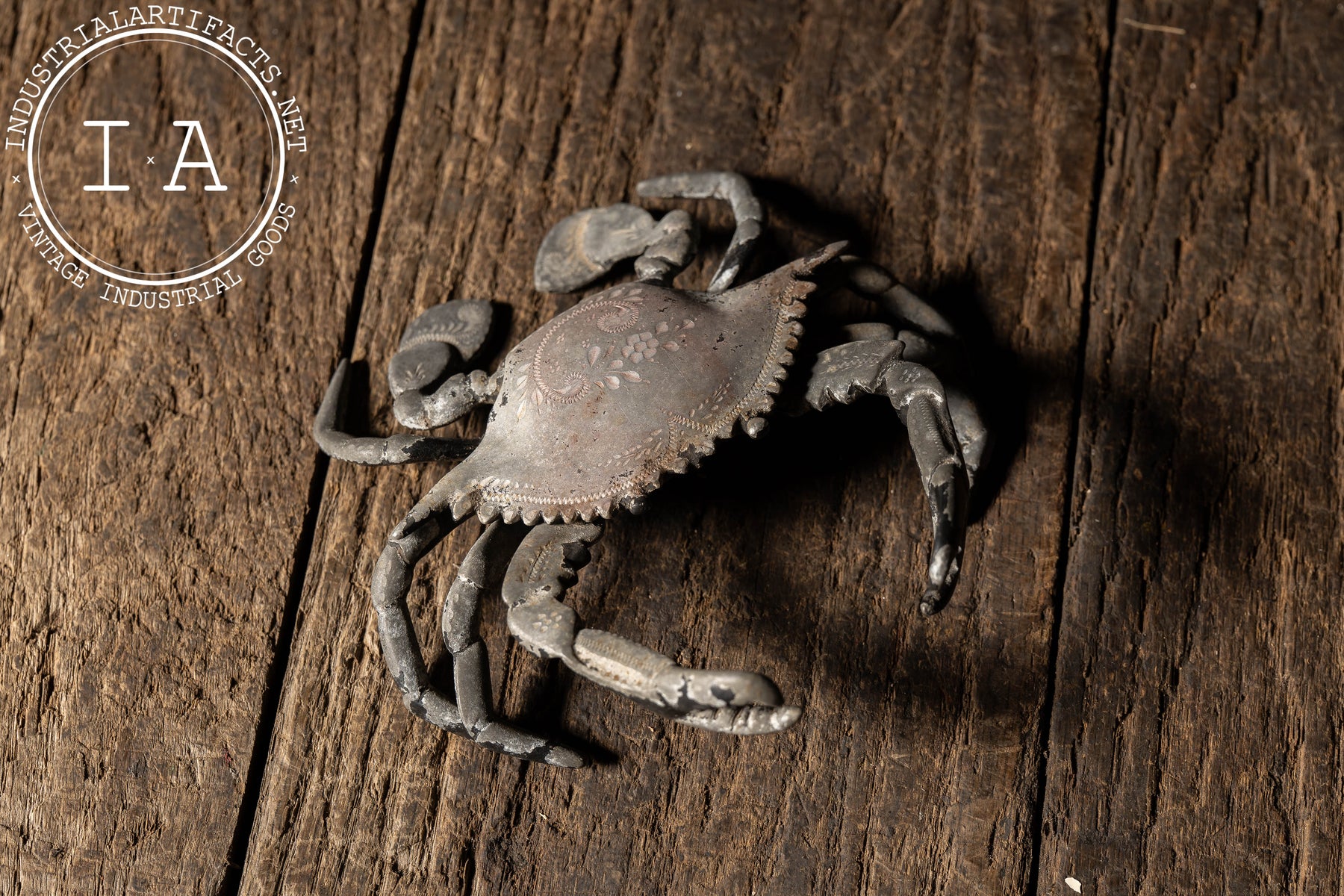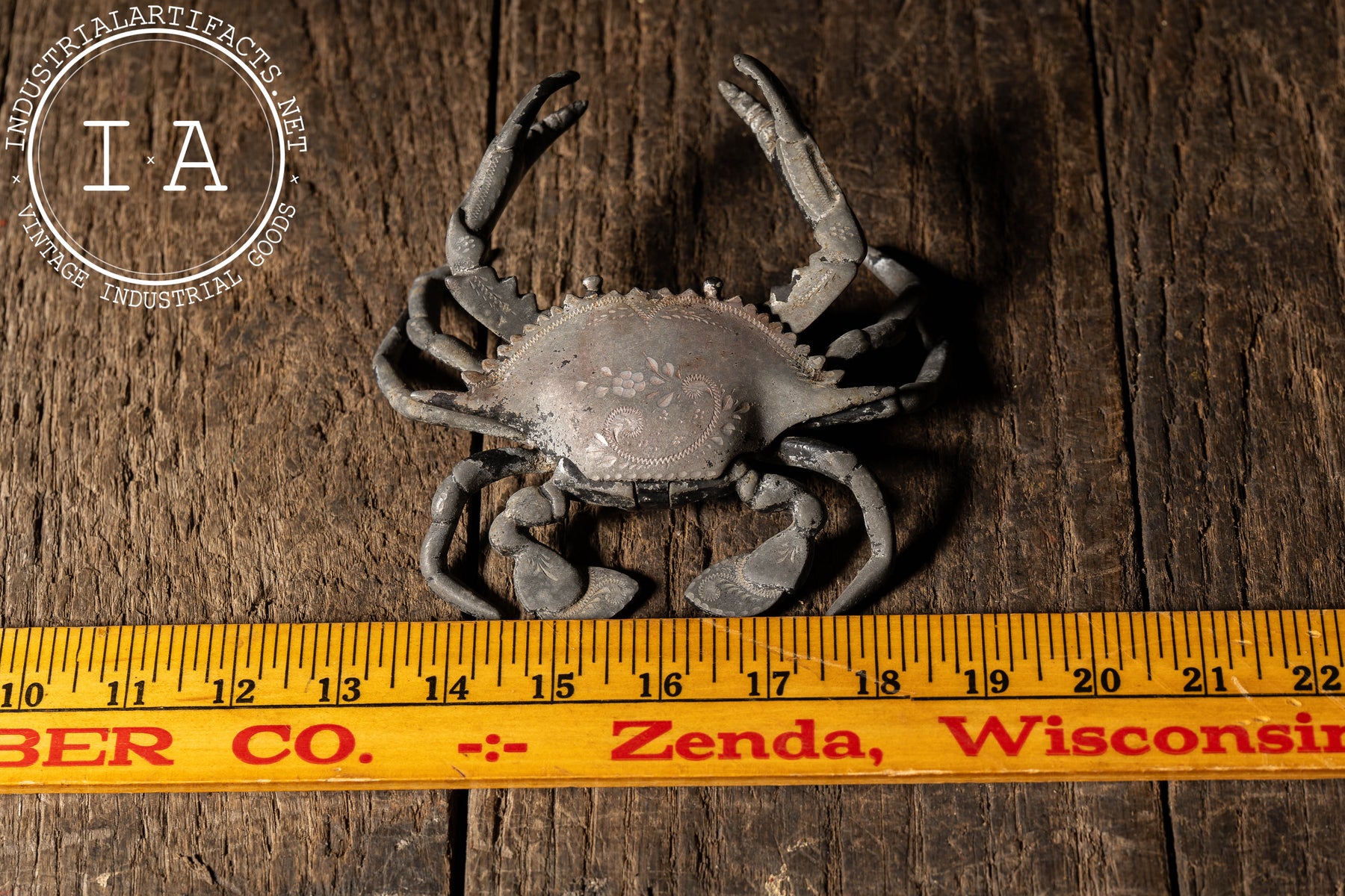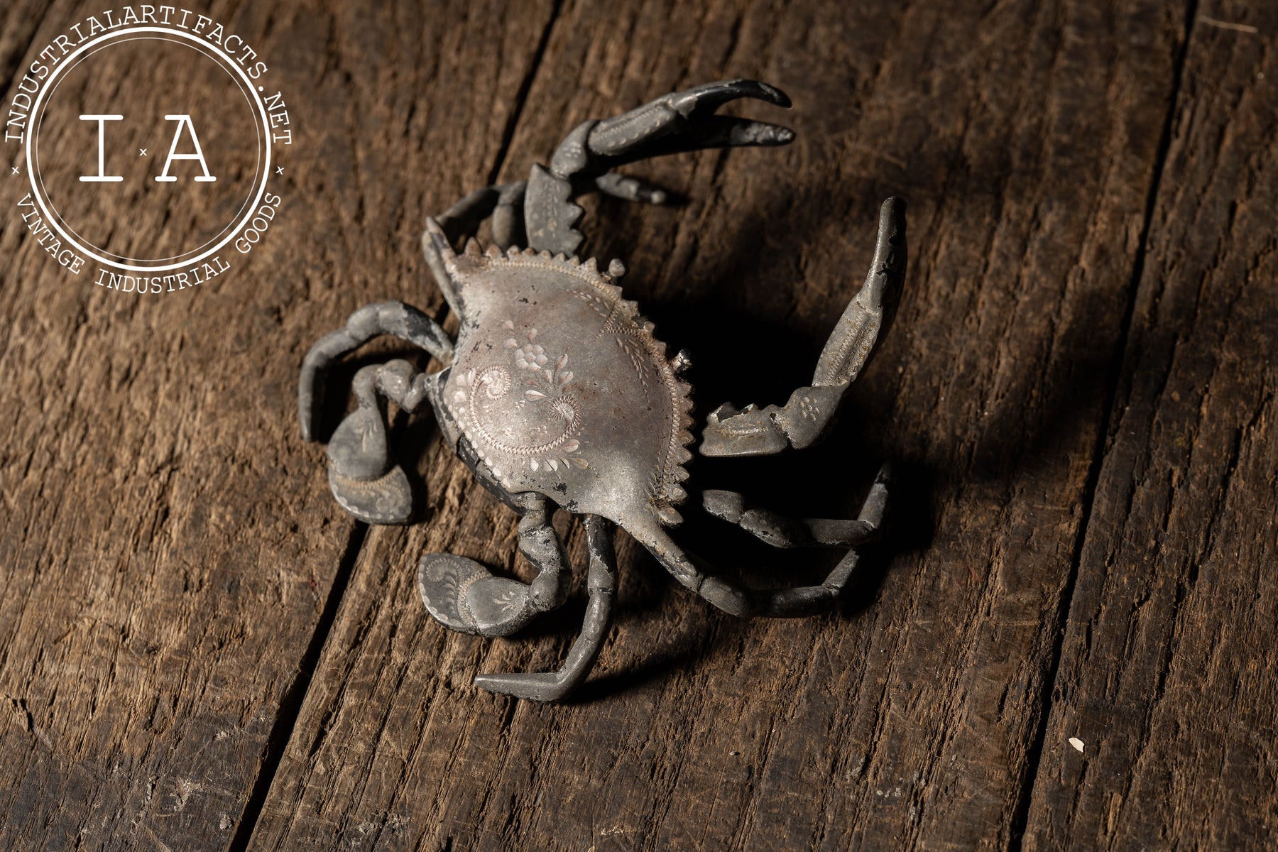 Crab-form inkwells were produced across Europe and the U.S. through the early 1900s, often sold as novelty desk accessories or seaside tourist goods. Cast-iron examples with worked surfaces and patterned embellishment are particularly desirable, representing a blend of folk craftsmanship and commercial cast-metal production.