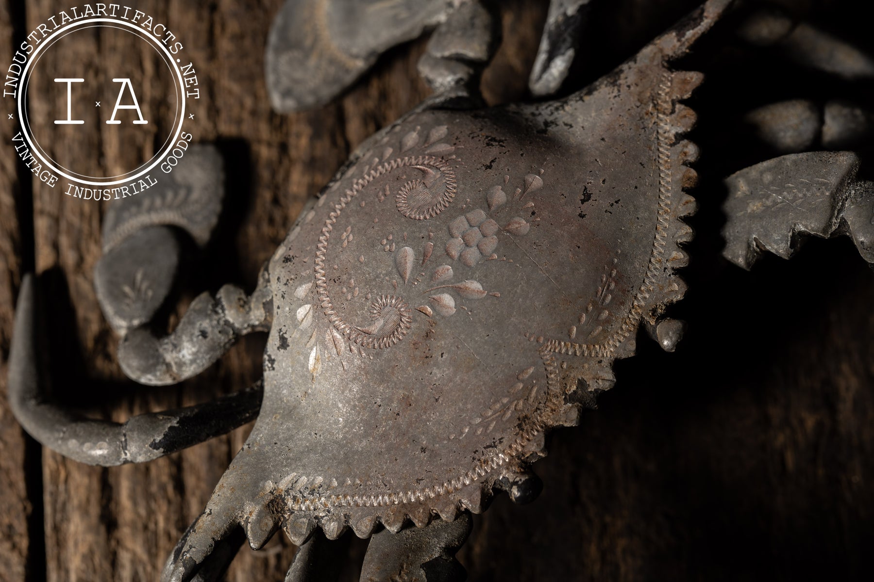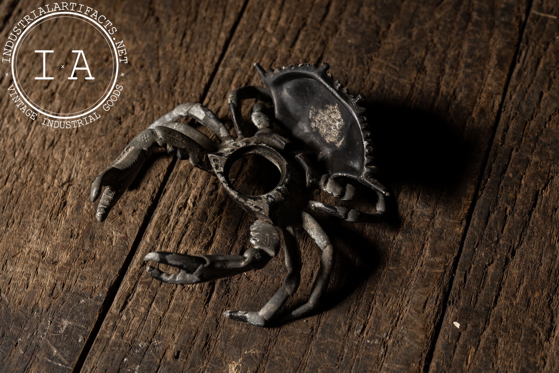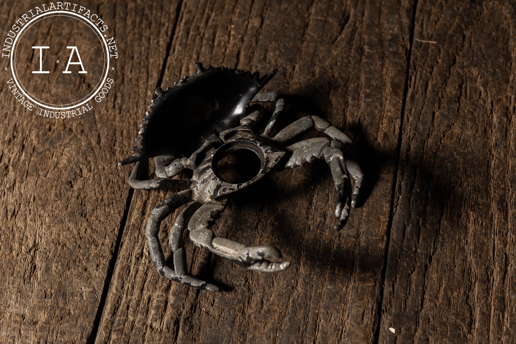 Crab-form inkwells were produced across Europe and the U.S. through the early 1900s, often sold as novelty desk accessories or seaside tourist goods. Cast-iron examples with worked surfaces and patterned embellishment are particularly desirable, representing a blend of folk craftsmanship and commercial cast-metal production.