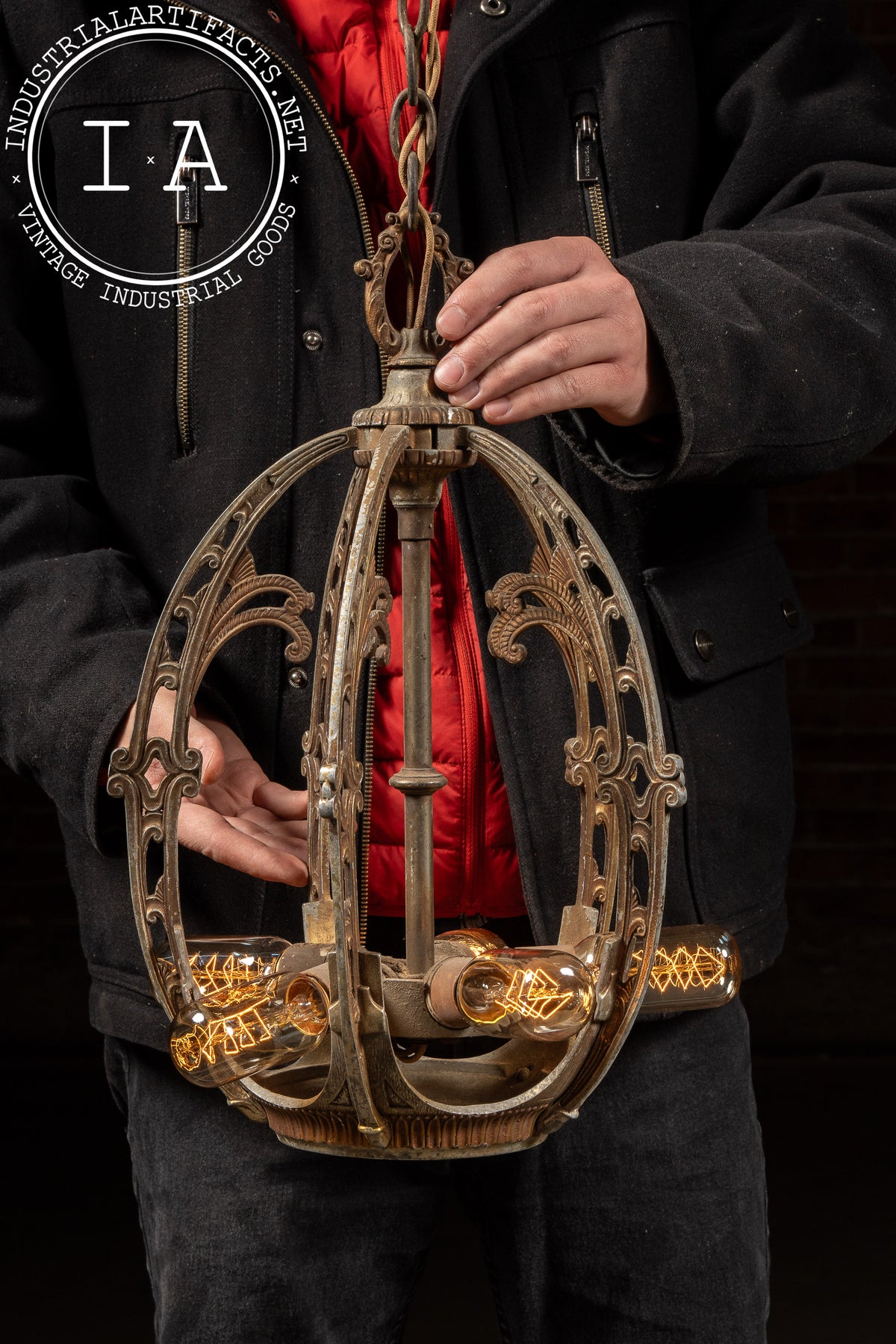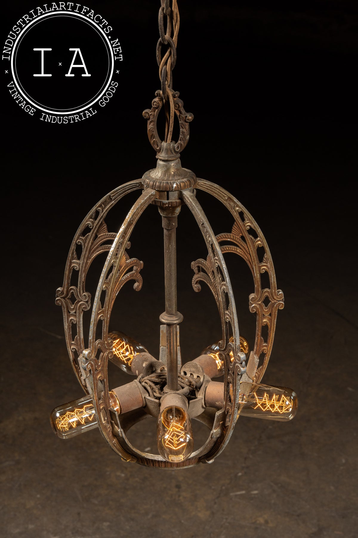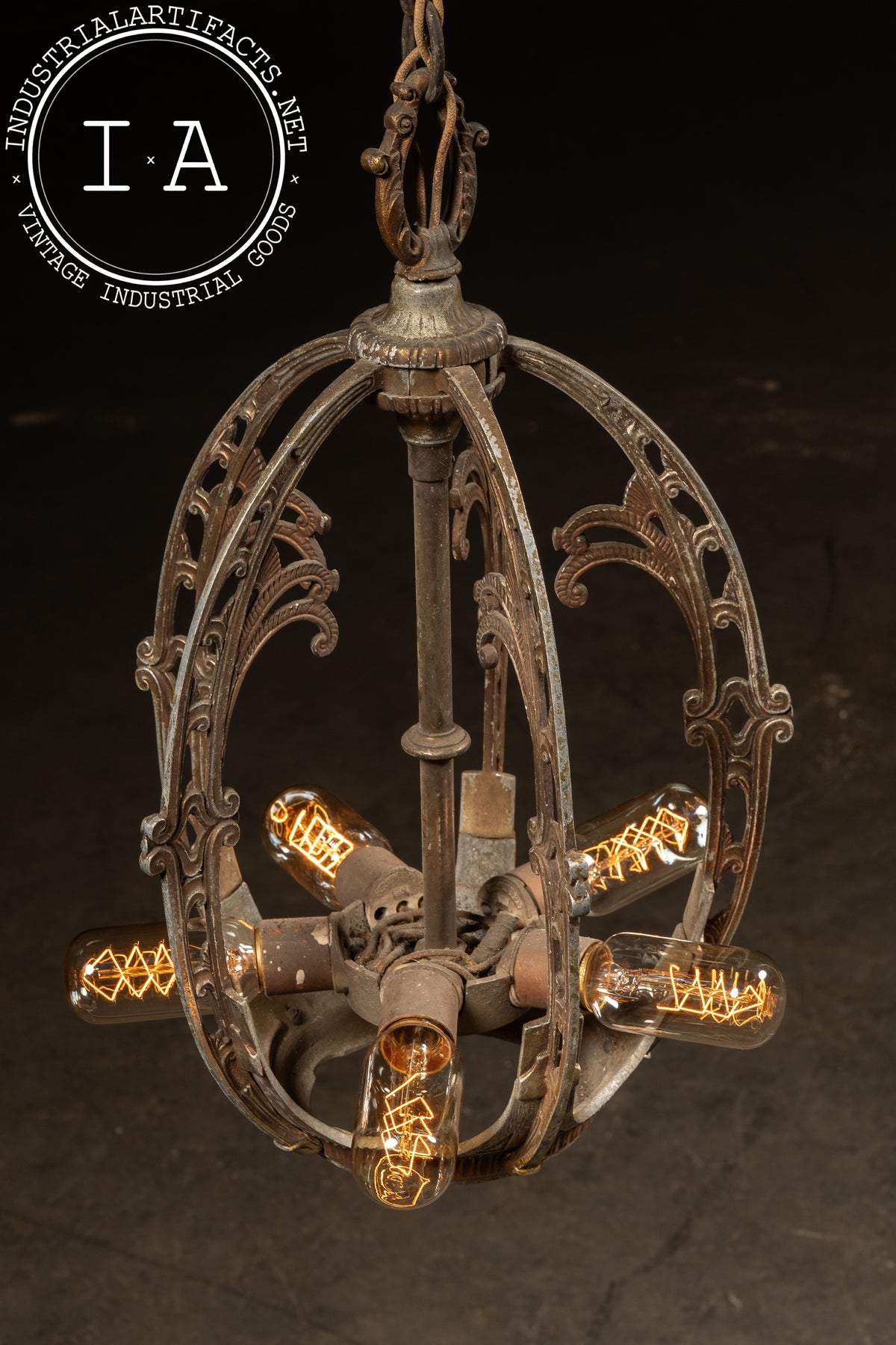 Handsome five-bulb pendant rendered in cast iron with strong Gothic Revival influences, including pointed arches, ribbed tracery, stylized foliate curls, and a sculpted suspension loop. The openwork framework forms a lantern-like cage around the central hub of five sockets, each oriented horizontally for a dramatic radial presentation. Its tall vertical profile and architectural ornament suggest use in an entry hall, stairwell, or commercial lobby in the early 20th century. The aged iron finish has developed a rich, honest patina. Tested and working.