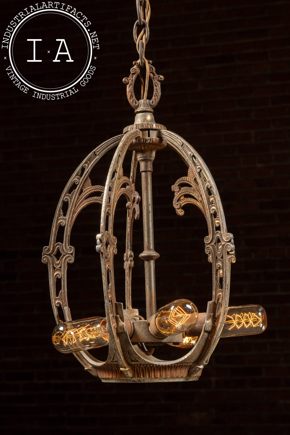 By the 1920s, cast-iron decorative pendants like this became popular in both residential and civic interiors, drawing from medieval Gothic motifs while accommodating modern electric lighting. Their durability and sculptural presence made them enduring fixtures in churches, theaters, and well-appointed homes.