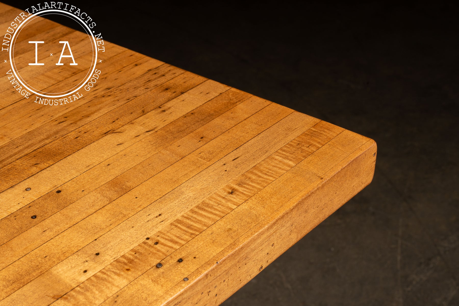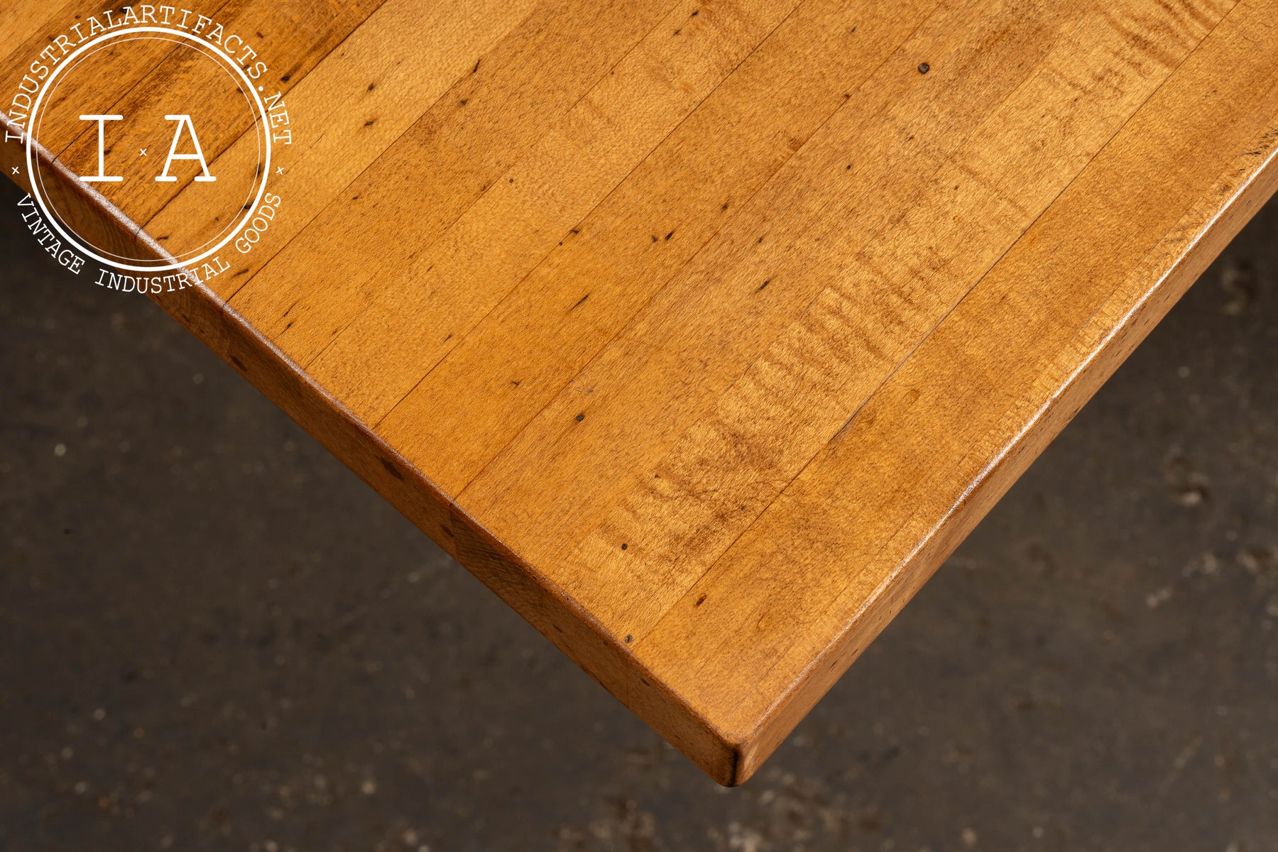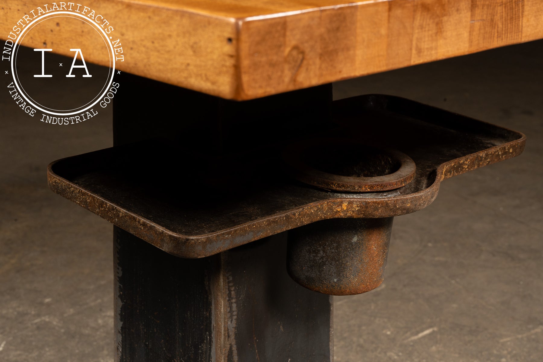 Shows wear and patina throughout the base and tray, along with rust on the tray assembly. The maple top is in excellent condition with only minor marks consistent with its reclaimed history.