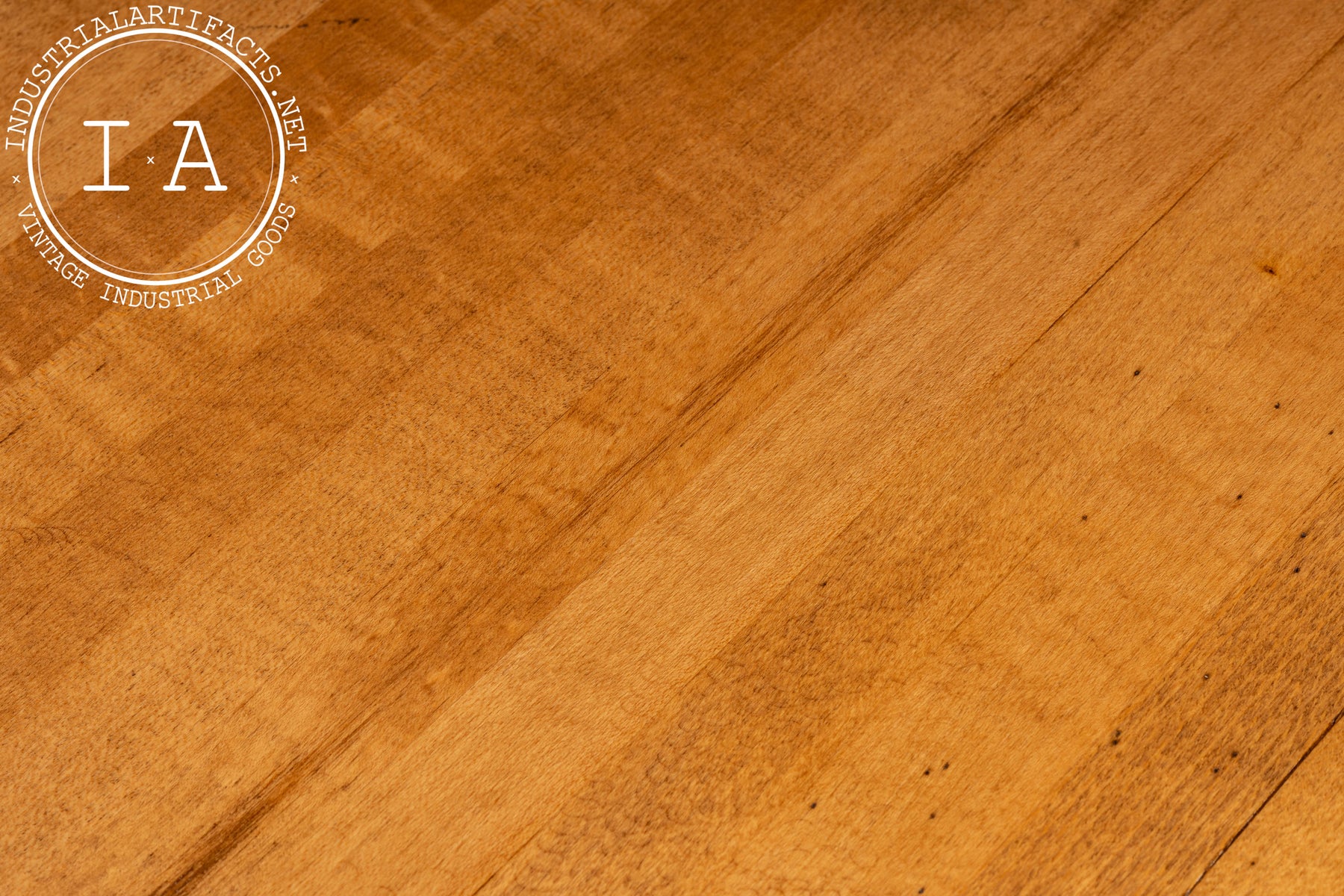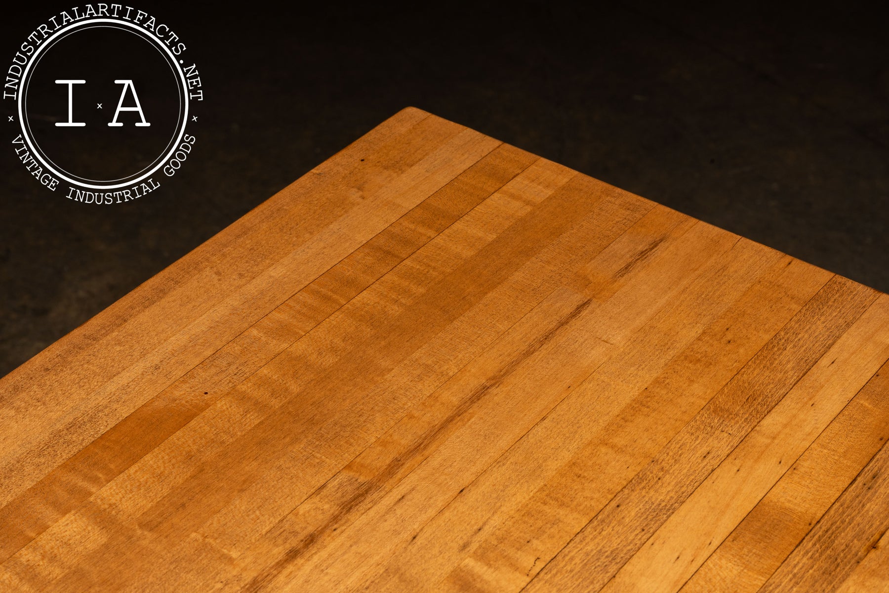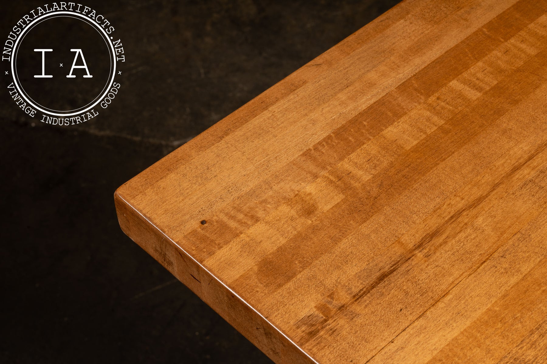 Shows wear and patina throughout the base and tray, along with rust on the tray assembly. The maple top is in excellent condition with only minor marks consistent with its reclaimed history.