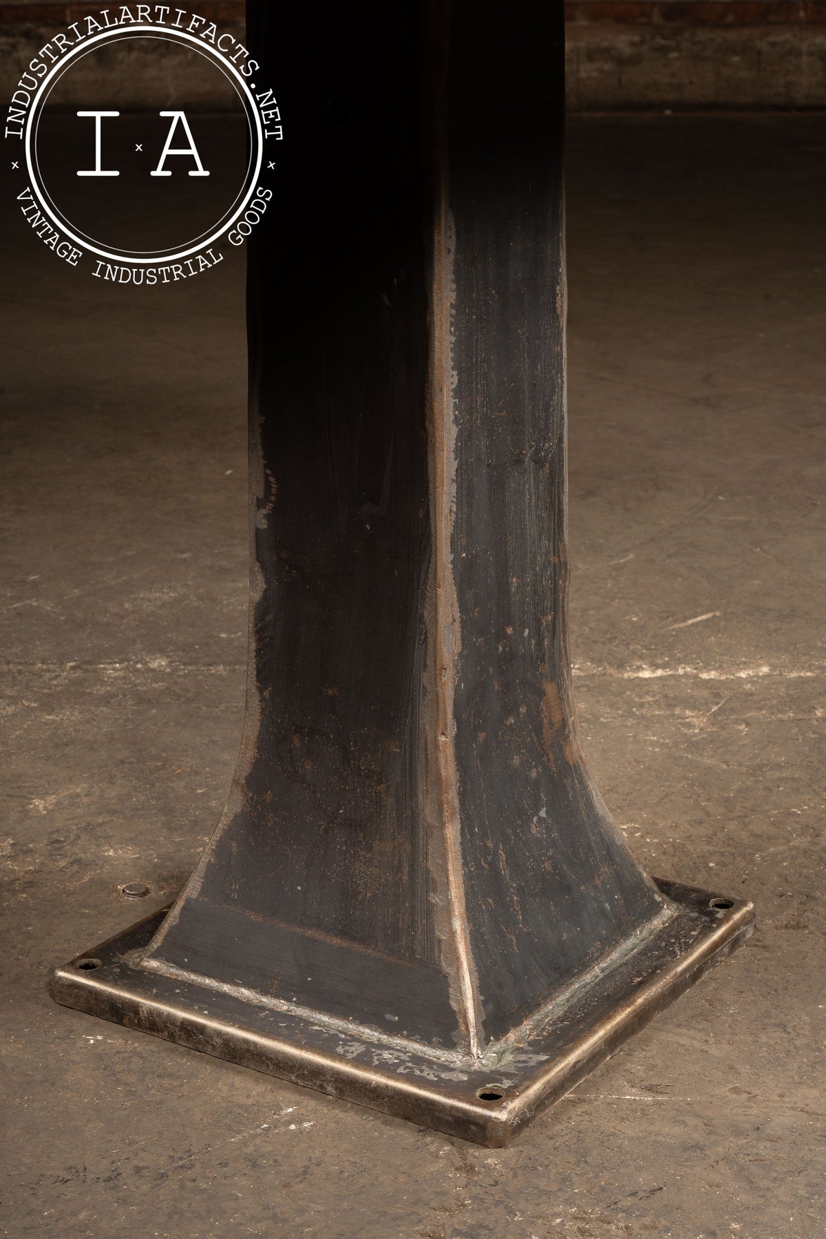Built during the height of American industrial manufacturing, this pub table combines a thick, edge-glued maple top with a salvaged cast-iron pedestal originally used to support shop equipment. The top shows tight lamination with light figure, tool flecks, and a clean satin finish-classic of bench maple reclaimed from Midwestern factories. The pedestal rises with a subtle flare and sits on a square footplate, retaining decades of wear, darkened steel tones, and utilitarian shaping. An additional cast-iron tray-likely a drip or parts tray from its former machine application-mounts just beneath the top and can be installed or removed as needed. Its sculpted form includes a recessed circular well that once held a small oil cup, now richly oxidized and textural. The whole piece stands with the rugged, overbuilt character that defined Depression-era industrial design.