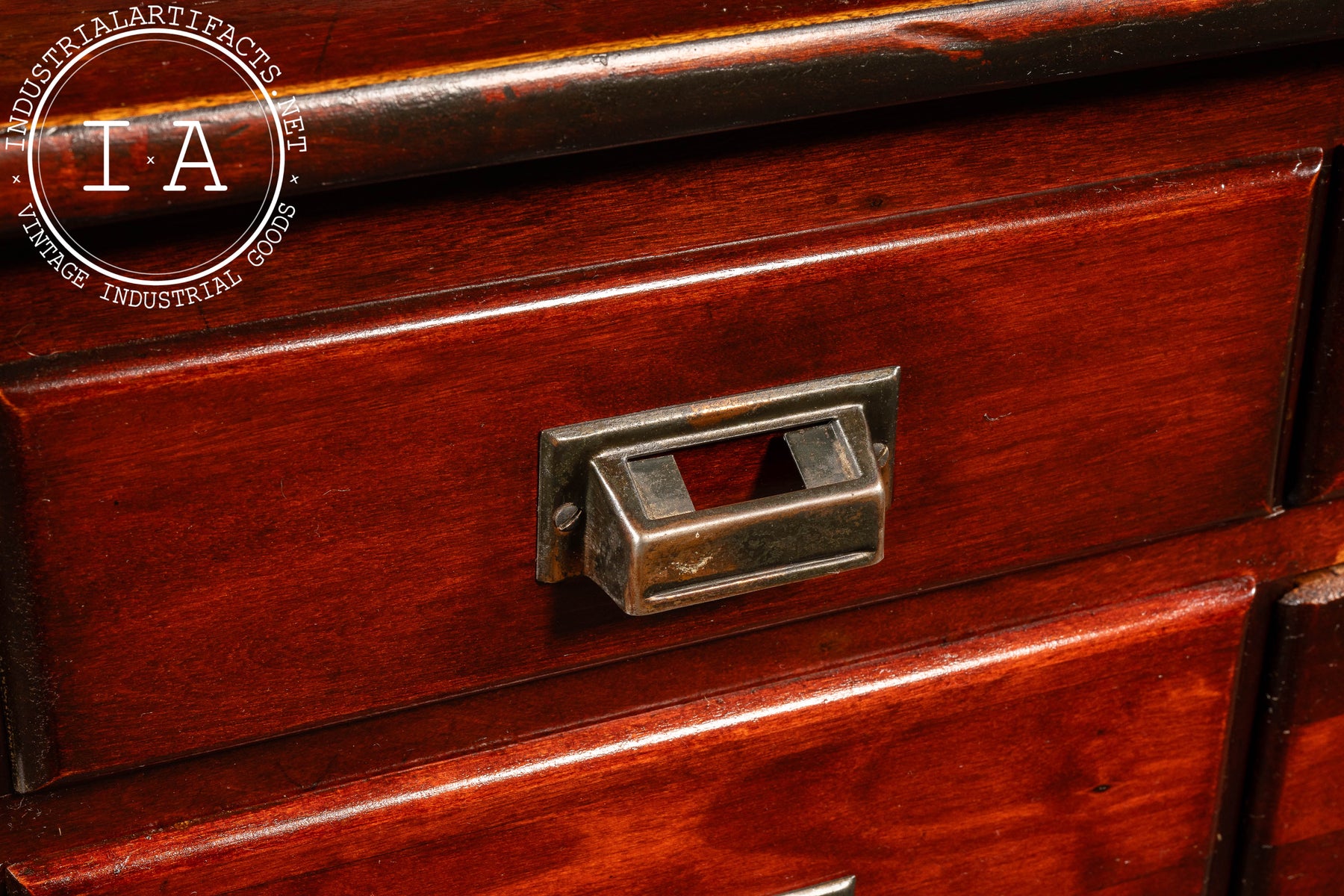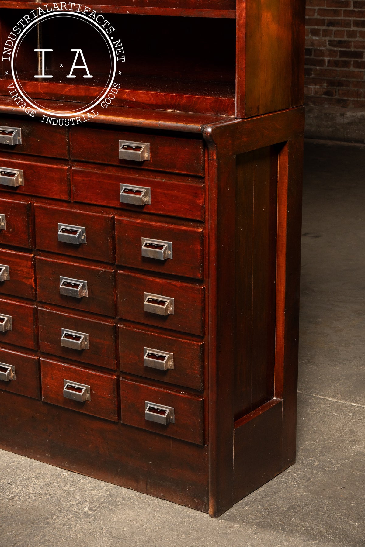 Monumental double-apothecary cabinet built in hardwood with its original deep oxblood-mahogany stain and steel cardholder pulls. The upper sections feature full-width adjustable shelving on metal standards, forming eight tall bays with clean sightlines and a continuous architectural top. Below, sixty-four drawers-arranged in tight, symmetrical banks-retain their original early-machine dovetails and straight-grain drawer bottoms. The cases meet at a central seam but present visually as a unified, overbuilt commercial fixture. Original gold Good Fixtures decals remain intact on both upper bases.