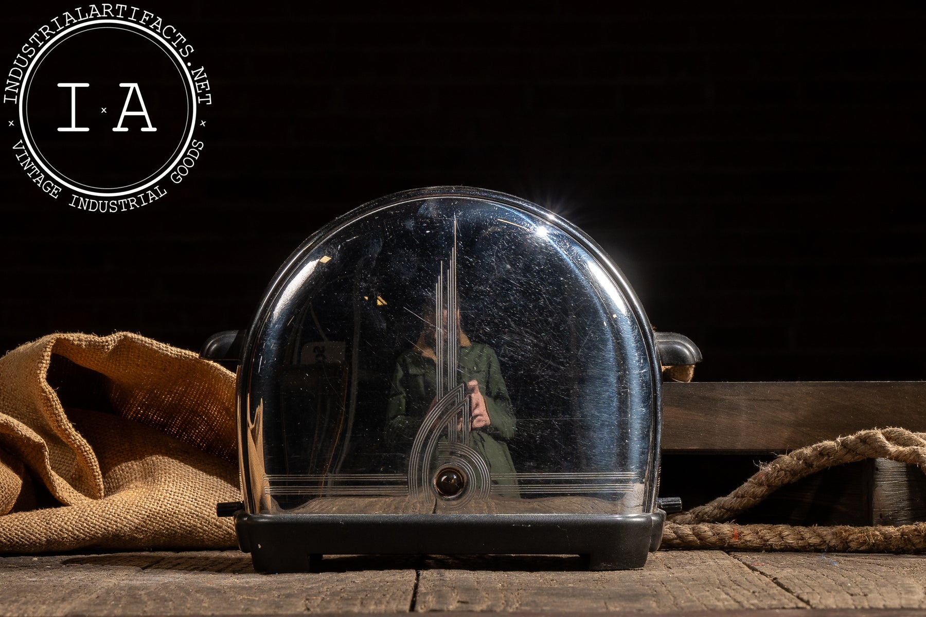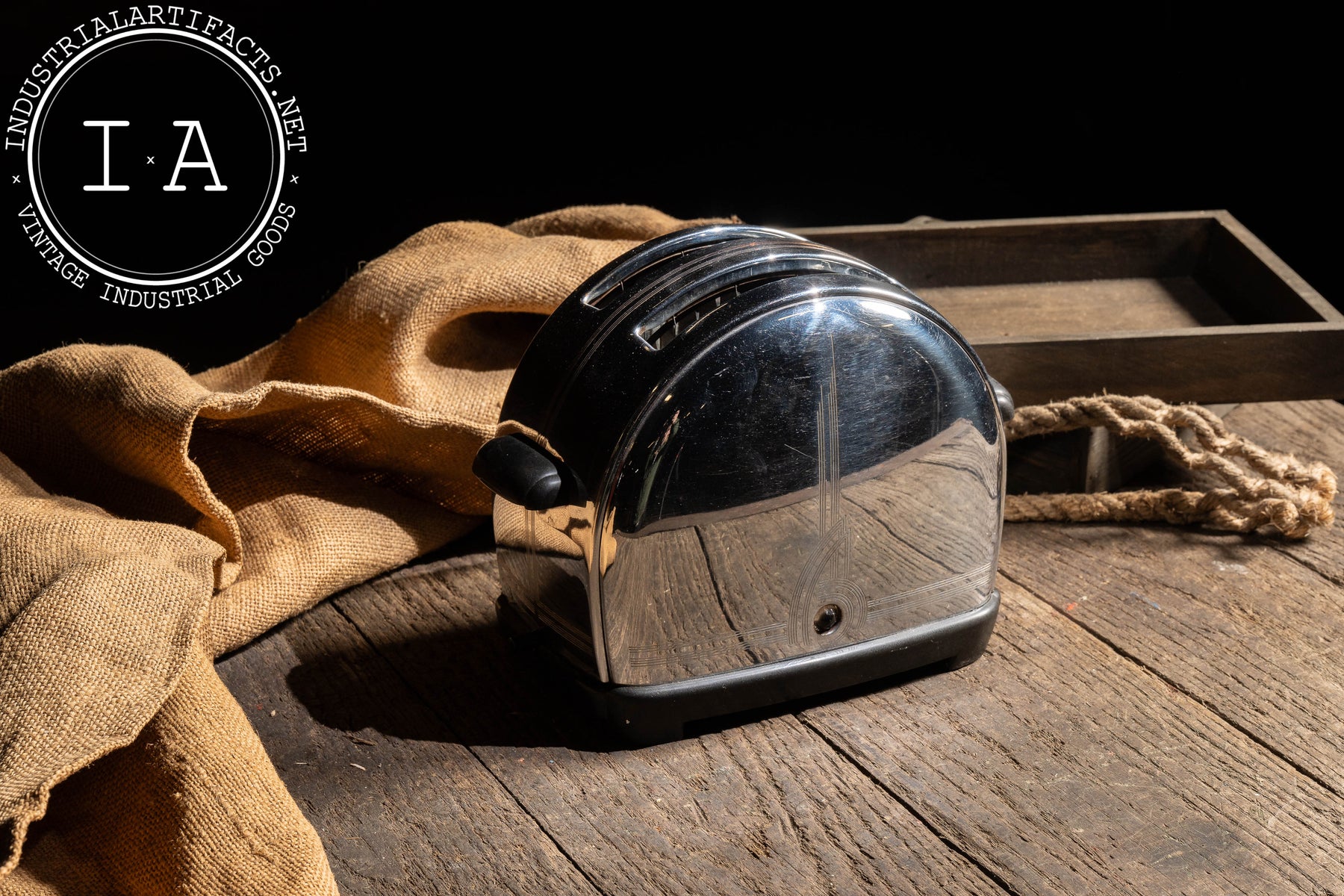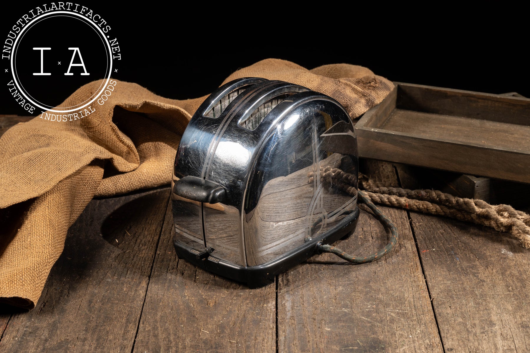Streamlined two-slice electric toaster executed in polished chrome with engraved Art Deco linework and a domed profile emblematic of early modern American appliance design. This Model T-9 features Sunbeam's automatic lowering mechanism and side-mounted control, with original black Bakelite accents and cloth-wrapped power cord intact. The engraved vertical motif on the body reinforces the machine-age aesthetic, balancing ornament with functional clarity. Compact and visually striking, the form reads as both countertop appliance and industrial design object.