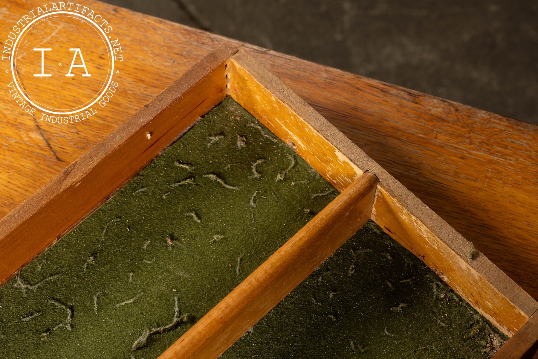 Exterior shows only minor surface wear with warm finish and visible grain. Interior drawers retain green felt lining, now worn and faded with age. Hardware and pulls remain functional, and all drawers operate smoothly.