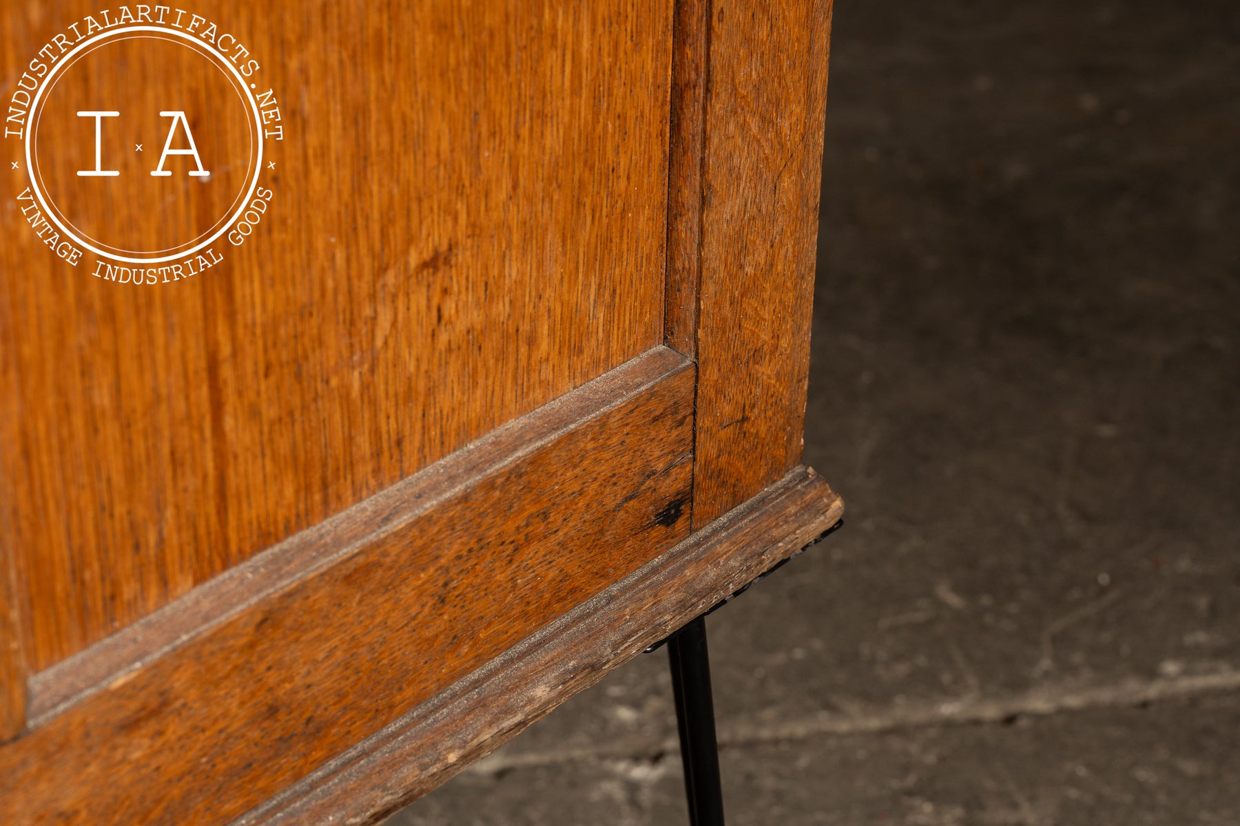 This piece reflects the utilitarian craftsmanship of early 20th-century American small-shop production, where oak casework and straightforward joinery emphasized durability. Later shop modifications, such as the welded steel hairpin legs, lend a mid-century modern edge while preserving its workshop heritage.