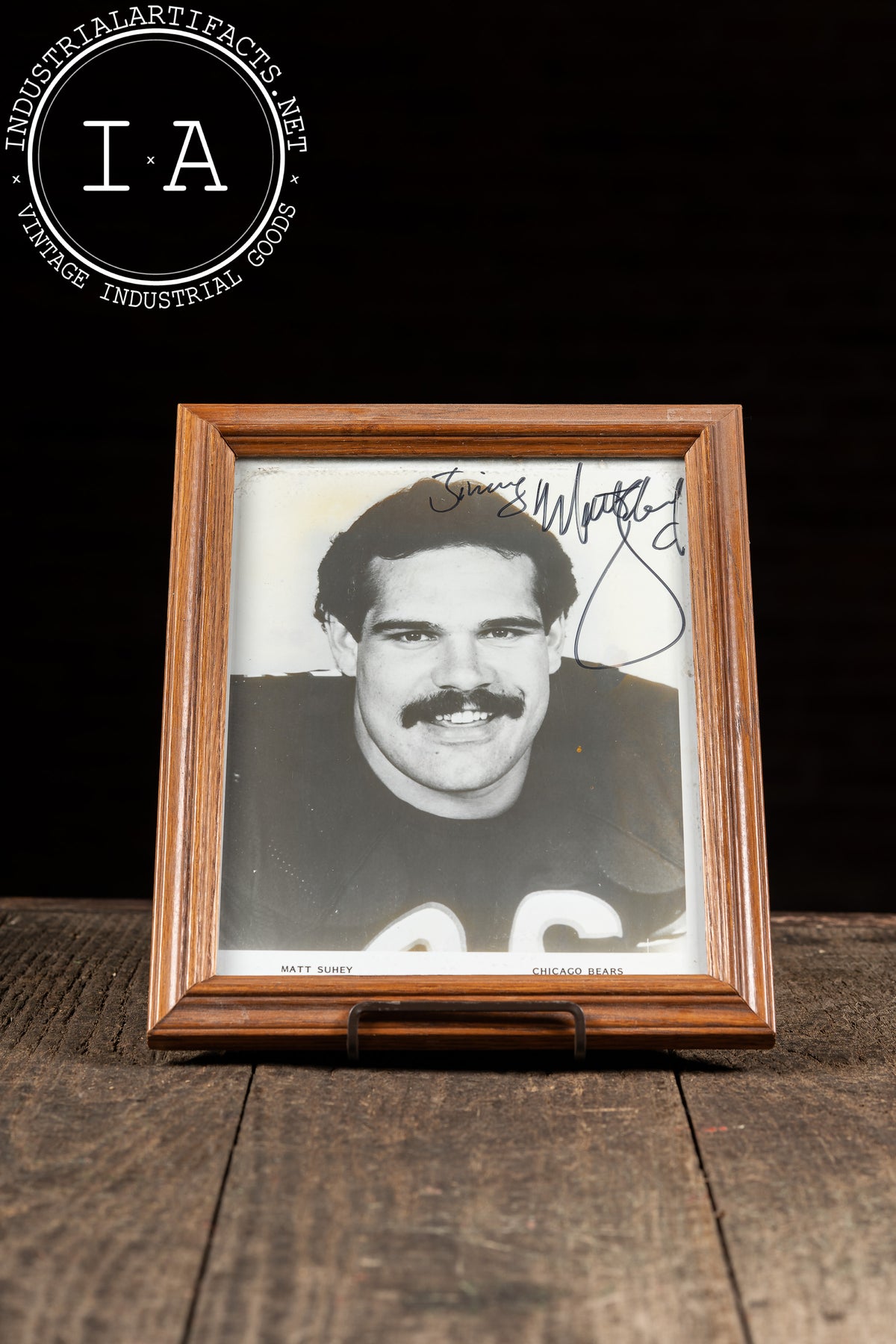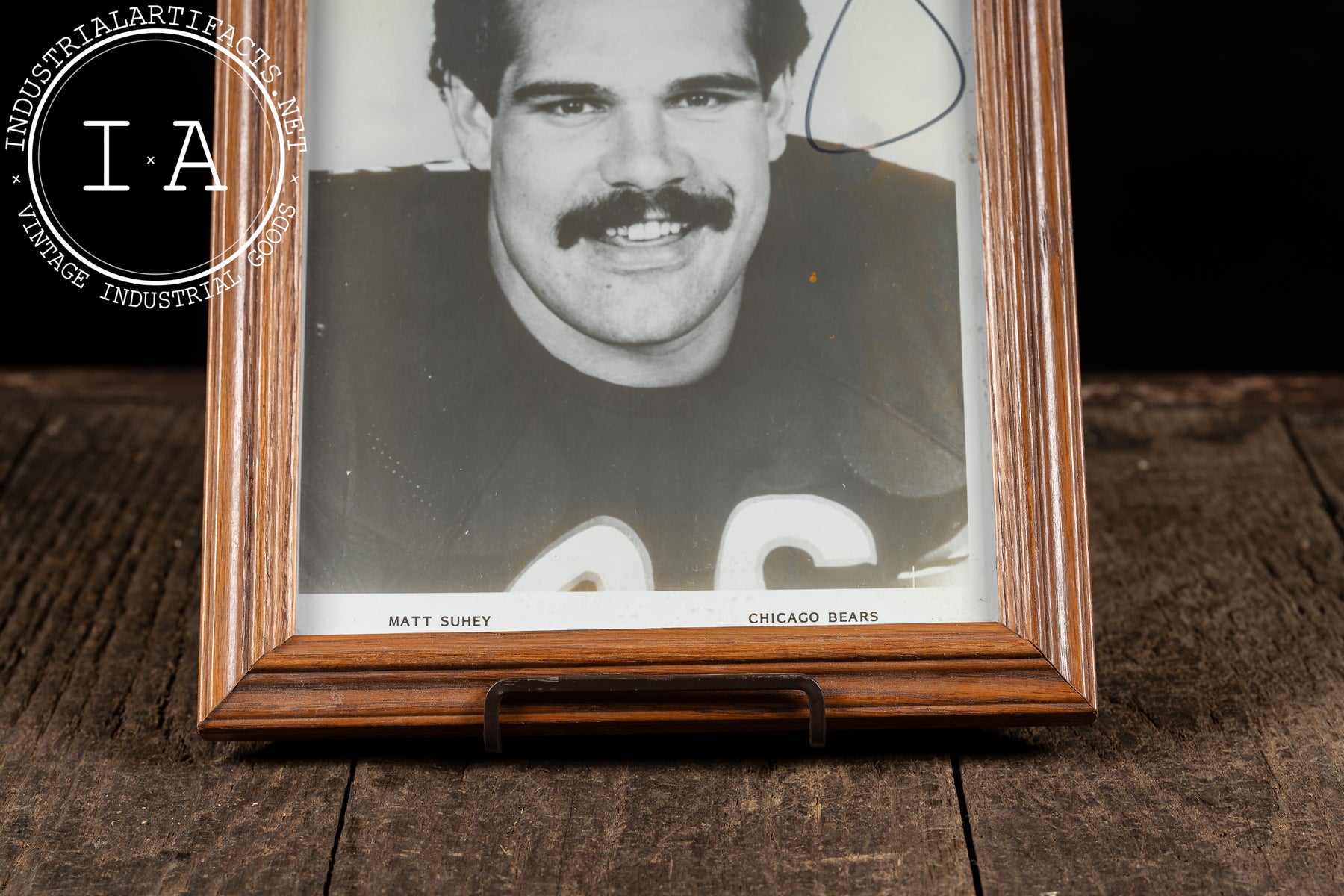 Black-and-white framed photograph of Matt Suhey, fullback for the Chicago Bears, autographed in black marker across the upper portion of the image. Suhey played for the Bears from 1980 to 1989 and was an integral part of their famed 1985 Super Bowl XX championship team. The photo is presented in a simple wood-grain frame typical of promotional or fan memorabilia of the period.