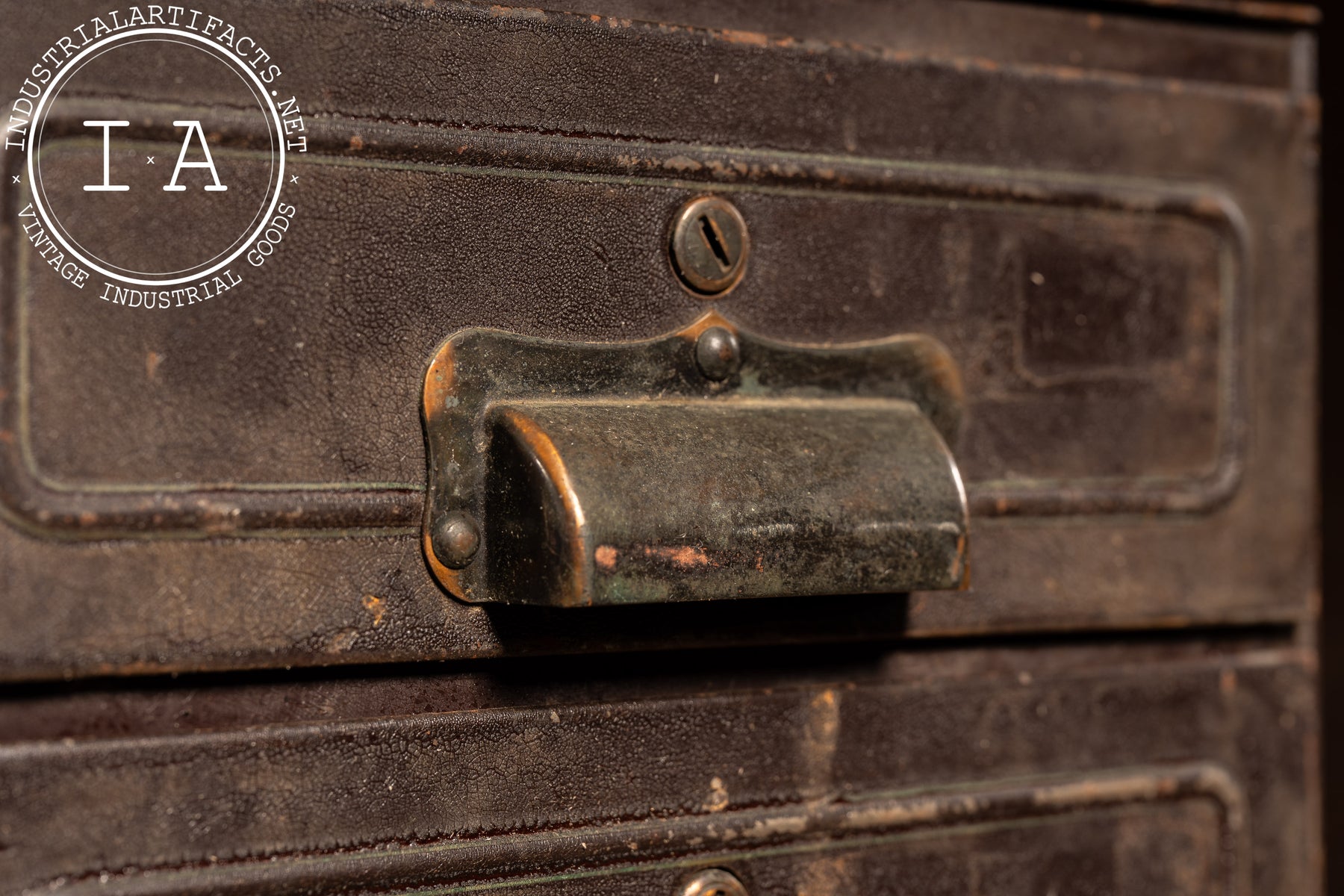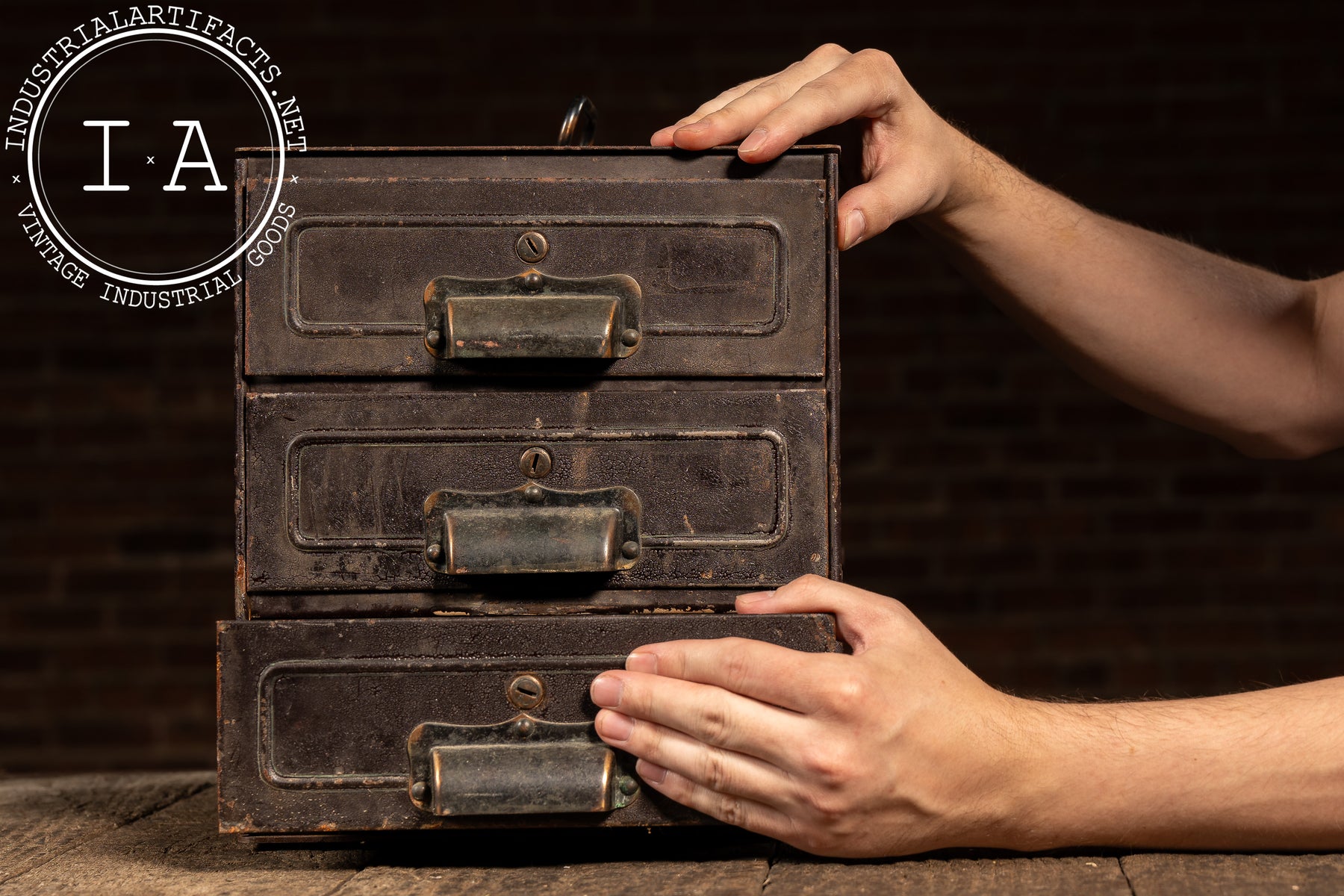 Inside, the box houses three sliding steel drawers, each fitted with a heavy rolled-steel pull. The pulls retain much of their original japanned finish, offering a deep, glossy contrast against the matte, time-worn steel of the cabinet. Recessed drawer fronts with molded borders give the strongbox a utilitarian yet intentionally structured appearance.