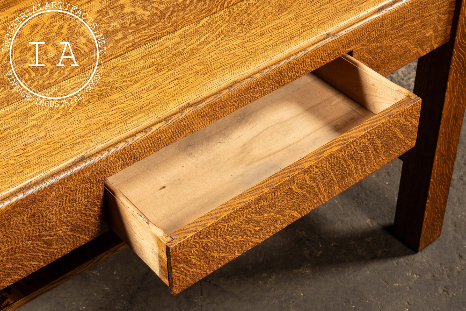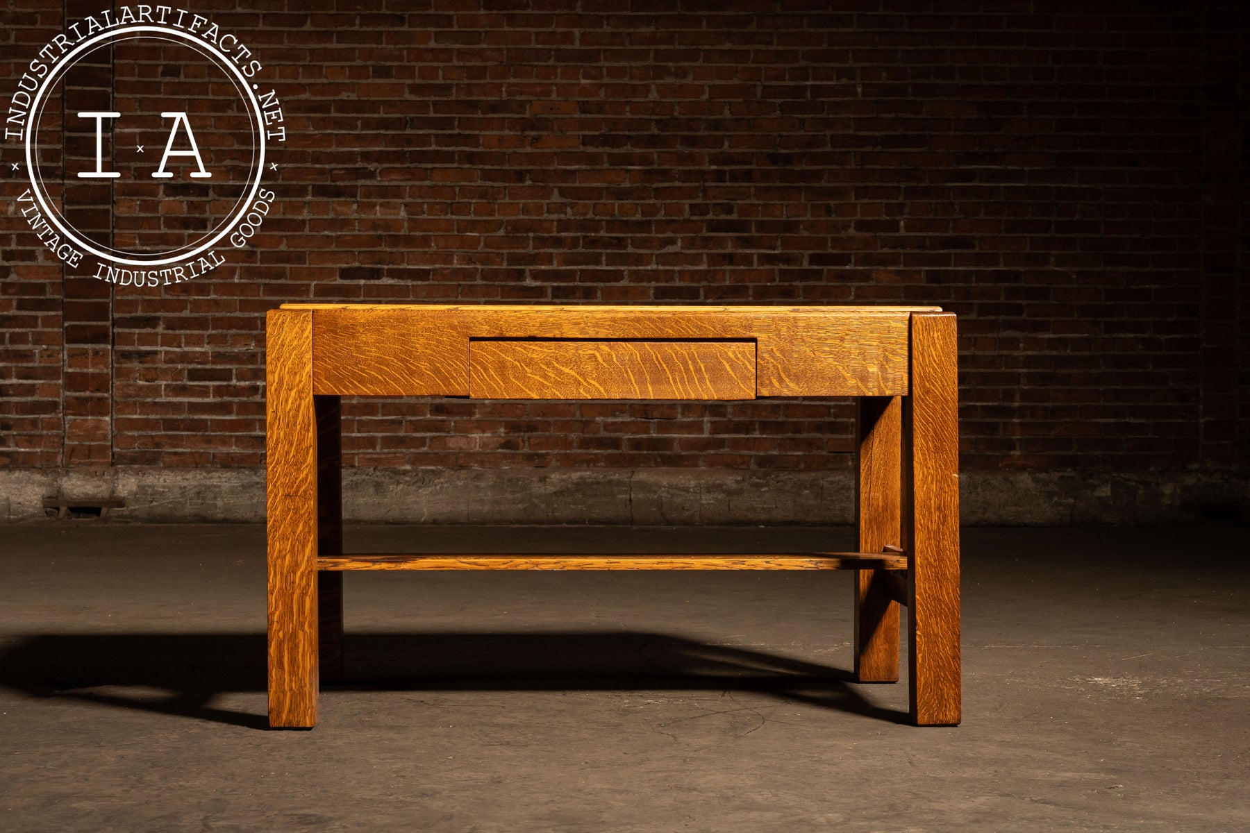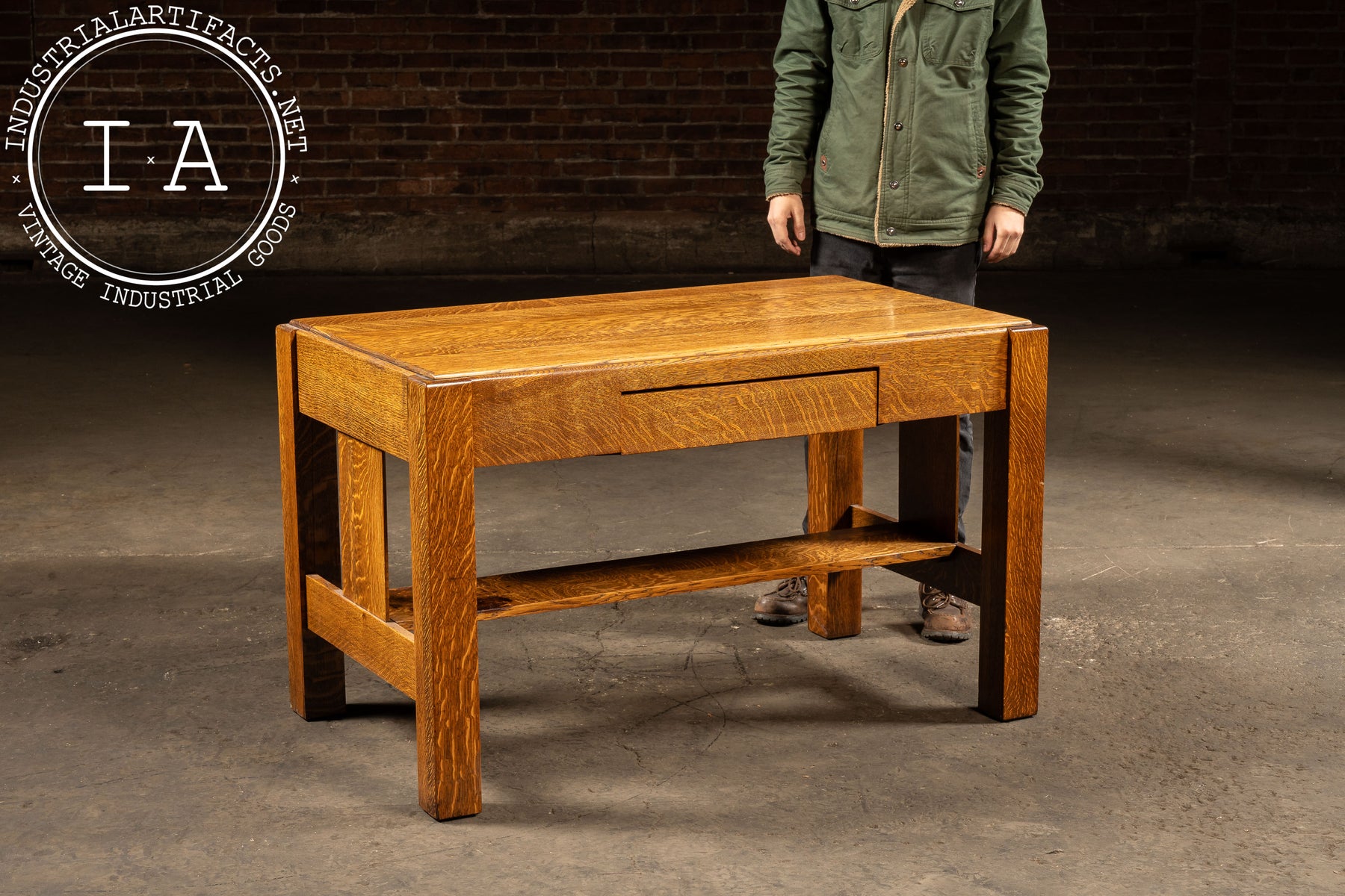 Solid oak coffee table executed in the Mission / Arts & Crafts tradition, defined by rectilinear proportions, exposed joinery, and a disciplined emphasis on material over ornament. The rectangular top displays pronounced oak grain, supported by stout square legs connected with full-width stretchers and a fixed lower shelf that adds both visual weight and utility. A single drawer is discreetly integrated into the apron, featuring clean edges and traditional construction that reinforces the table's workmanlike character. Every element reflects the Arts & Crafts ethos-form follows function, with craftsmanship left intentionally visible.