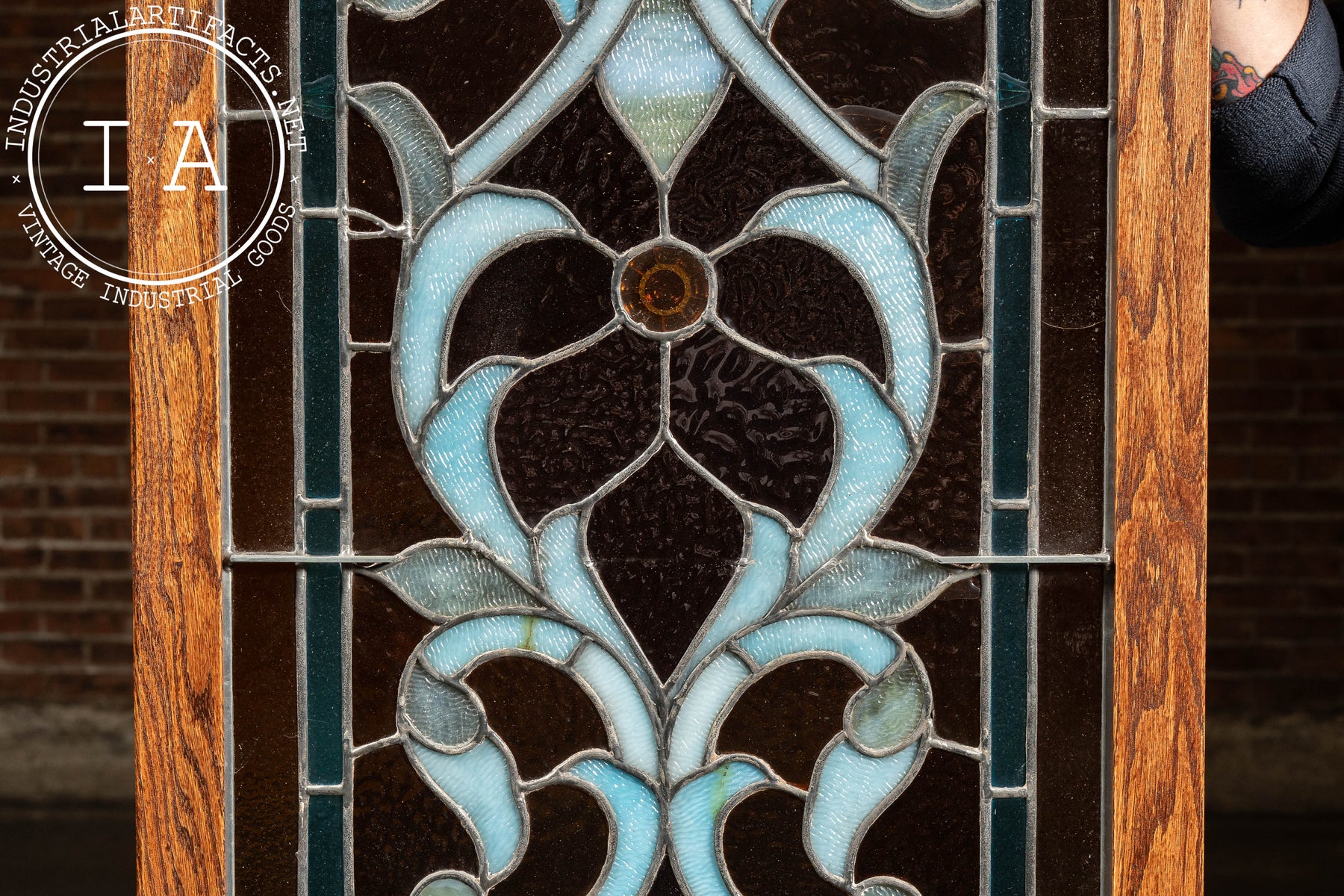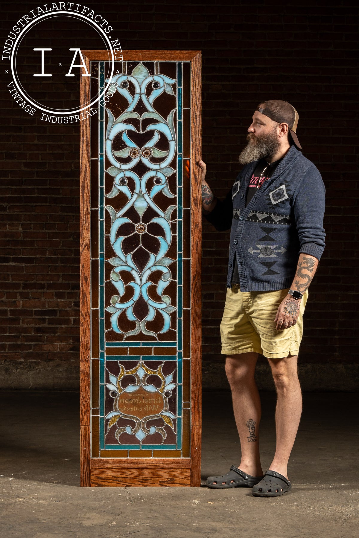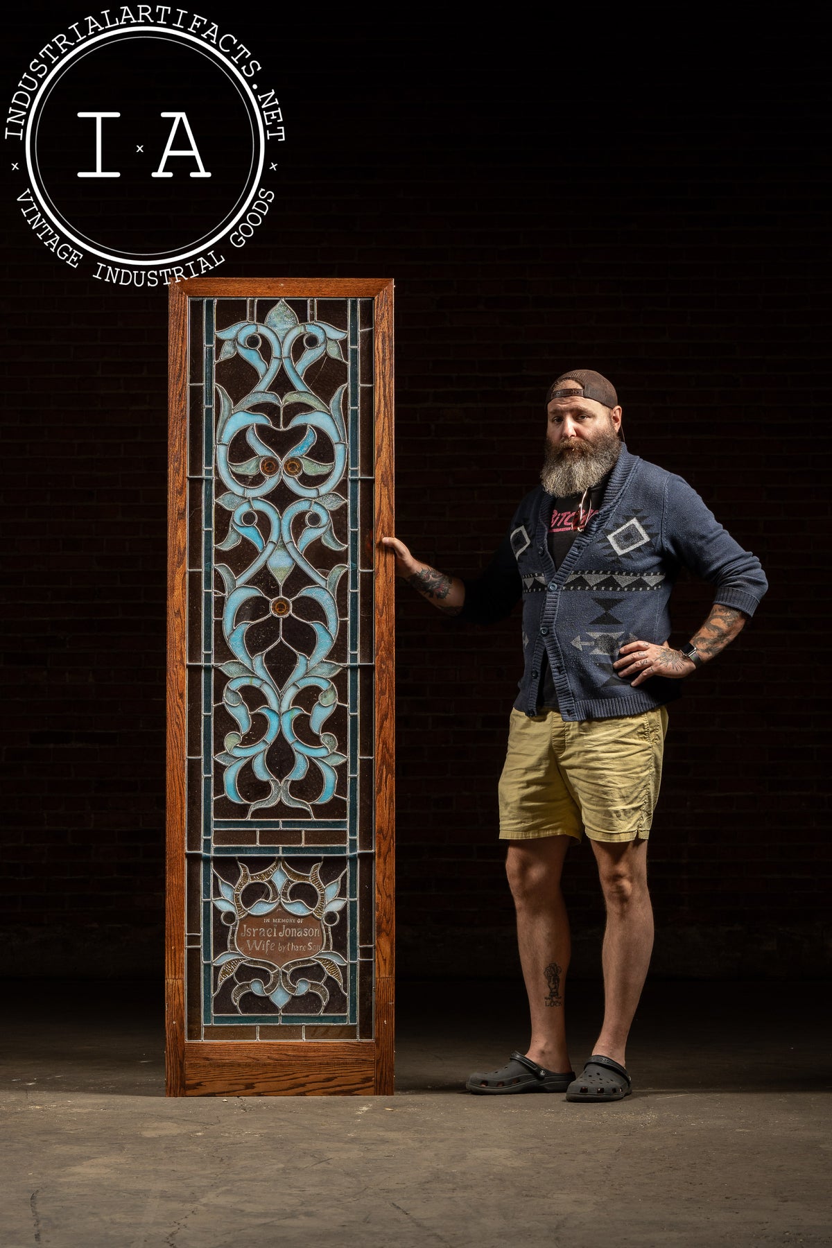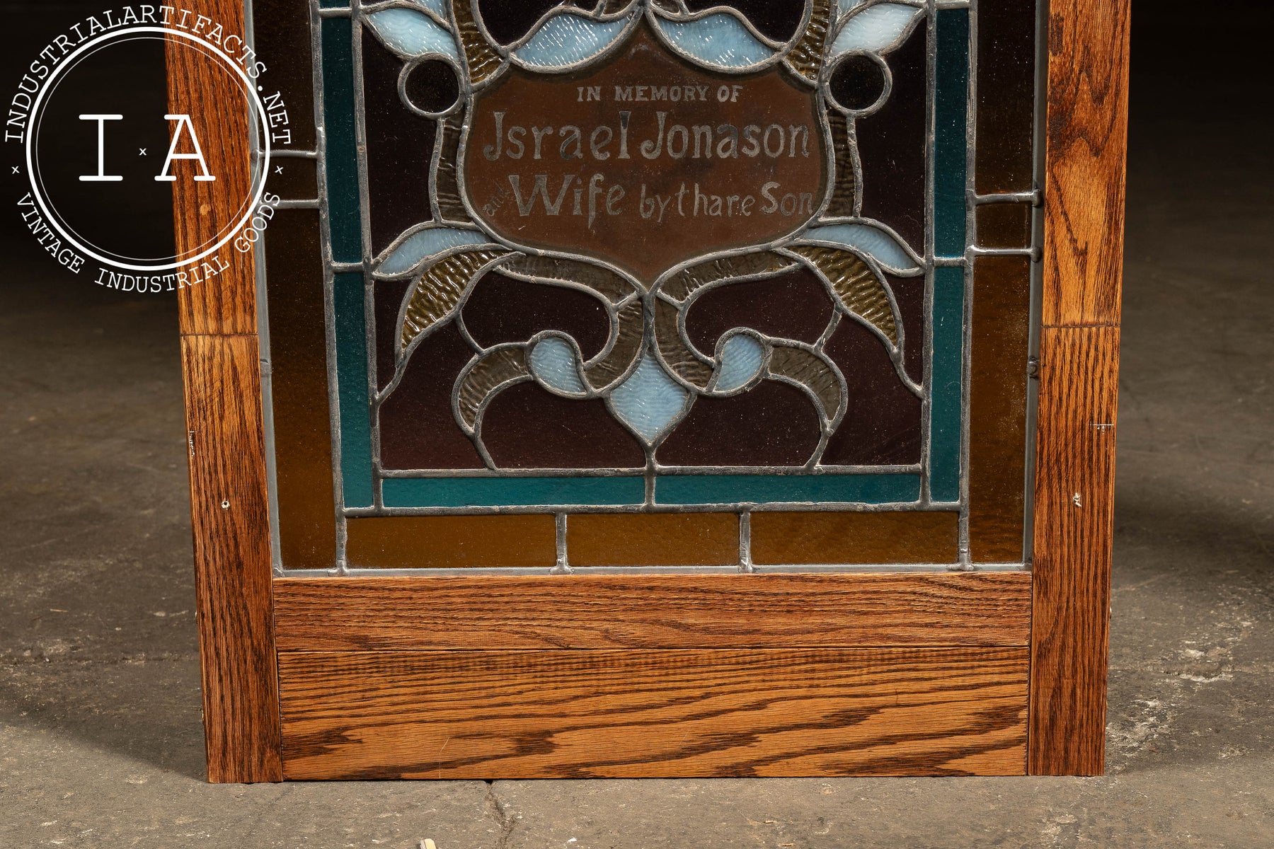 Tall oak-framed, leaded opalescent window in layered umber, teal, and ice-blue glasses with stylized foliate tracery and roundels. The lower cartouche reads: "In memory of Israel Jonason & Wife by thare Son," a striking bit of vernacular spelling preserved in glass.