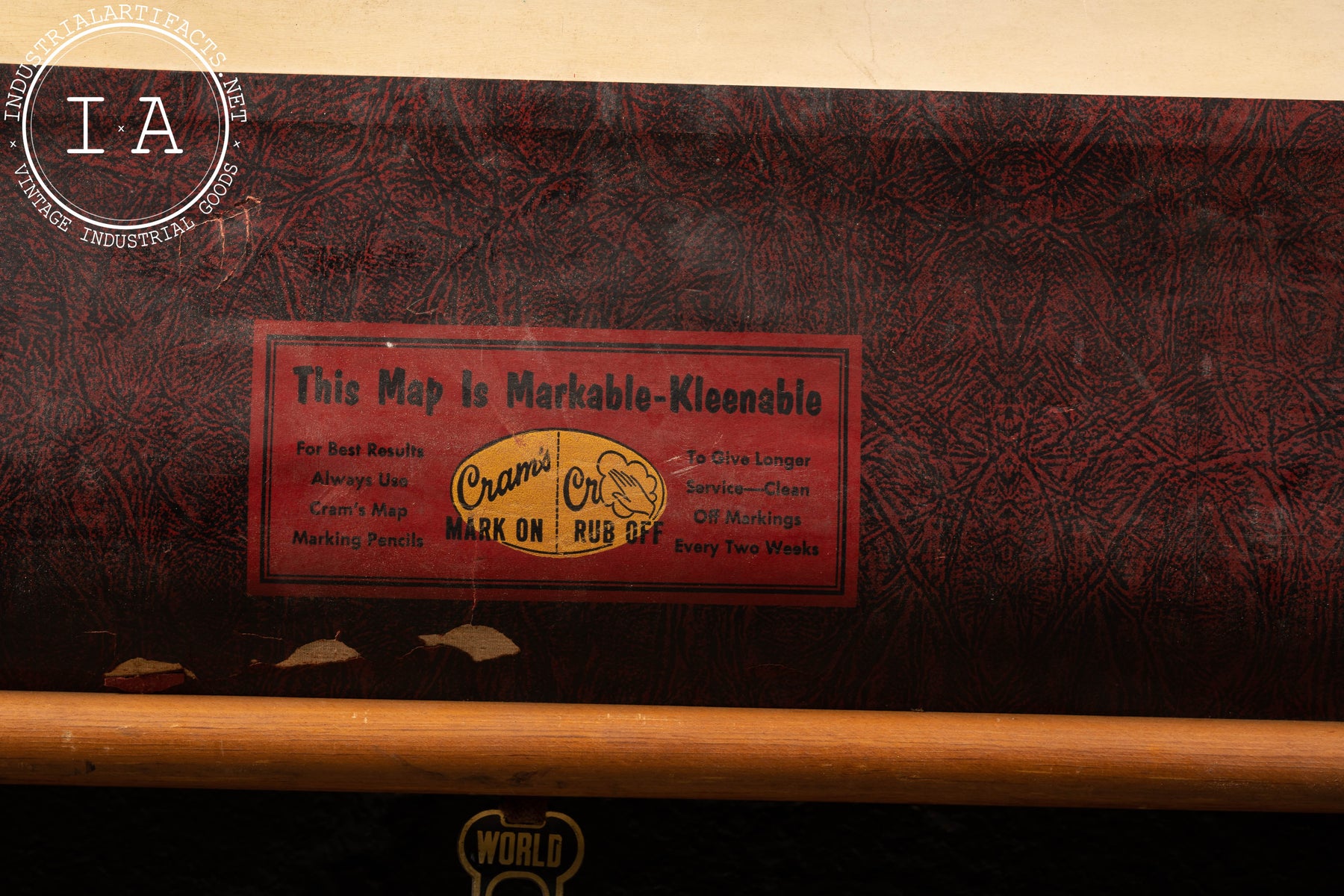 The pull down map is in fantastic shape with minor discoloration in spots along the bottom of the map, some wearing on the edges, and some missing spots around the very bottom below the map. There are small creases and bends across the piece, indicative of regular usage. It also comes with the "Markable-Kleenable" seal which says the product could be marked up using Cram''s Map Marking Pencils, and be wiped off without damaging the original material. Please refer to photos for condition and details.