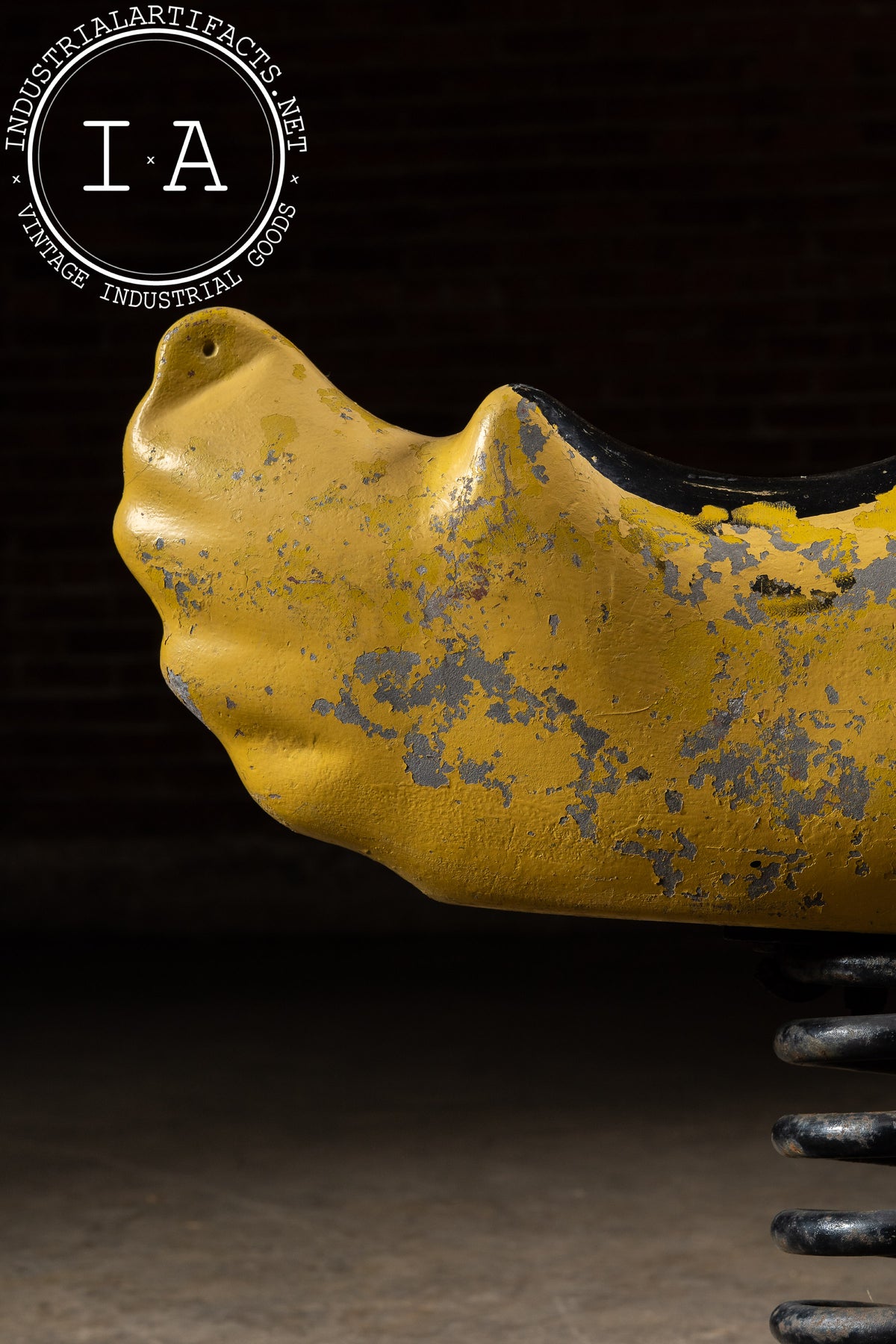 Produced by Mexico Forge of Reedsville, Pennsylvania-a mid-20th century manufacturer specializing in cast aluminum playground equipment-this duck spring rider reflects the rugged and imaginative designs that once populated public parks and schoolyards across America. Painted in bright yellow with a cheerful red bill, the form was built for durability and high use, anchored to the ground by a coiled steel spring. The molded aluminum body features incised details for the wings and tail, while the inset seat and original steel handles allowed for years of safe play.