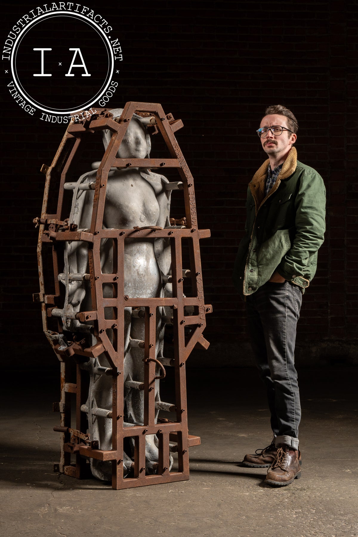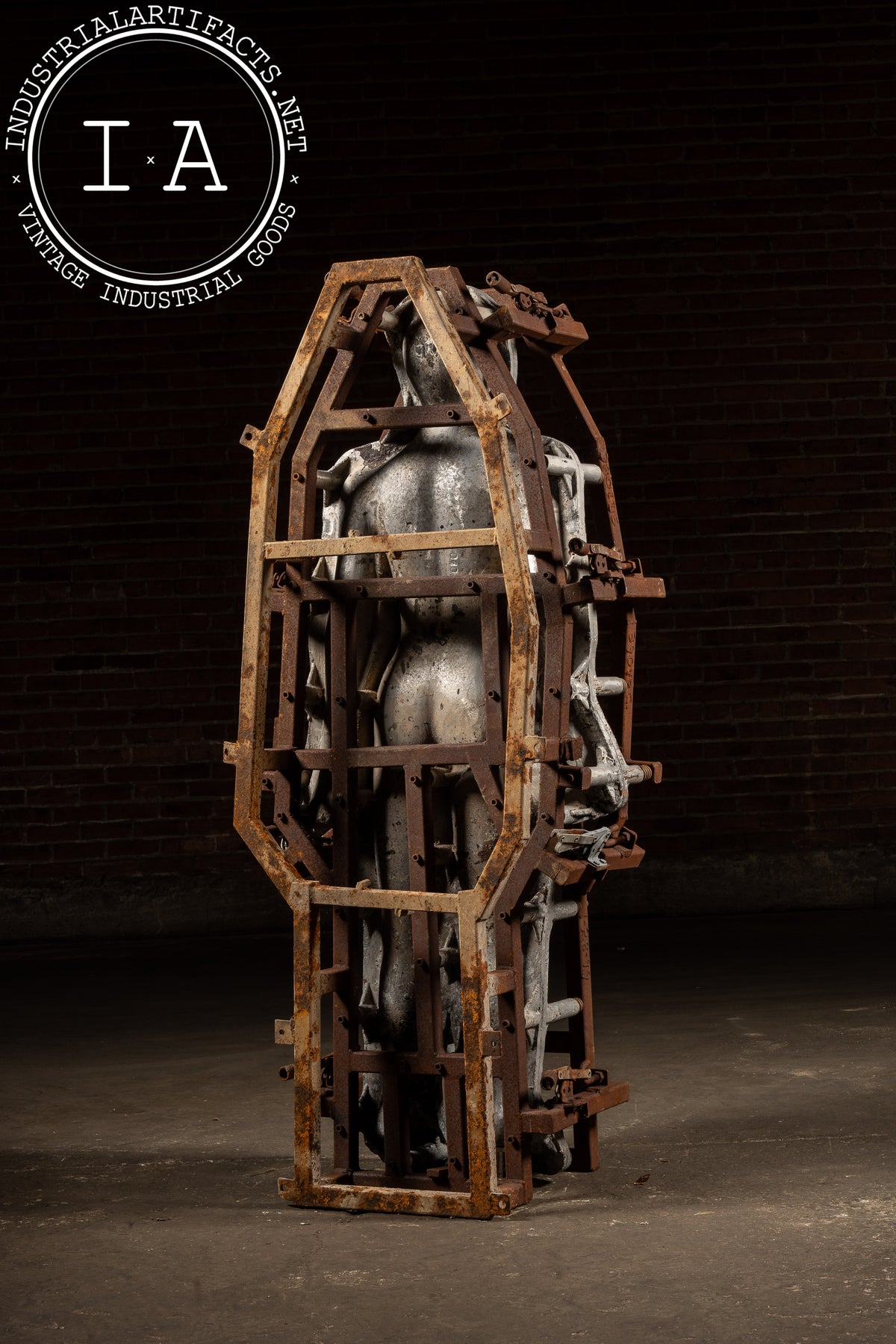 Large-scale industrial mold used in the production of early nursing and massage training manikins, consisting of a cast human form housed within a heavy steel clamping frame. The form depicts a full standing human figure with anatomically modeled musculature, intended for instructional use rather than display refinement (that particular item is spelled "mannequin"). The surrounding bolted frame functioned to hold mold sections under compression during casting or curing, with numerous threaded points, clamps, and alignment features visible throughout. The result is a striking convergence of medical education, mid-century industrial process, and sculptural form-where function dictated every line and surface.