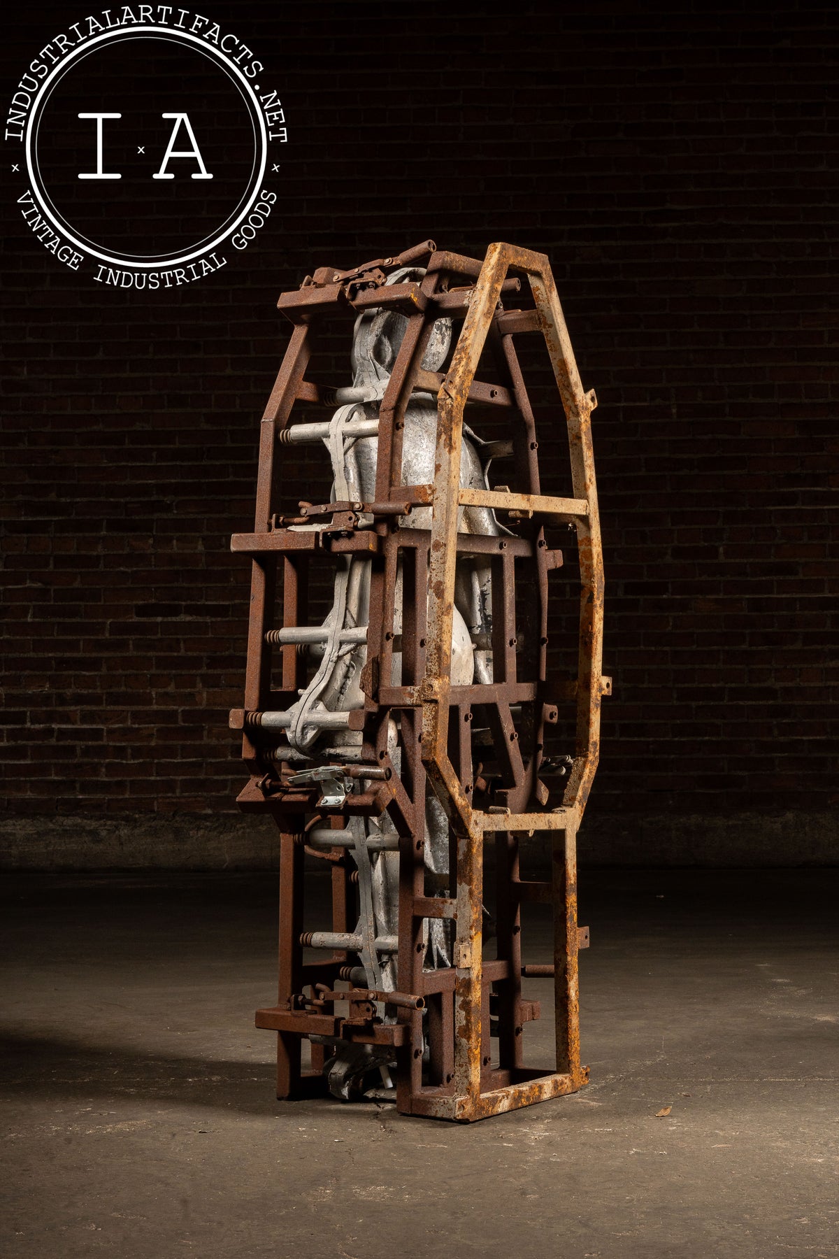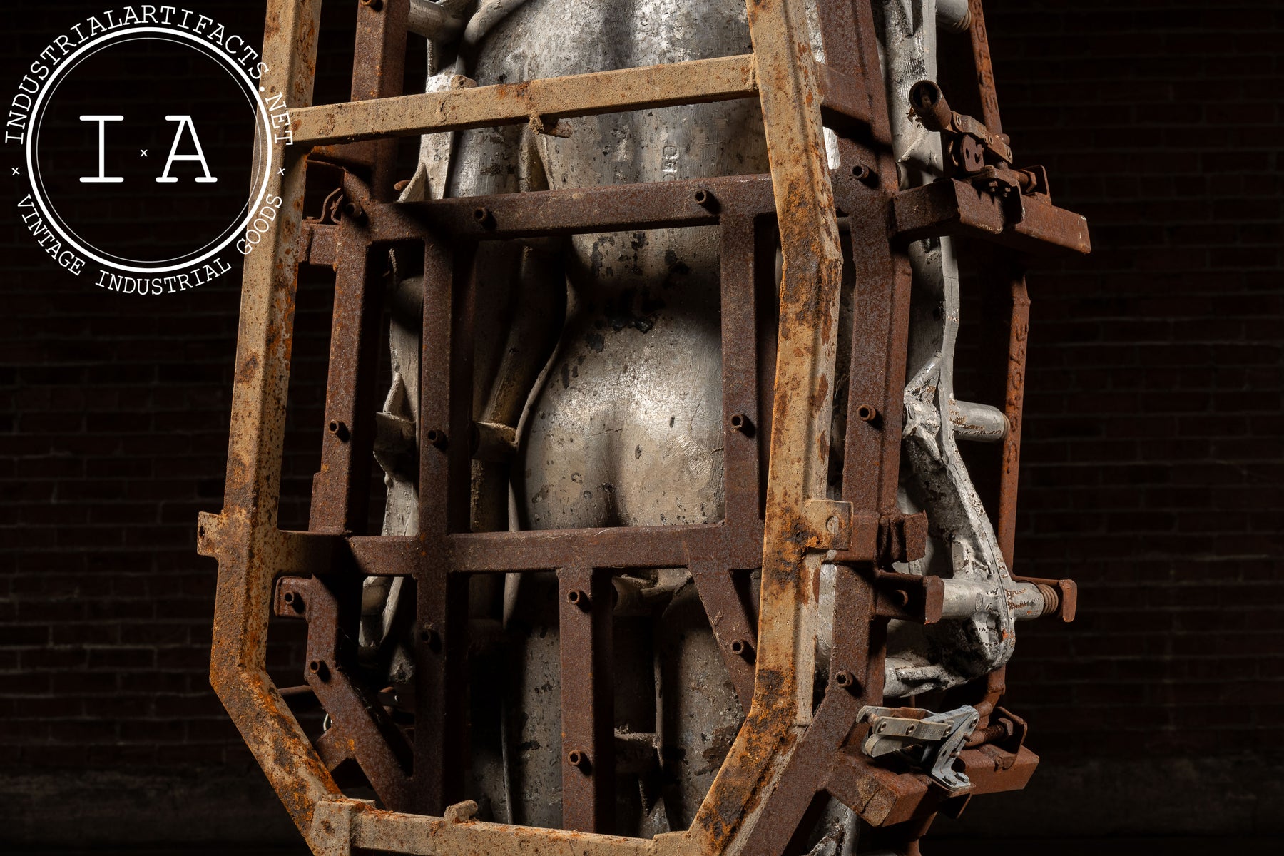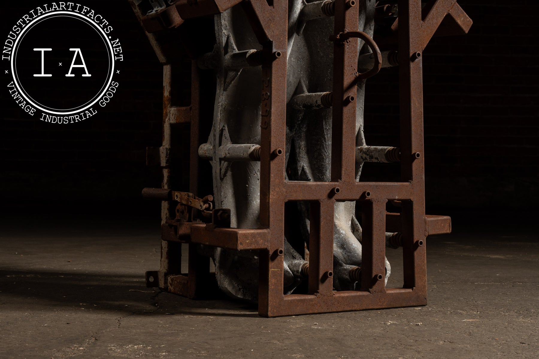 Shows extensive surface patina and oxidation to the steel frame, with rust present throughout consistent with age and industrial use. The molded form shows wear and surface variation from production handling. Structurally solid overall. The piece is extremely heavy; transport requires a dolly and at least two people.