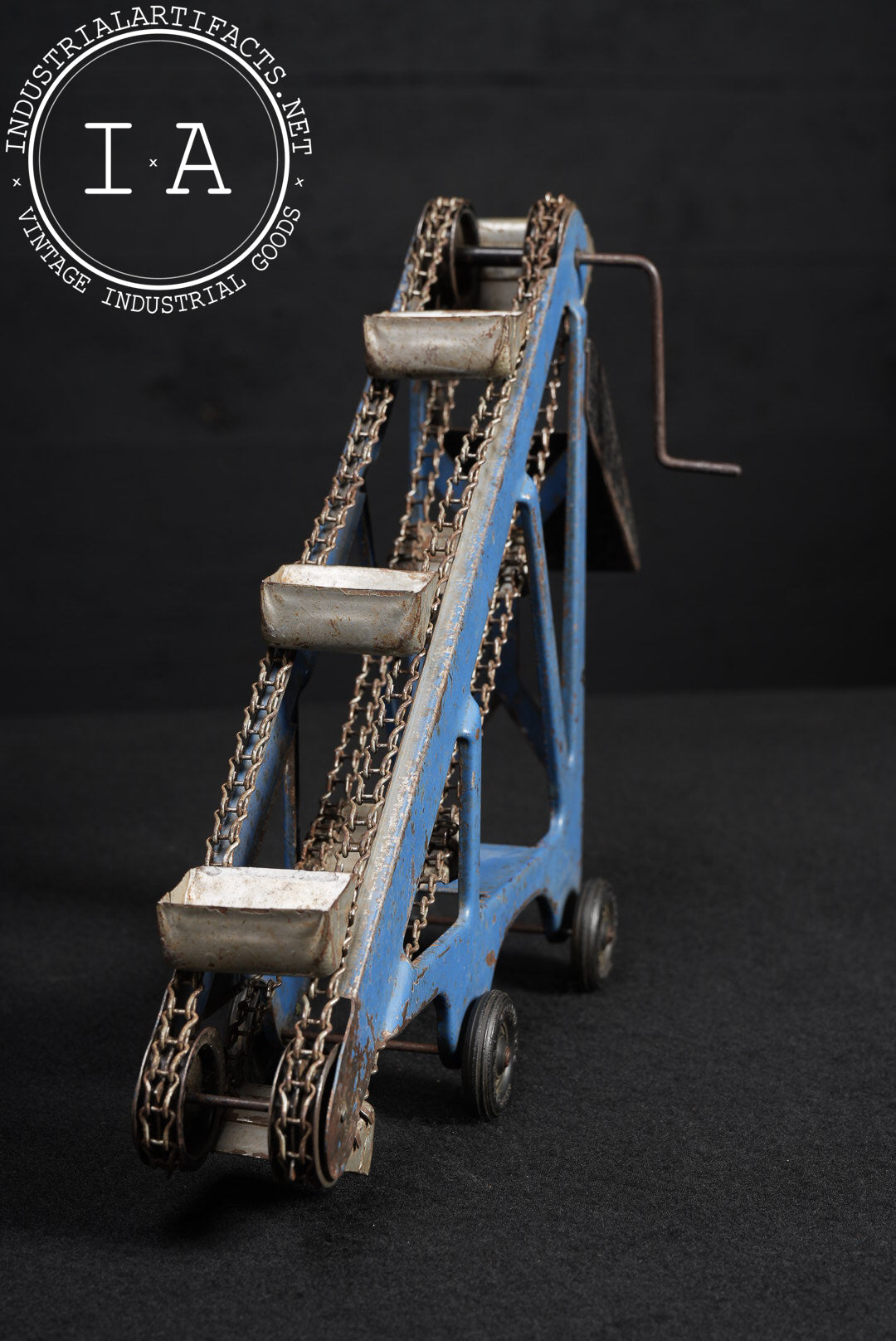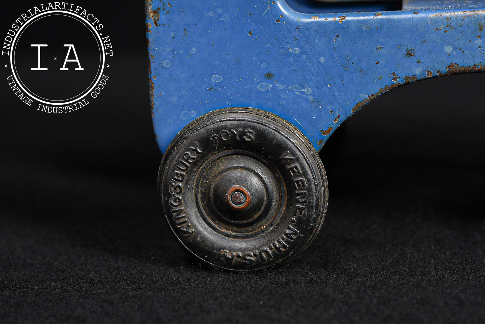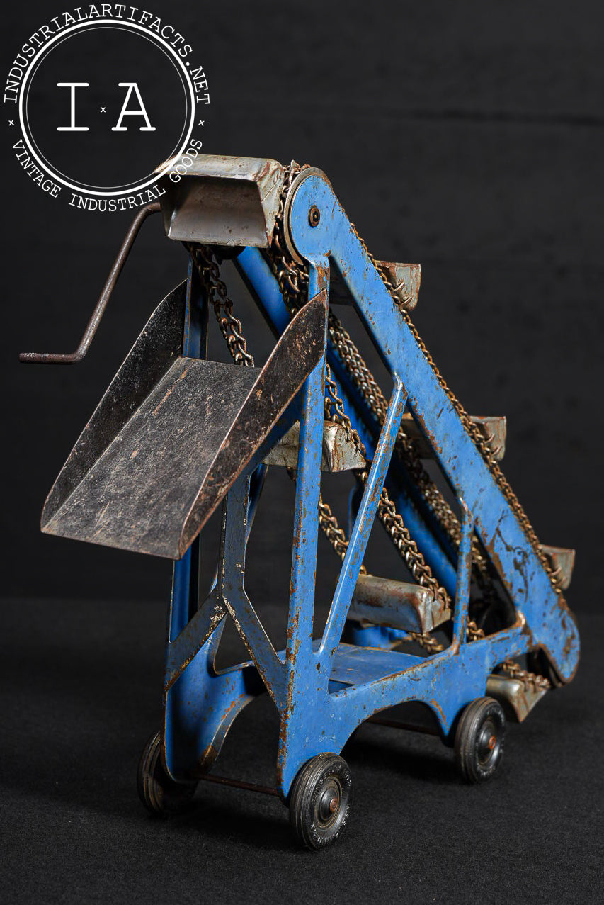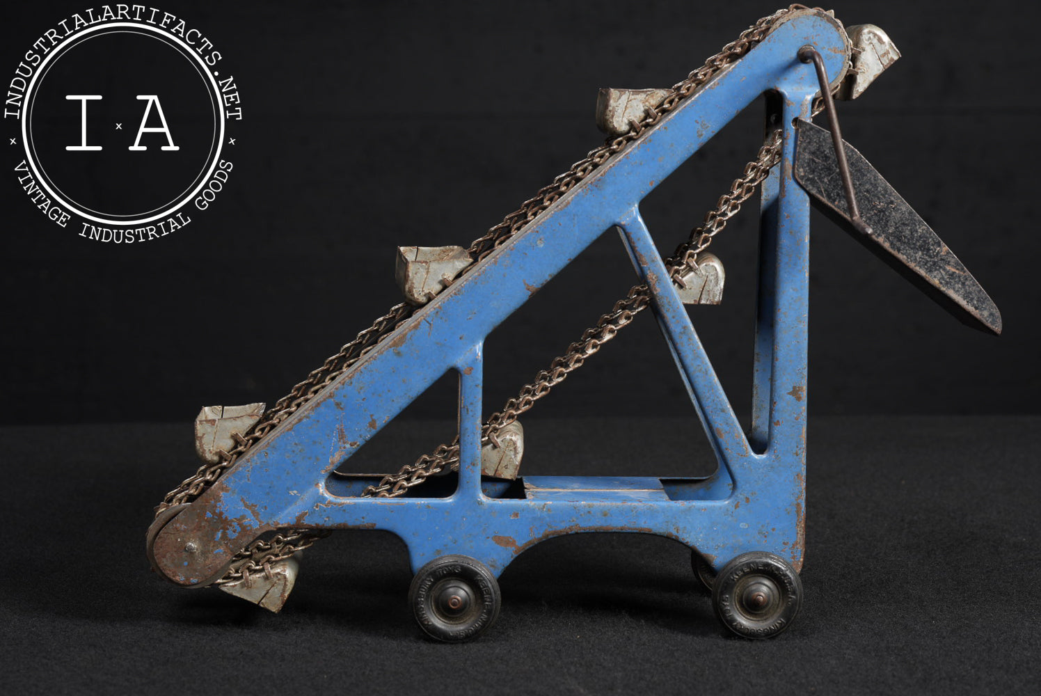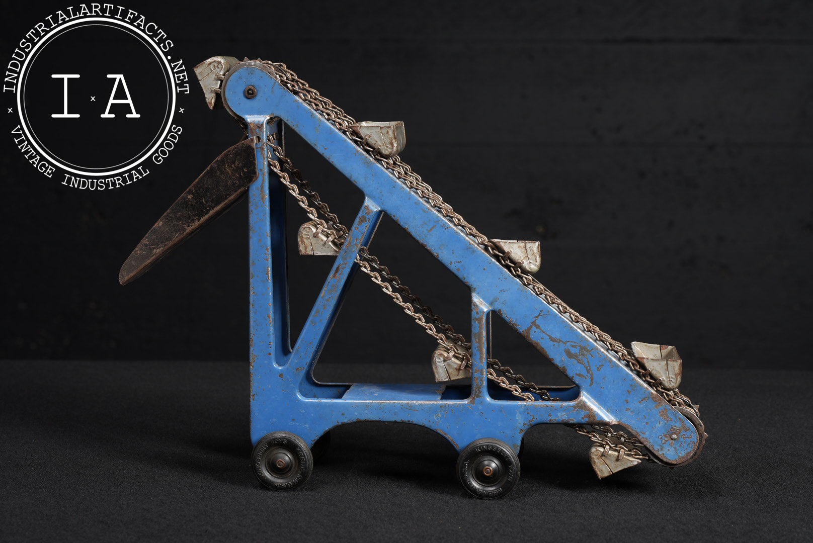 This example by Kingsbury Manufacturing reflects the company's signature pressed steel construction, known for producing sturdy, functional toys during the interwar period. The loader features a hand-crank chain drive that lifts and releases four pressed steel scoops, mimicking real industrial bucket loaders of the era. Original paint remains visible with scattered wear, and the toy rolls on four steel-rimmed wheels. A scarce survivor of early 20th-century American toy production.