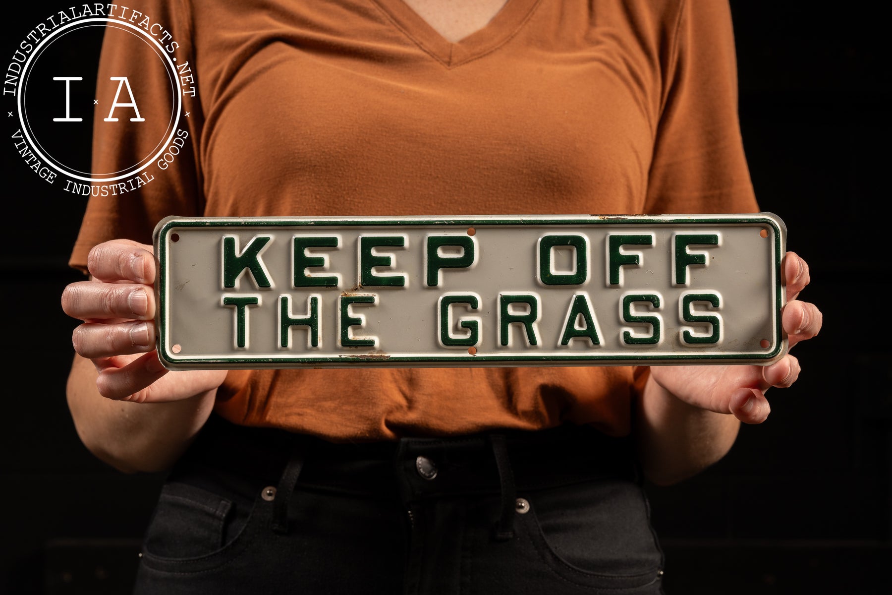 Embossed steel sign with raised green block lettering reading "KEEP OFF THE GRASS," finished in a light gray field with dark green lettering and border. The reverse shows the lettering in relief, emphasizing its pressed-metal construction. Mounting holes are present at the corners and along the centerline, indicating intended outdoor use on posts, fences, or railings where visibility and durability were essential.