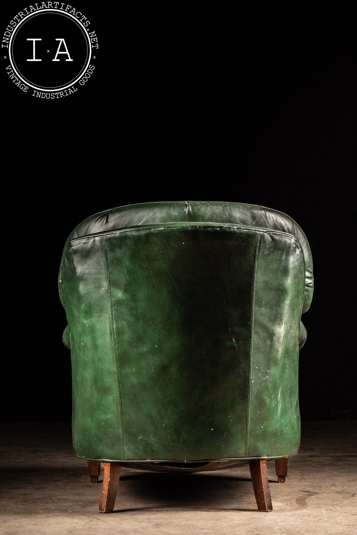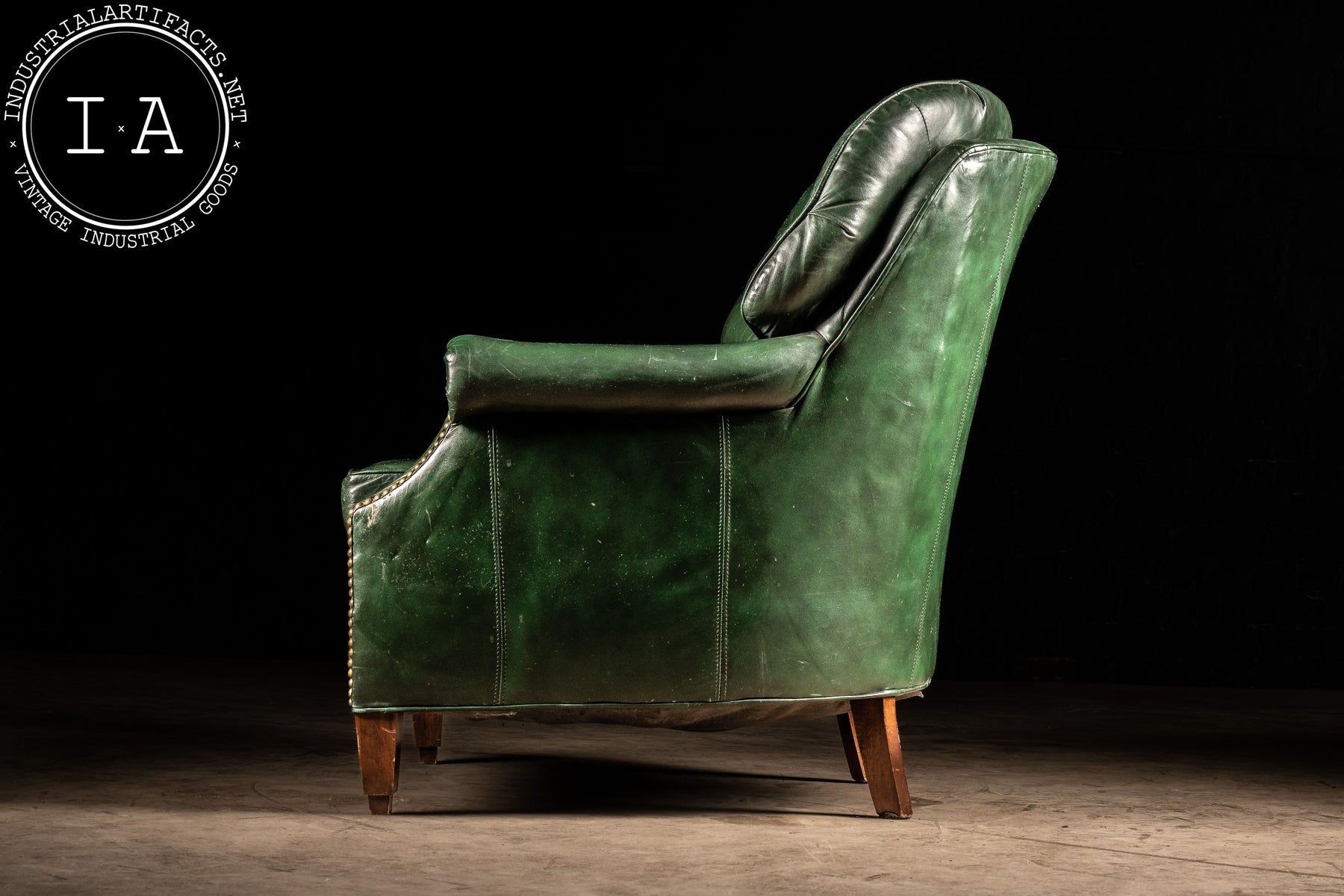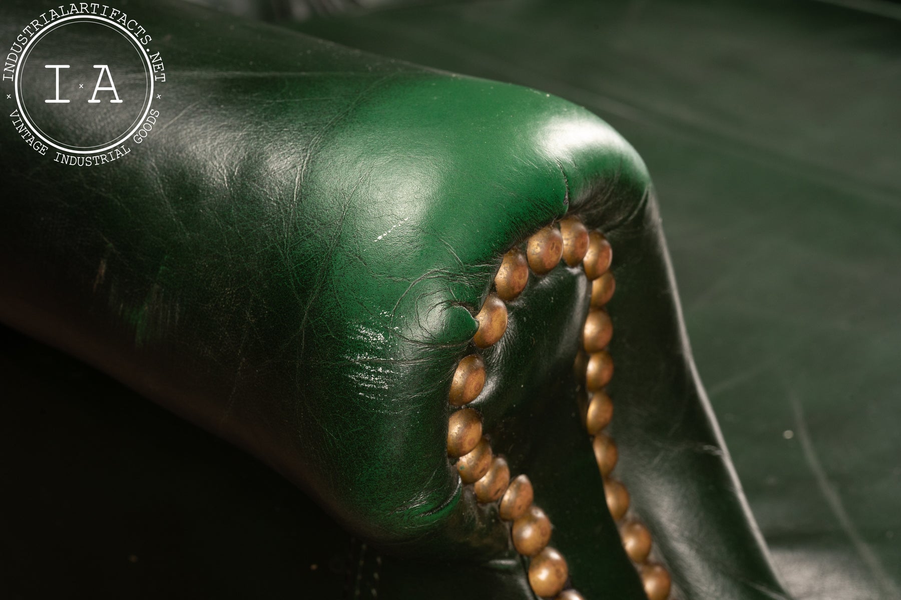 The green leather has developed a lived-in patina, carrying creases, scuffs, and areas of finish wear that mark its decades of service, including exhibiting some wear to the undersides of both pieces. Please refer to photos for condition and details.