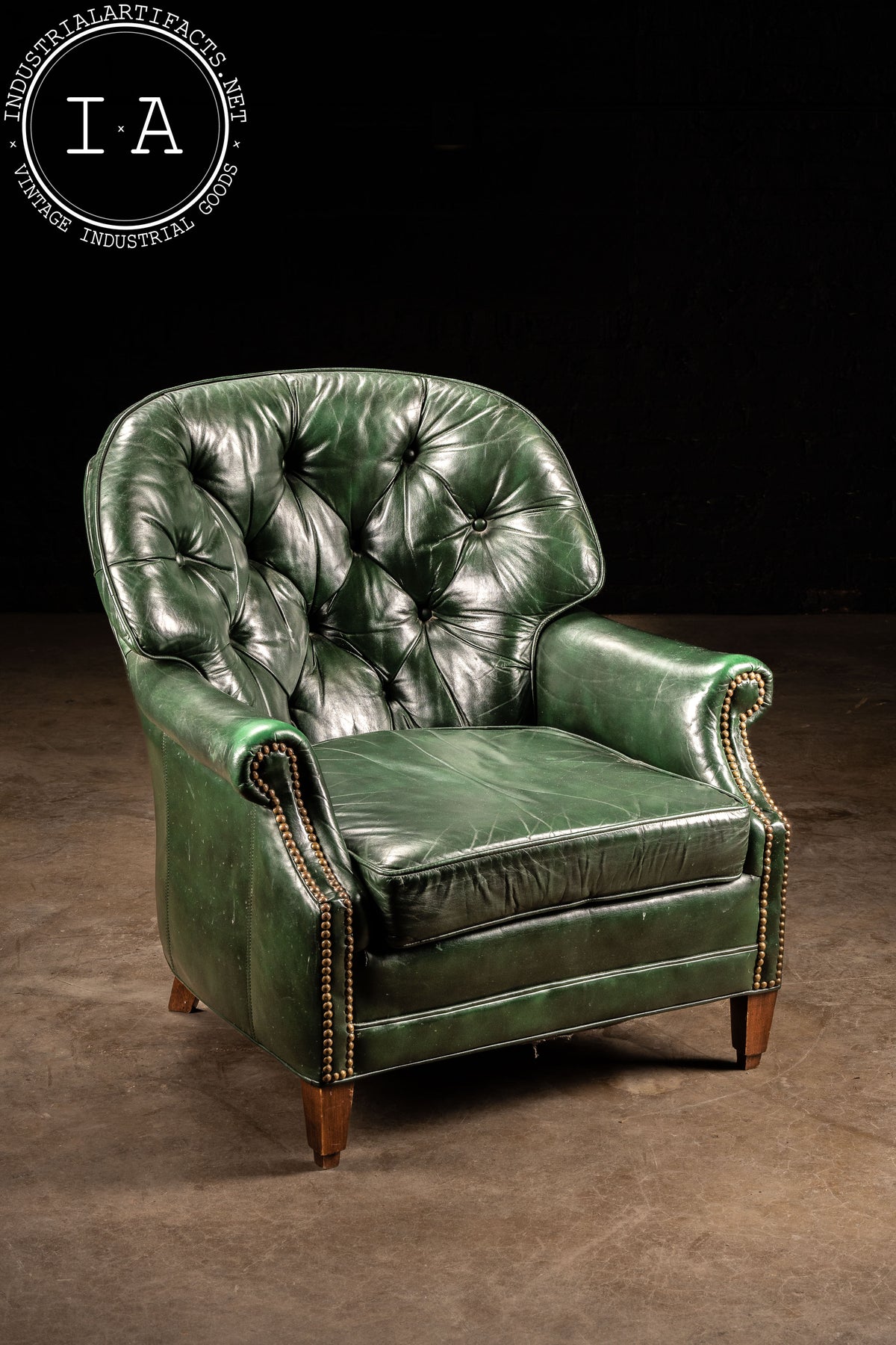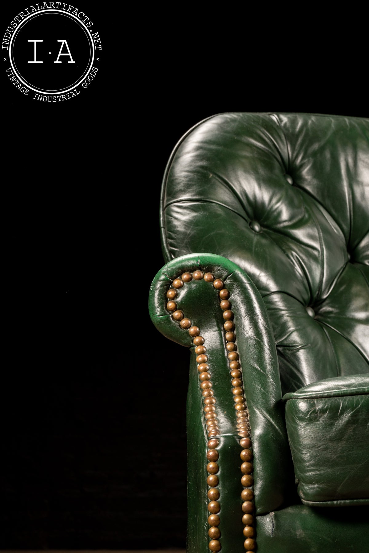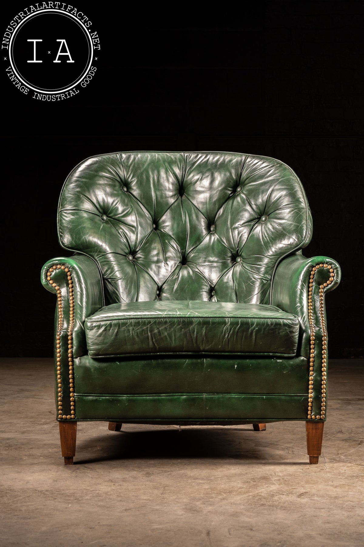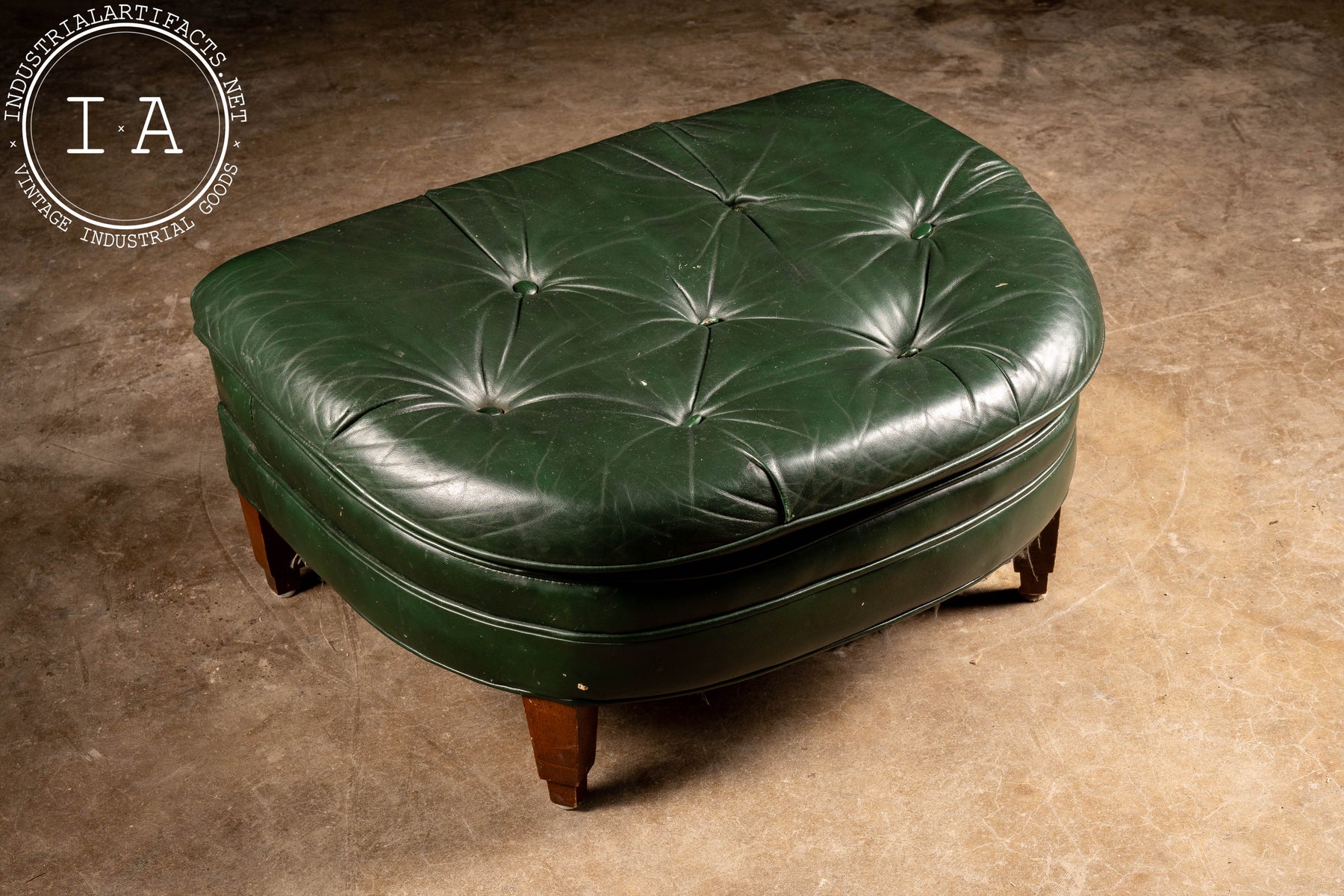 The green leather has developed a lived-in patina, carrying creases, scuffs, and areas of finish wear that mark its decades of service, including exhibiting some wear to the undersides of both pieces. Please refer to photos for condition and details.
